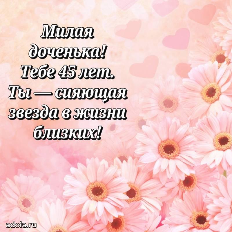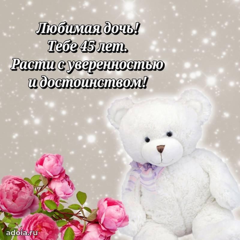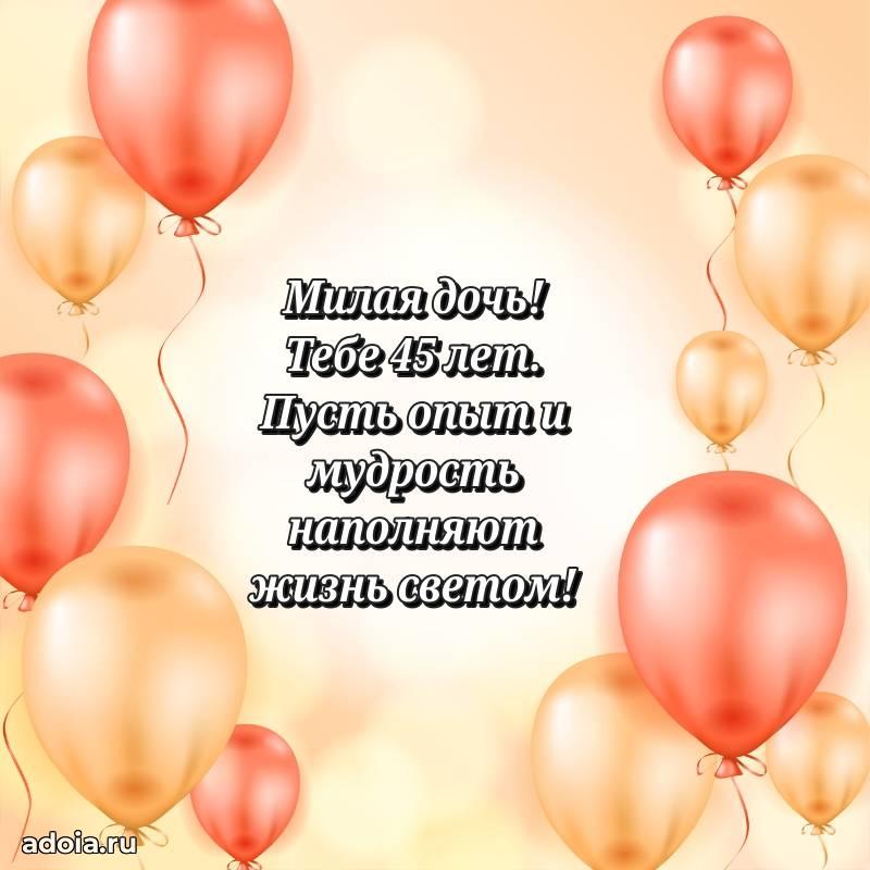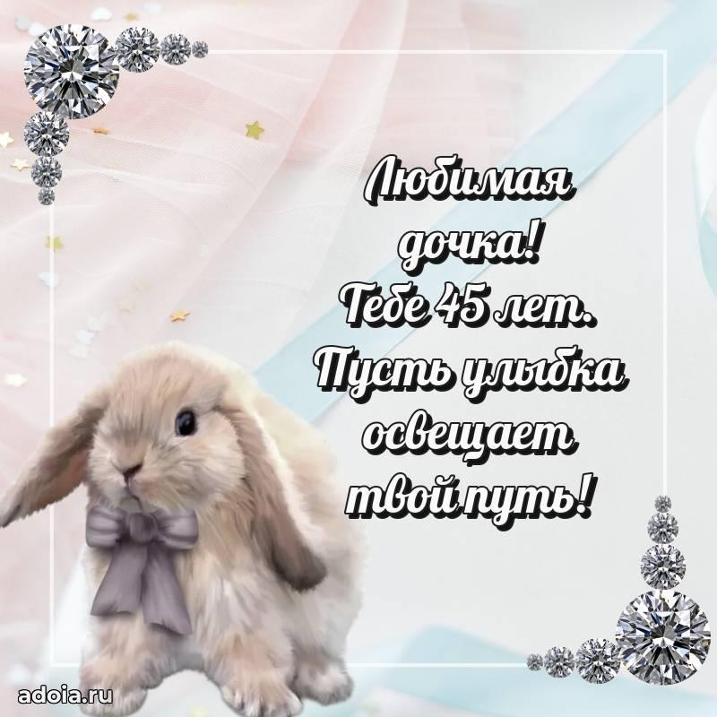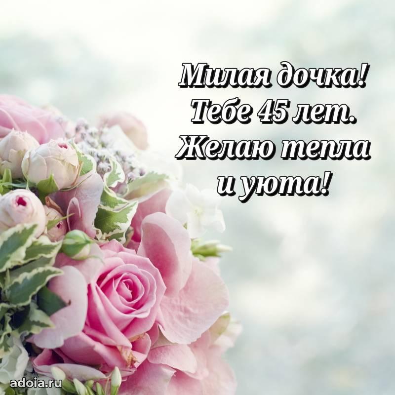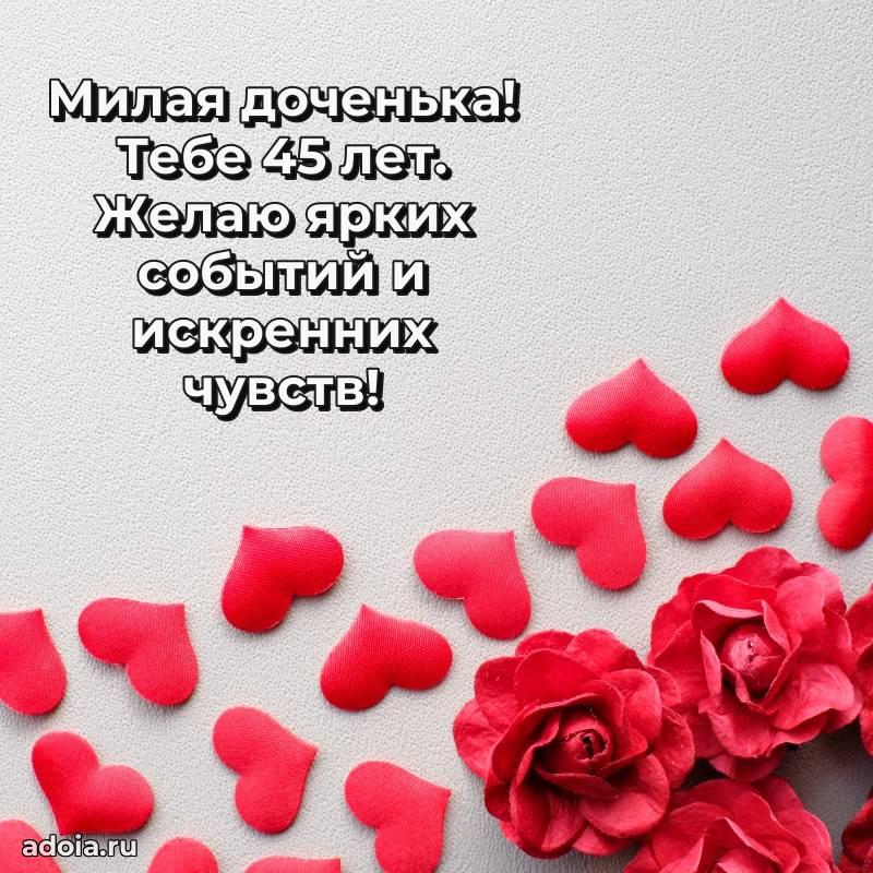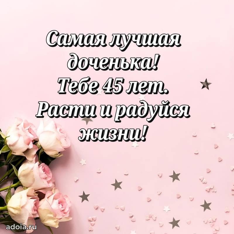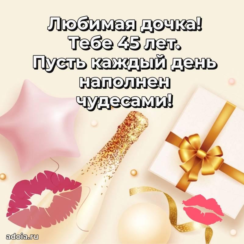 В поисках красивых и современных открыток? Вы попали по адресу! Здесь вы найдете картинки с днем рождения Дочери на 45 лет! Все картинки в высоком качестве, которые можно скачать или отправить через WhatsApp бесплатно. Также вы найдете много прикольных и мерцающих гифок и анимаций, которые поднимут настроение! Все открытки содержат поздравления в стихах и прозе.