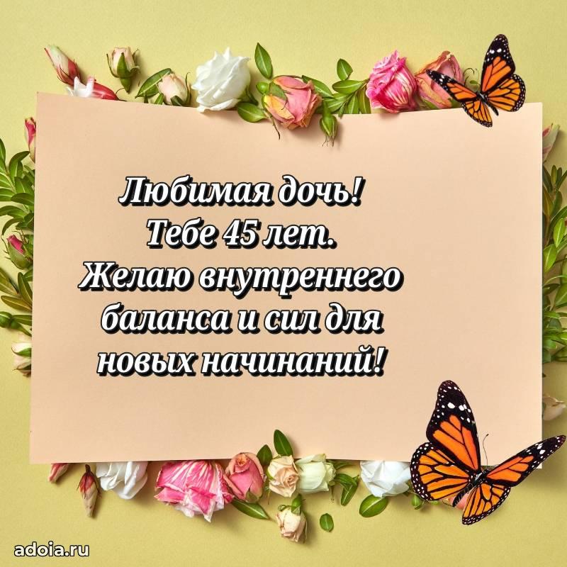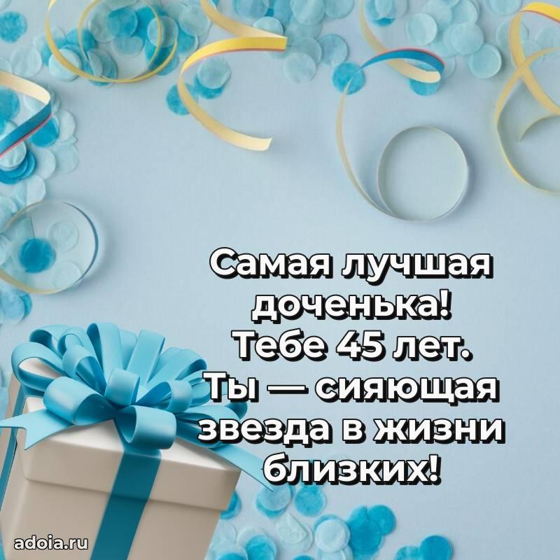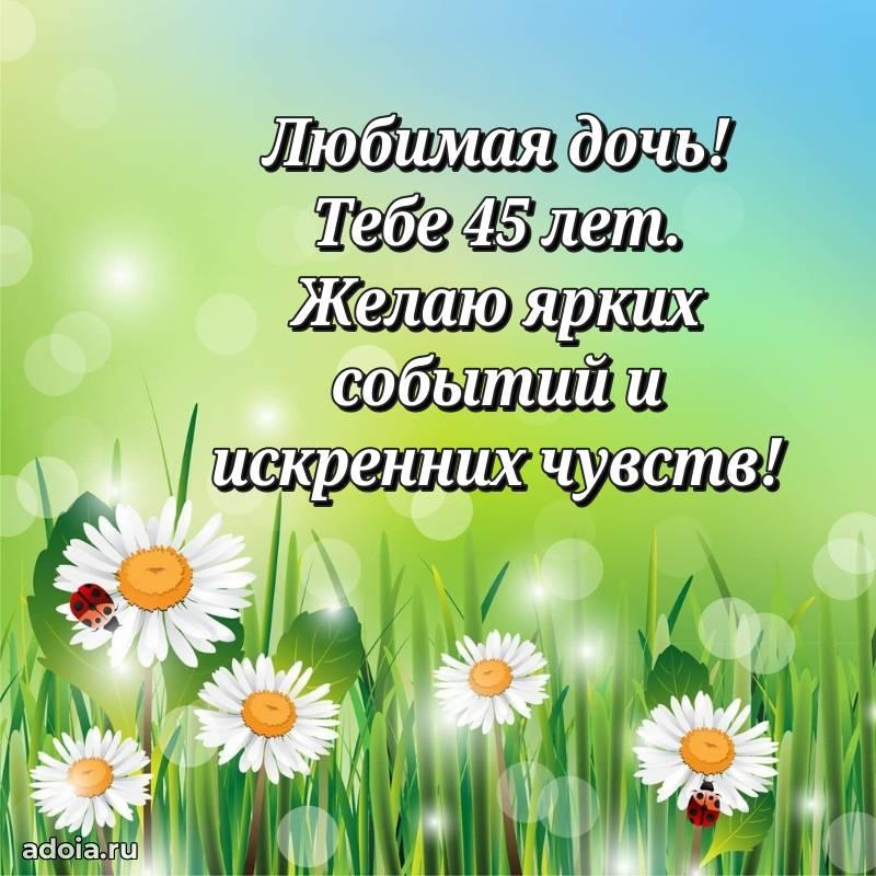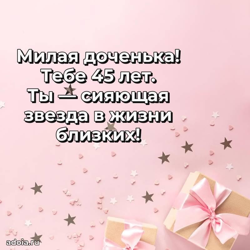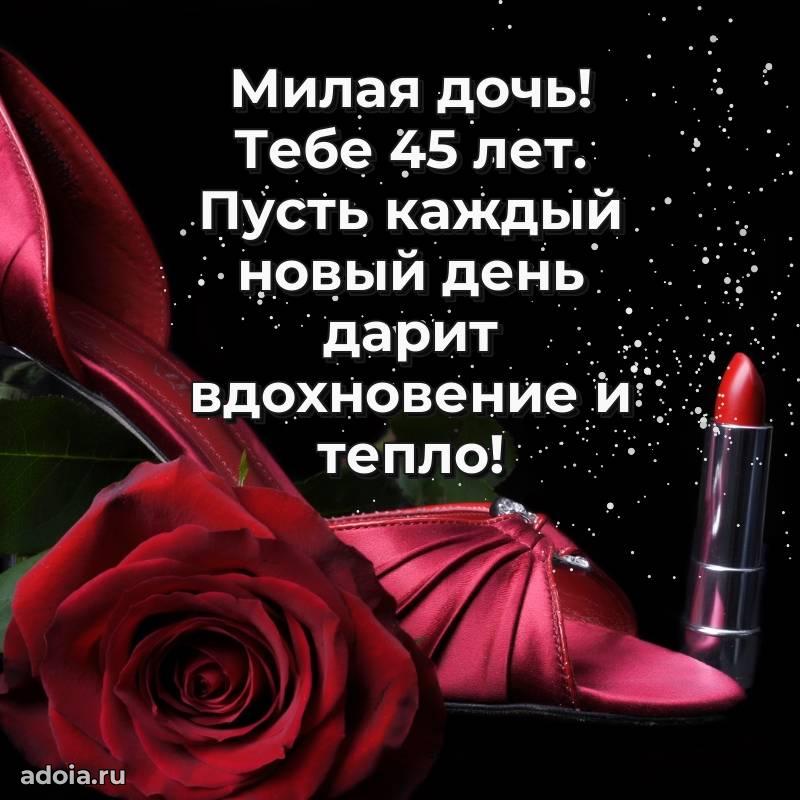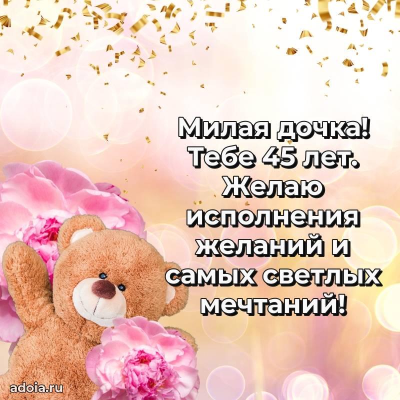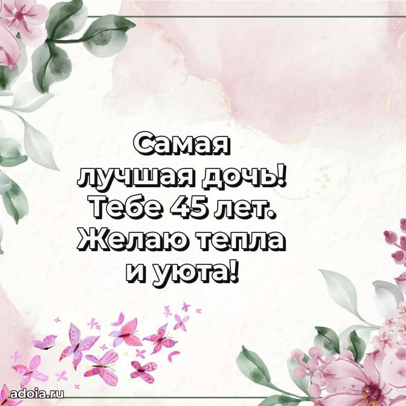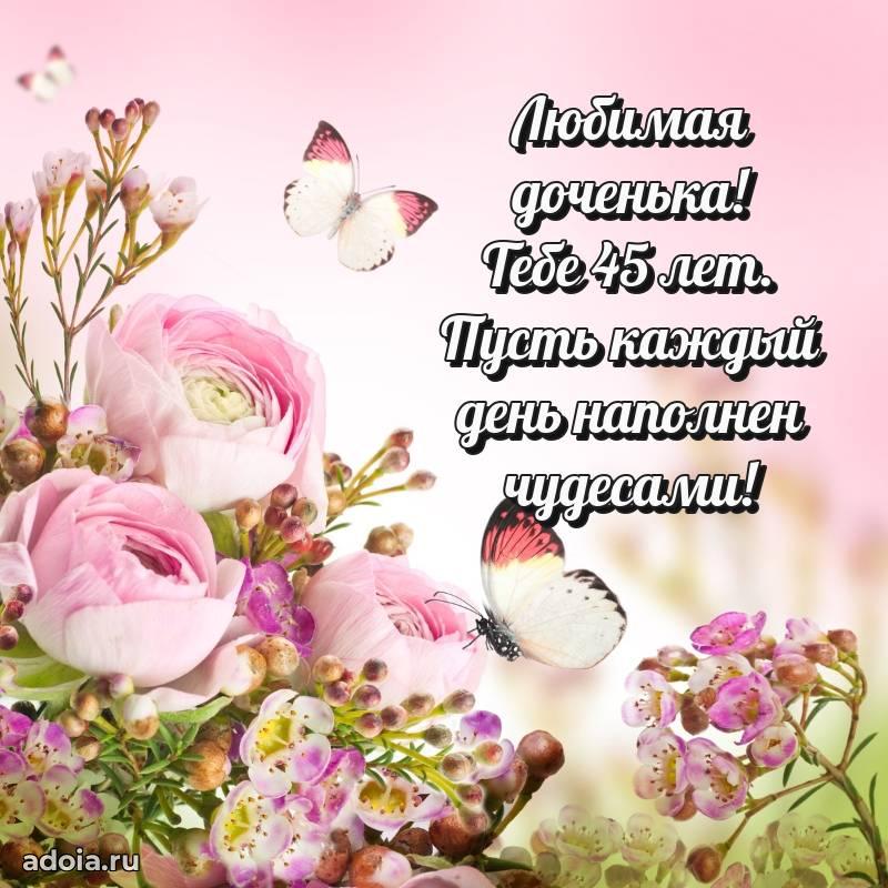 В поисках красивых и современных открыток? Вы попали по адресу! Здесь вы найдете картинки с днем рождения Дочери на 45 лет! Все картинки в высоком качестве, которые можно скачать или отправить через WhatsApp бесплатно. Также вы найдете много прикольных и мерцающих гифок и анимаций, которые поднимут настроение! Все открытки содержат поздравления в стихах и прозе.