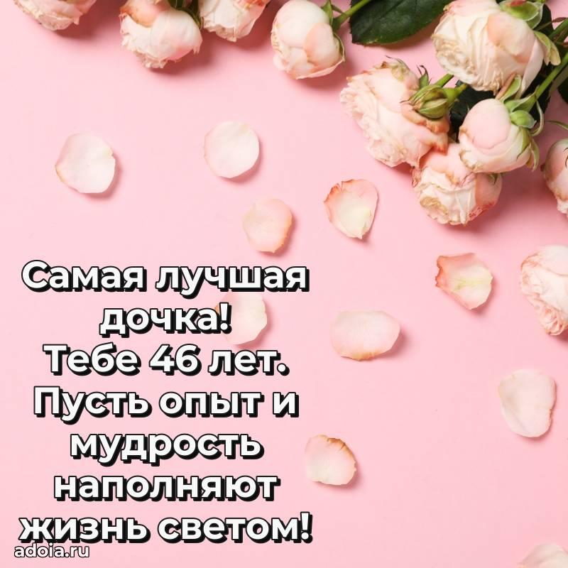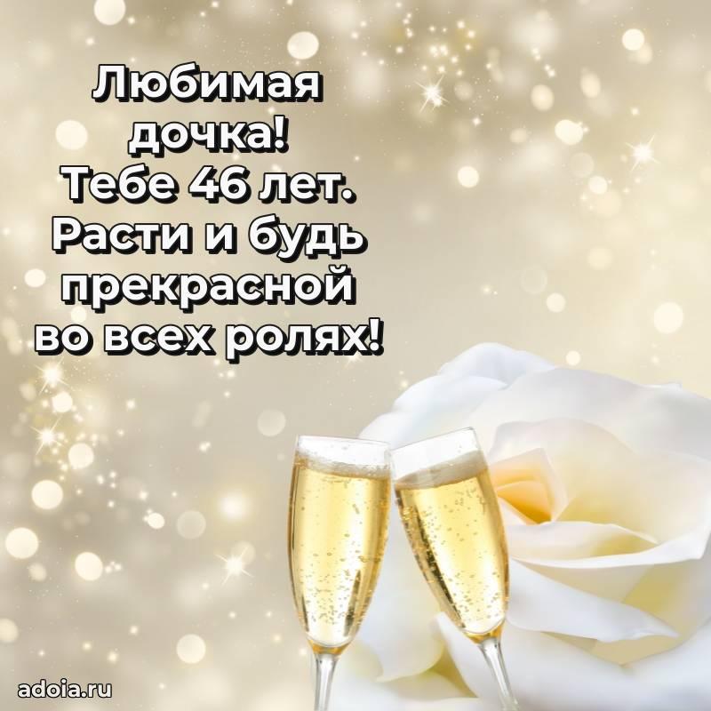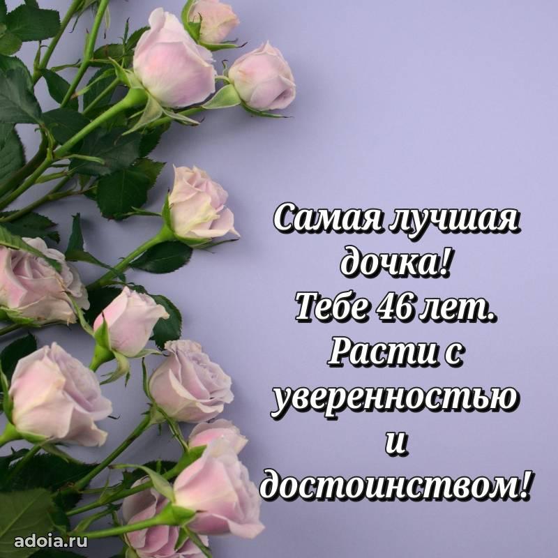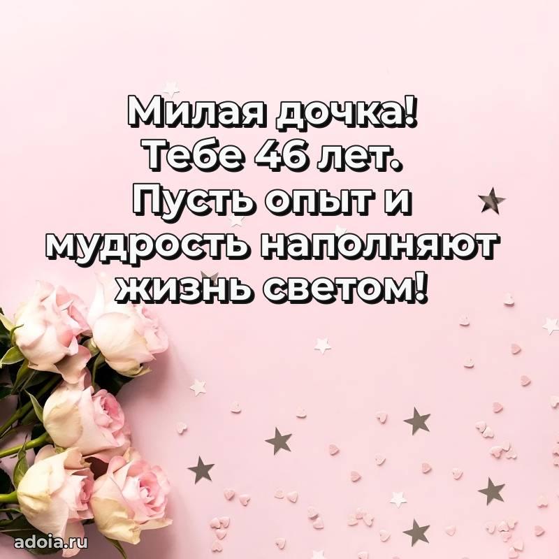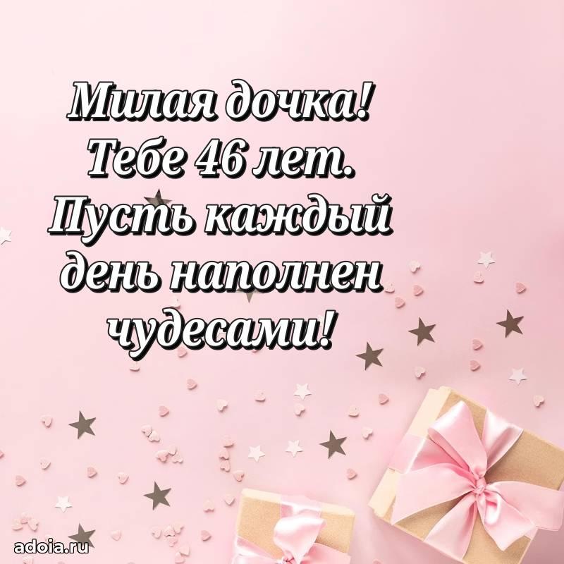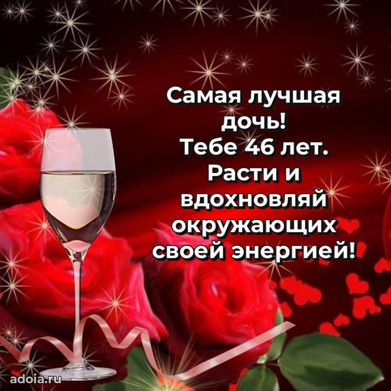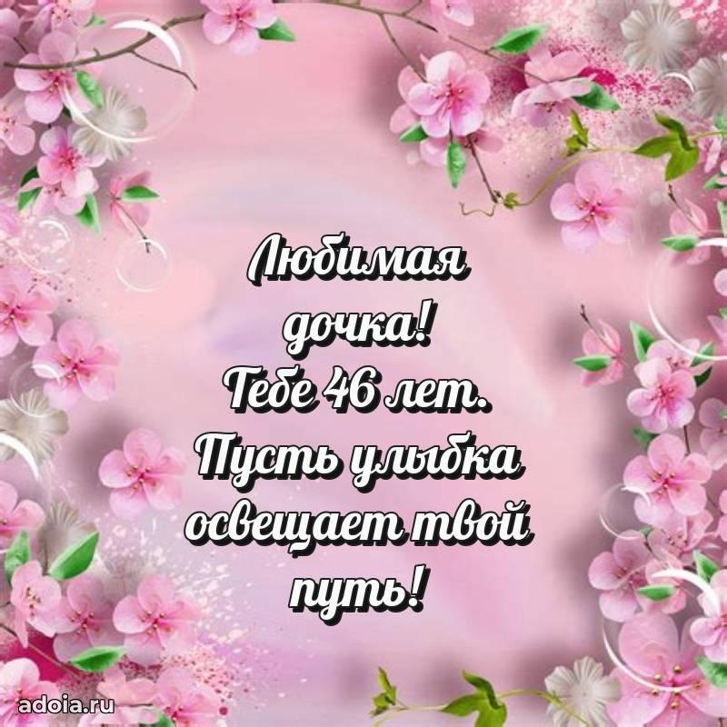 В поисках красивых и современных открыток? Вы попали по адресу! Здесь вы найдете картинки с днем рождения Дочери на 46 лет! Все картинки в высоком качестве, которые можно скачать или отправить через WhatsApp бесплатно. Также вы найдете много прикольных и мерцающих гифок и анимаций, которые поднимут настроение! Все открытки содержат поздравления в стихах и прозе.