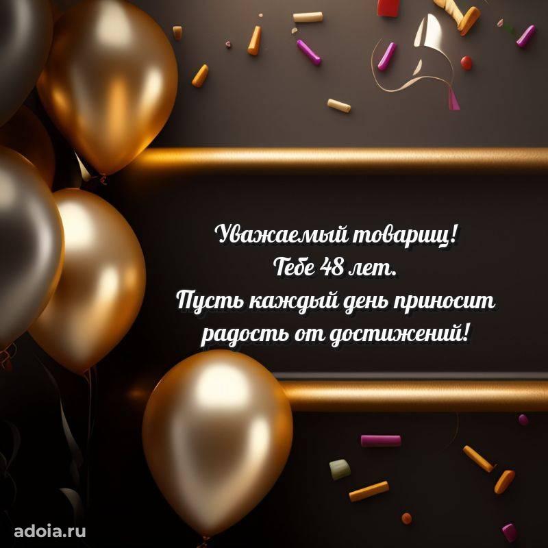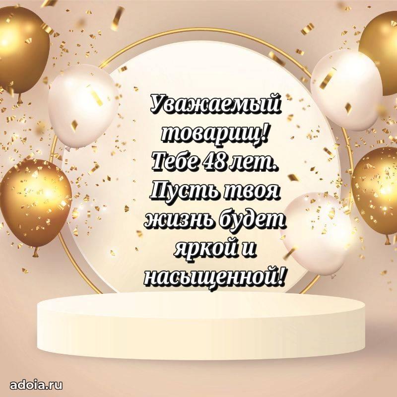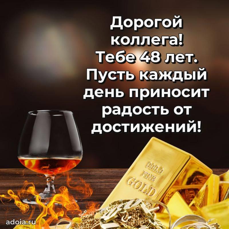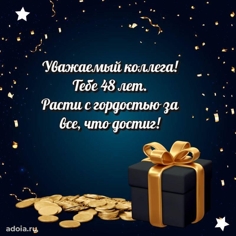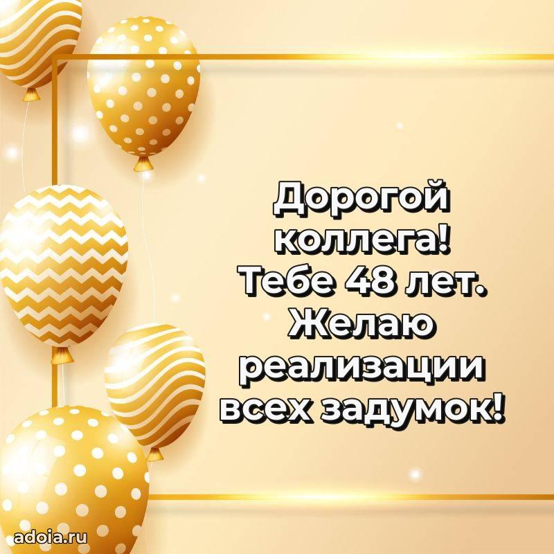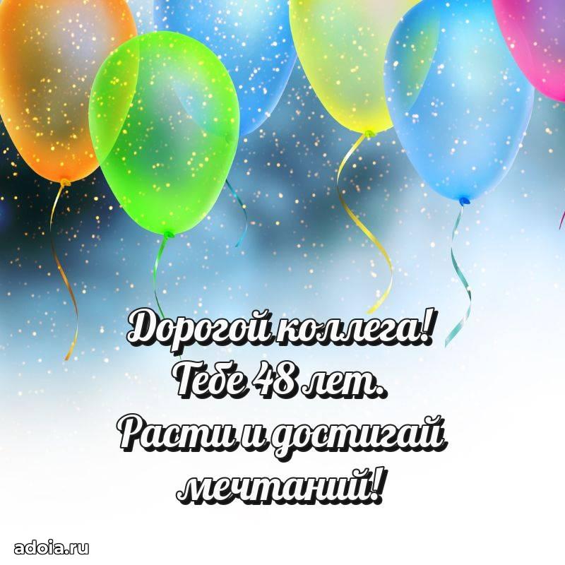 В поисках красивых и современных открыток? Вы попали по адресу! Здесь вы найдете картинки с днем рождения Коллеге на 48 лет! Все картинки в высоком качестве, которые можно скачать или отправить через WhatsApp бесплатно. Также вы найдете много прикольных и мерцающих гифок и анимаций, которые поднимут настроение! Все открытки содержат поздравления в стихах и прозе.