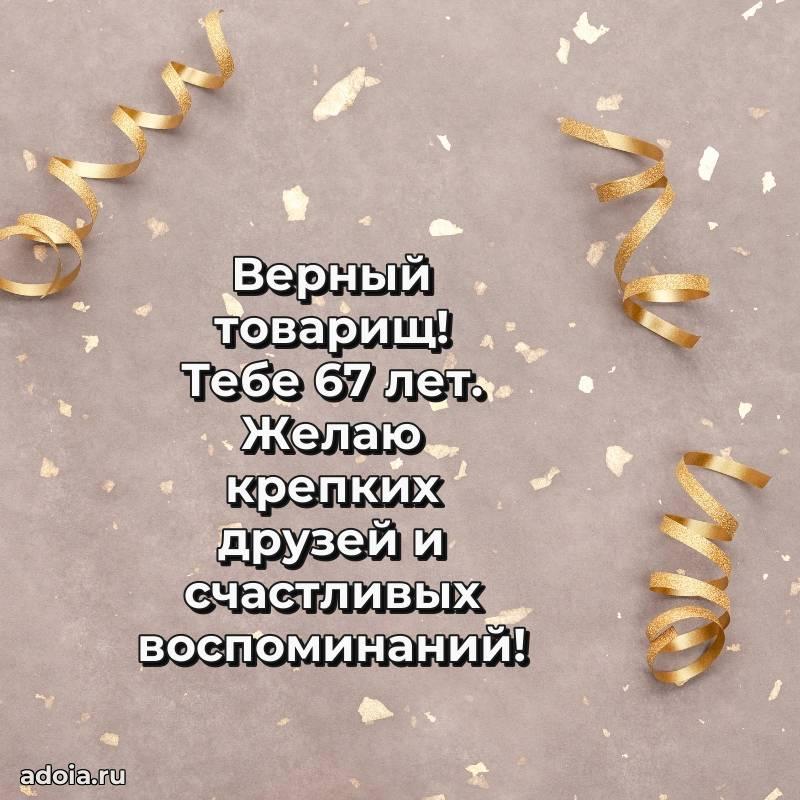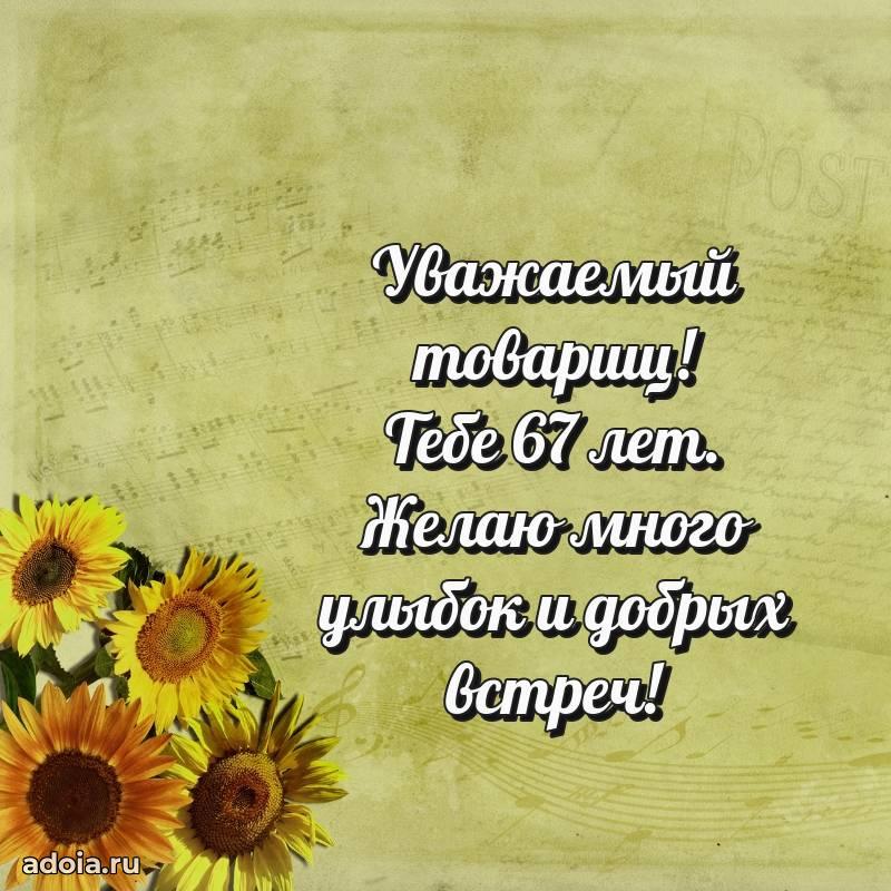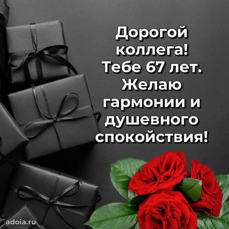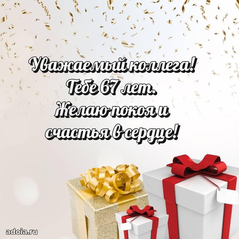 В поисках красивых и современных открыток? Вы попали по адресу! Здесь вы найдете картинки с днем рождения Коллеге на 67 лет! Все картинки в высоком качестве, которые можно скачать или отправить через WhatsApp бесплатно. Также вы найдете много прикольных и мерцающих гифок и анимаций, которые поднимут настроение! Все открытки содержат поздравления в стихах и прозе.