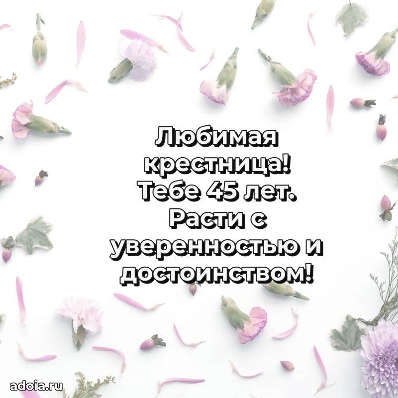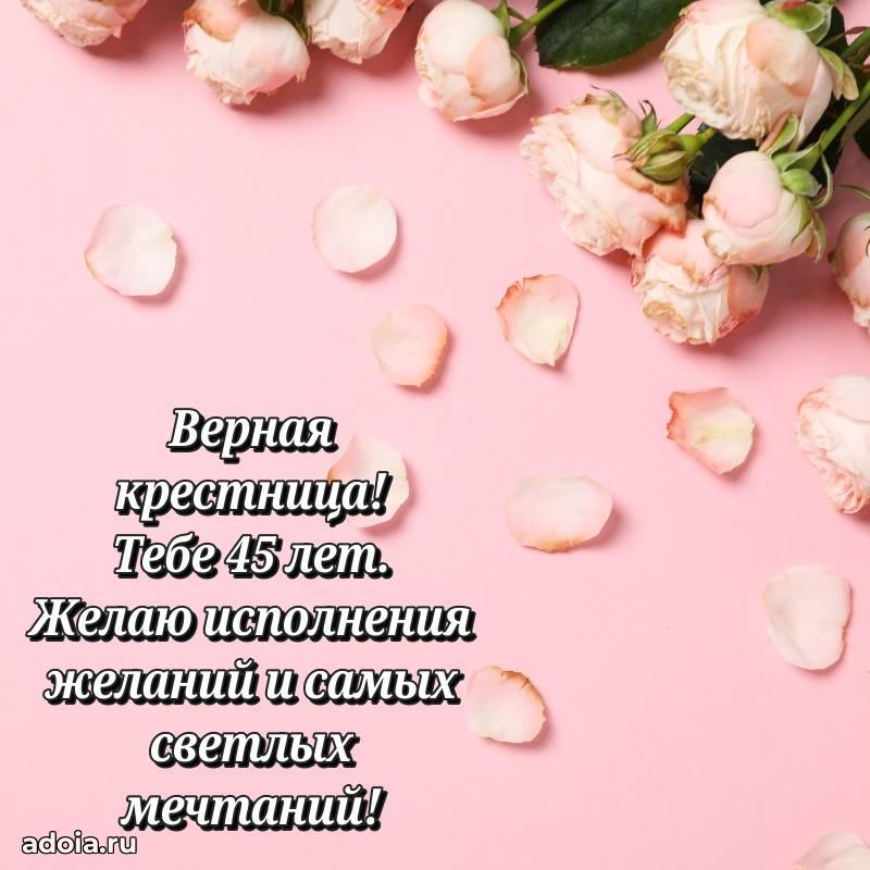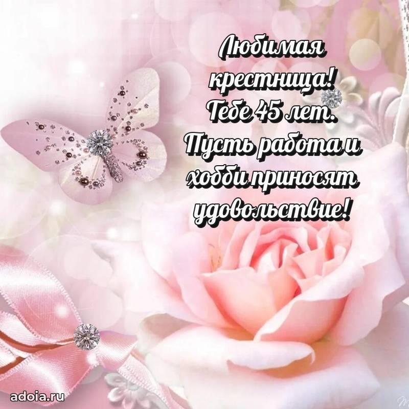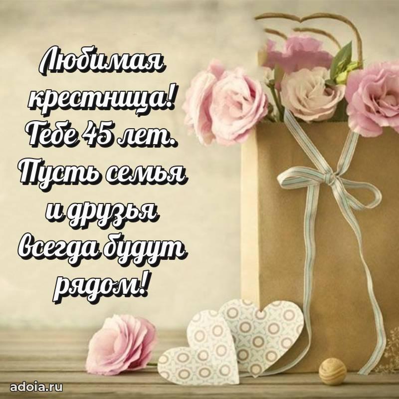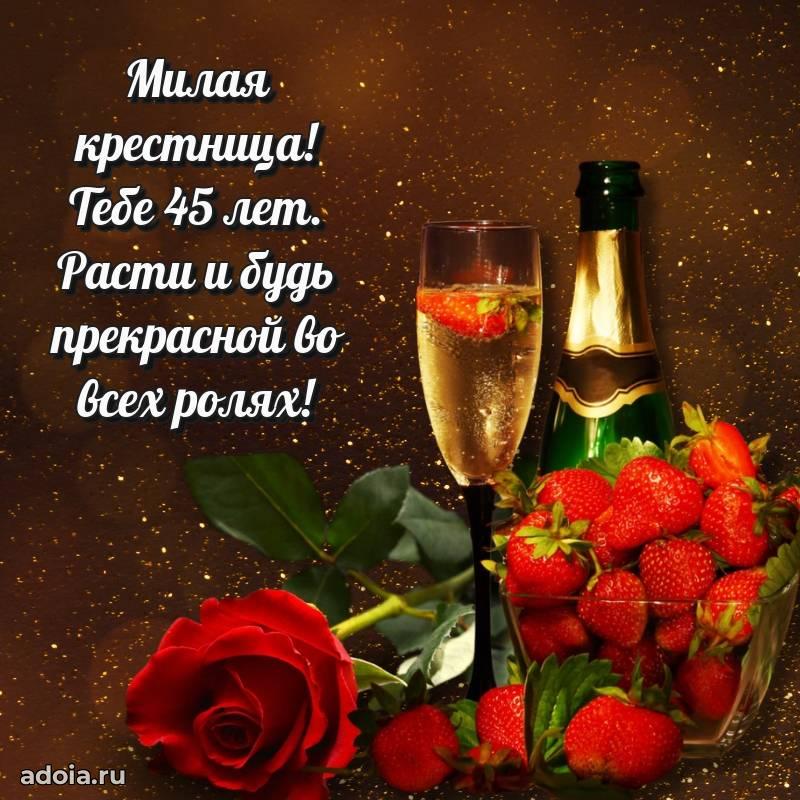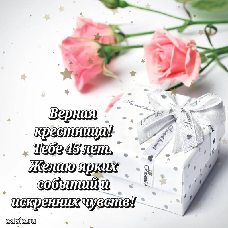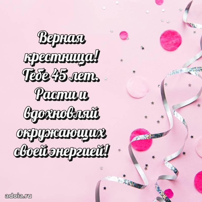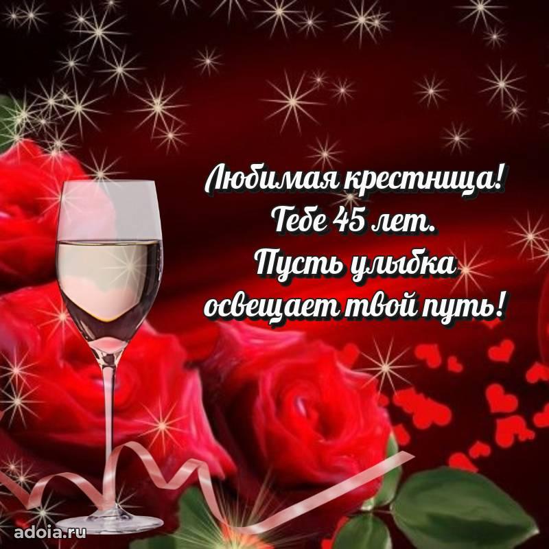 В поисках красивых и современных открыток? Вы попали по адресу! Здесь вы найдете картинки с днем рождения Крестнице на 45 лет! Все картинки в высоком качестве, которые можно скачать или отправить через WhatsApp бесплатно. Также вы найдете много прикольных и мерцающих гифок и анимаций, которые поднимут настроение! Все открытки содержат поздравления в стихах и прозе.