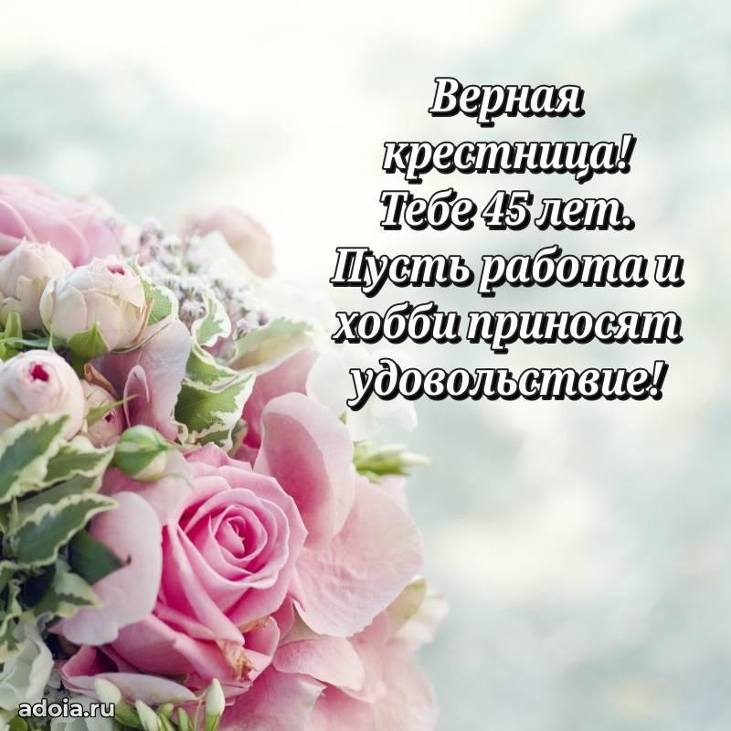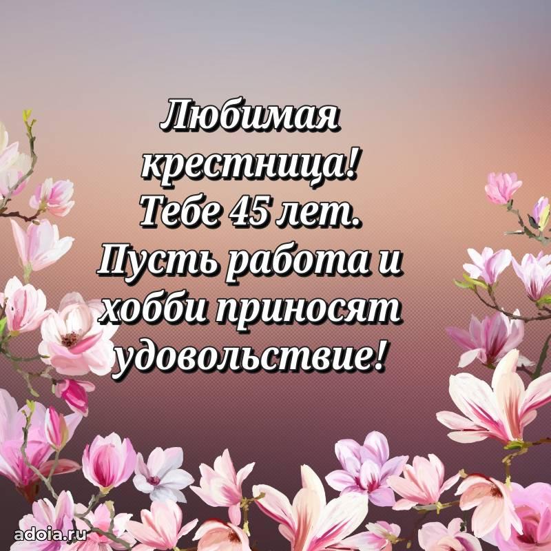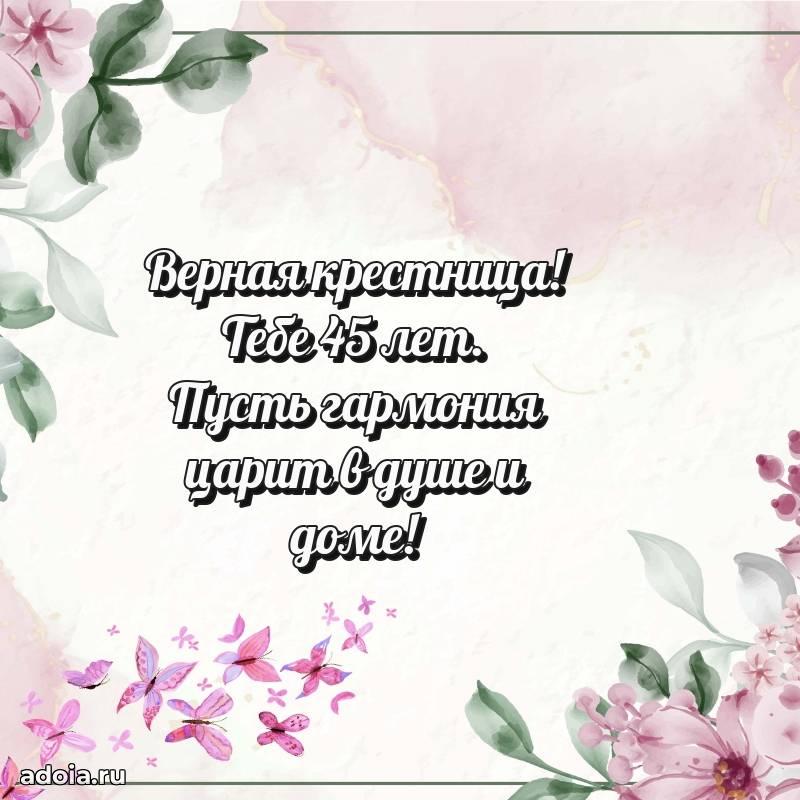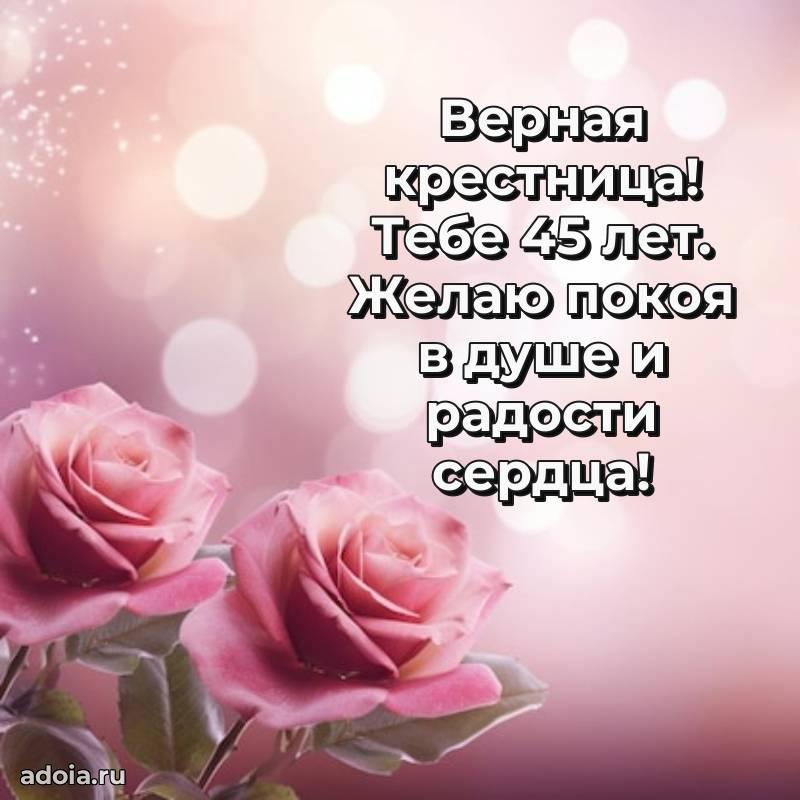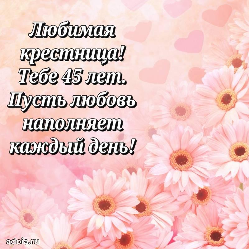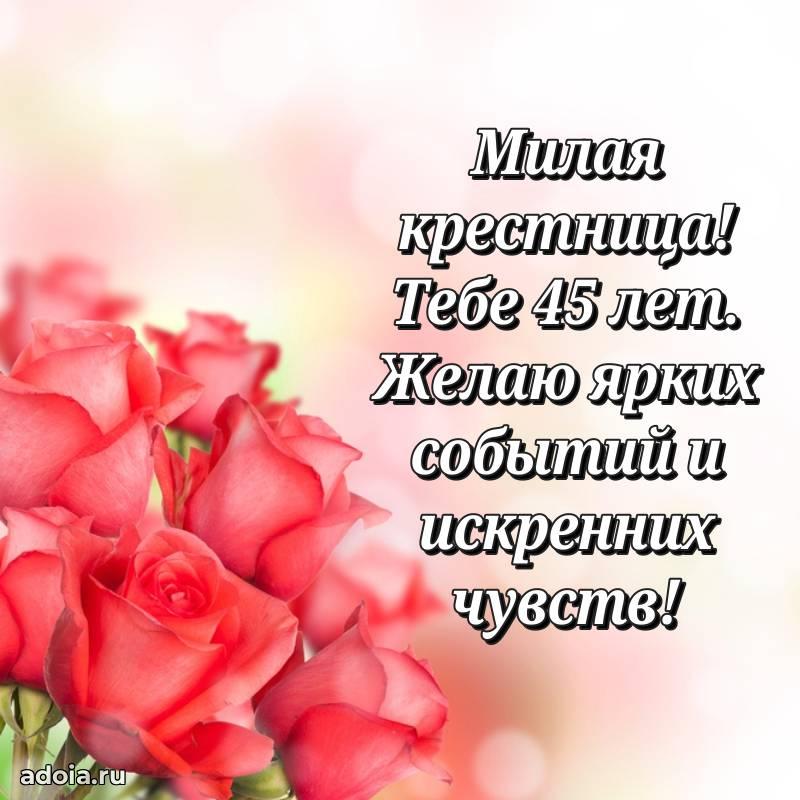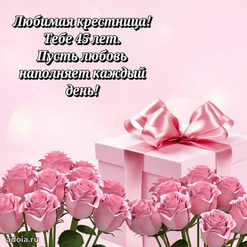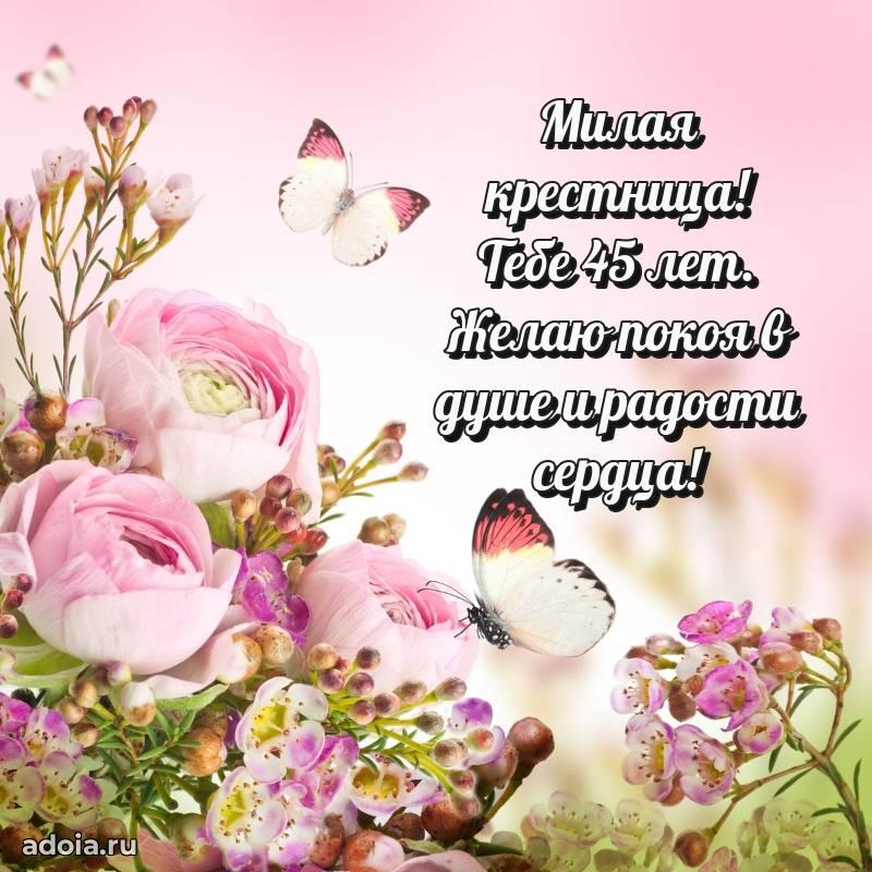 В поисках красивых и современных открыток? Вы попали по адресу! Здесь вы найдете картинки с днем рождения Крестнице на 45 лет! Все картинки в высоком качестве, которые можно скачать или отправить через WhatsApp бесплатно. Также вы найдете много прикольных и мерцающих гифок и анимаций, которые поднимут настроение! Все открытки содержат поздравления в стихах и прозе.