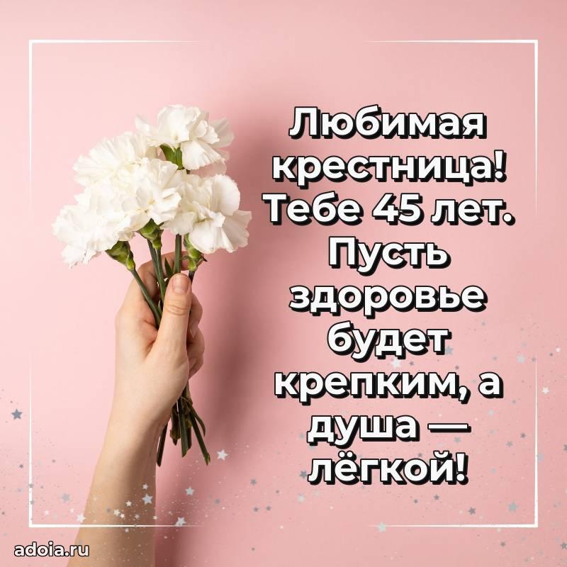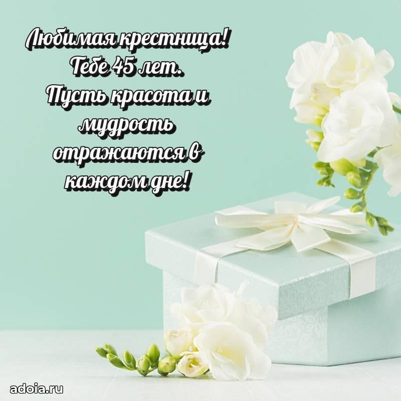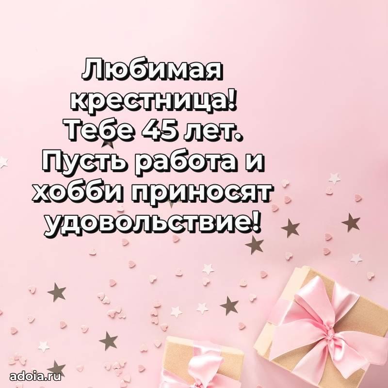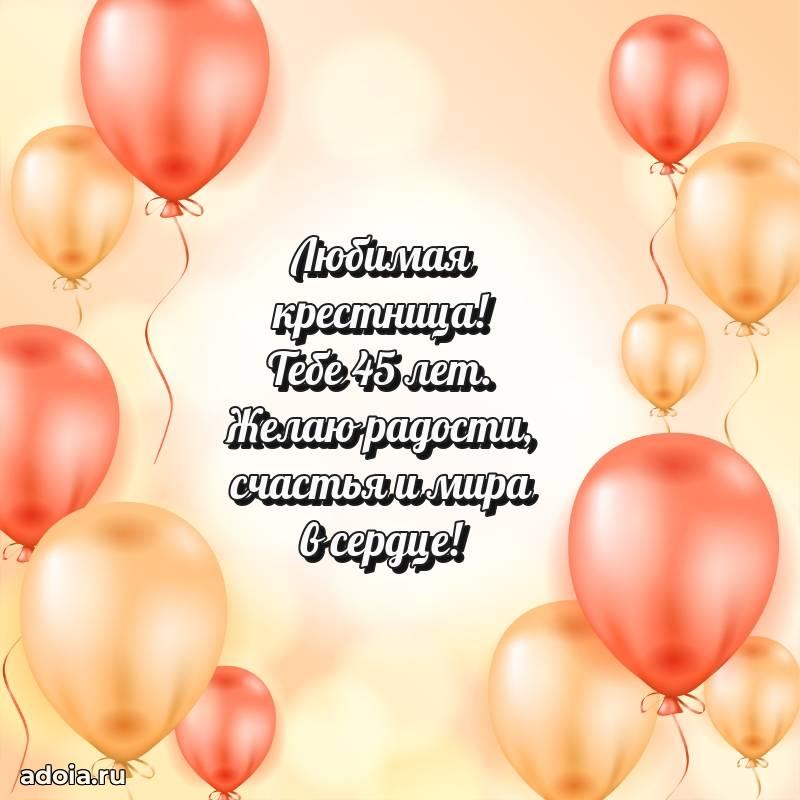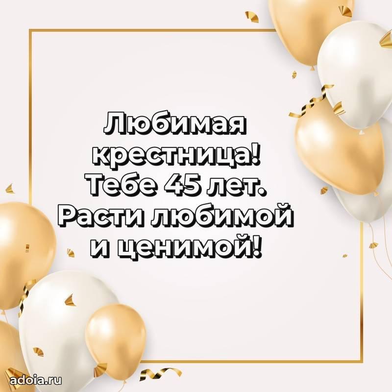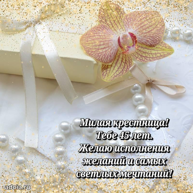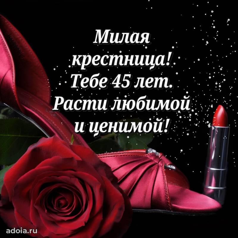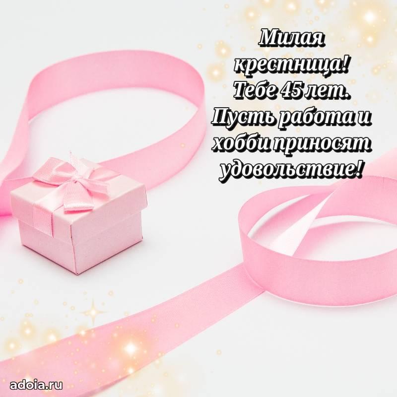 В поисках красивых и современных открыток? Вы попали по адресу! Здесь вы найдете картинки с днем рождения Крестнице на 45 лет! Все картинки в высоком качестве, которые можно скачать или отправить через WhatsApp бесплатно. Также вы найдете много прикольных и мерцающих гифок и анимаций, которые поднимут настроение! Все открытки содержат поздравления в стихах и прозе.