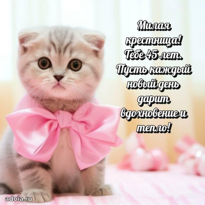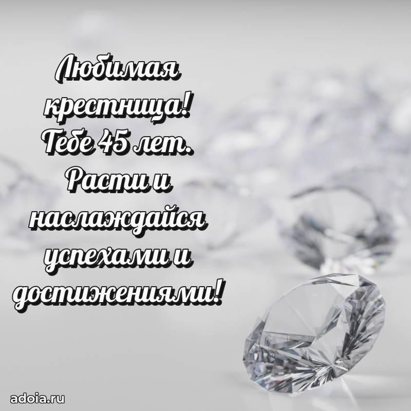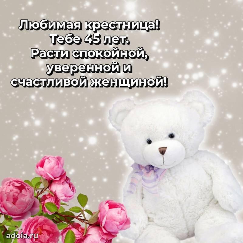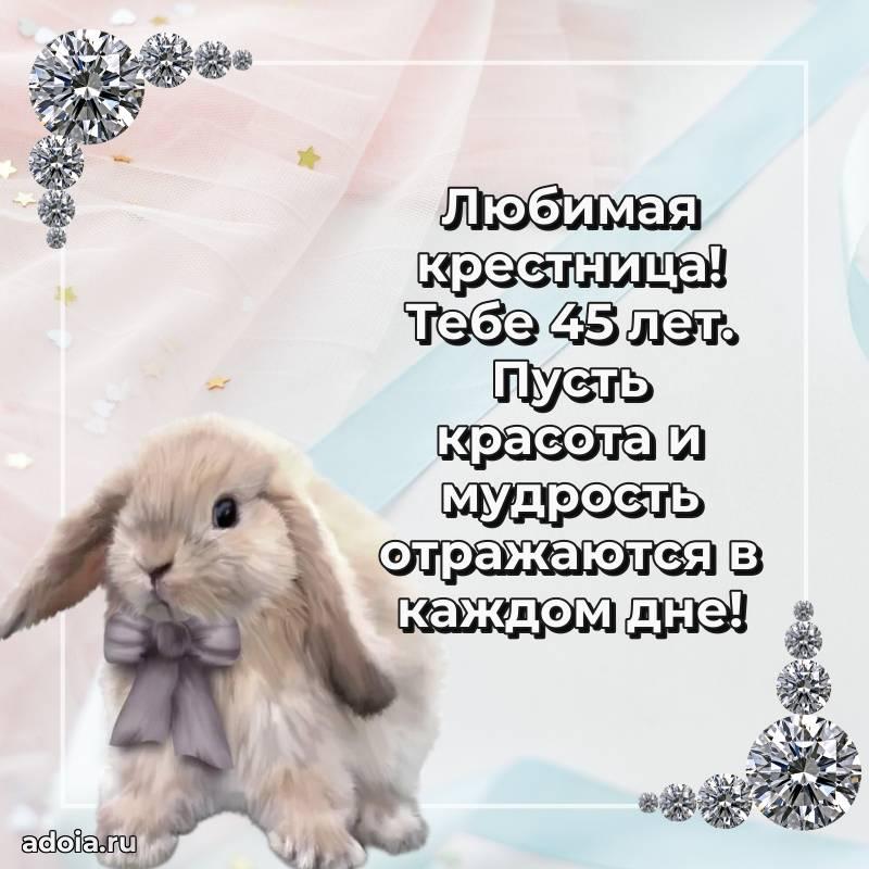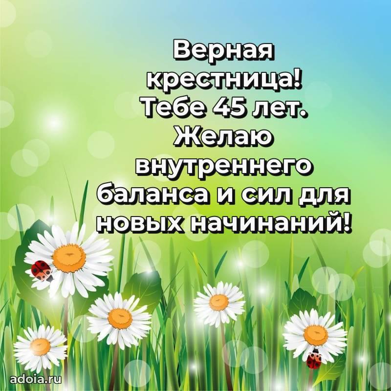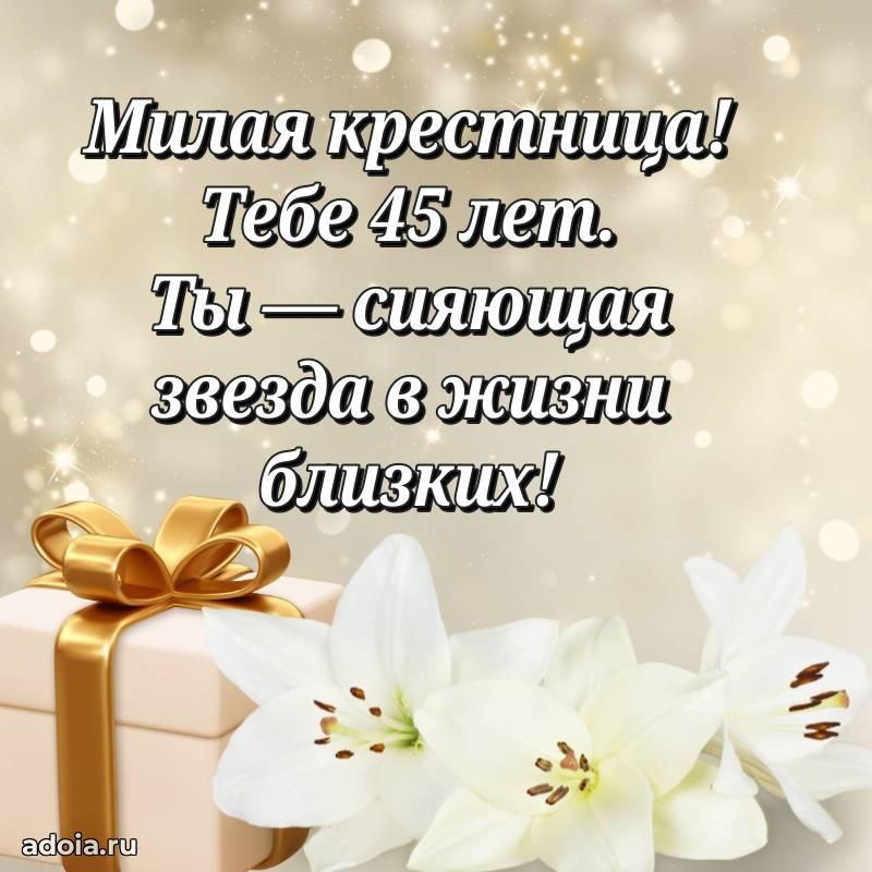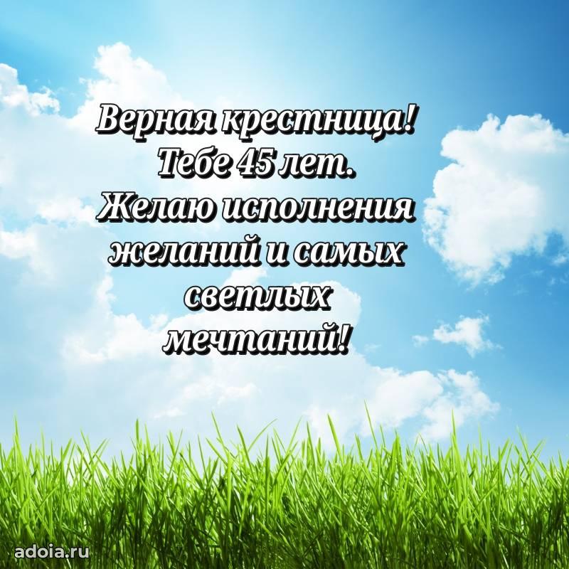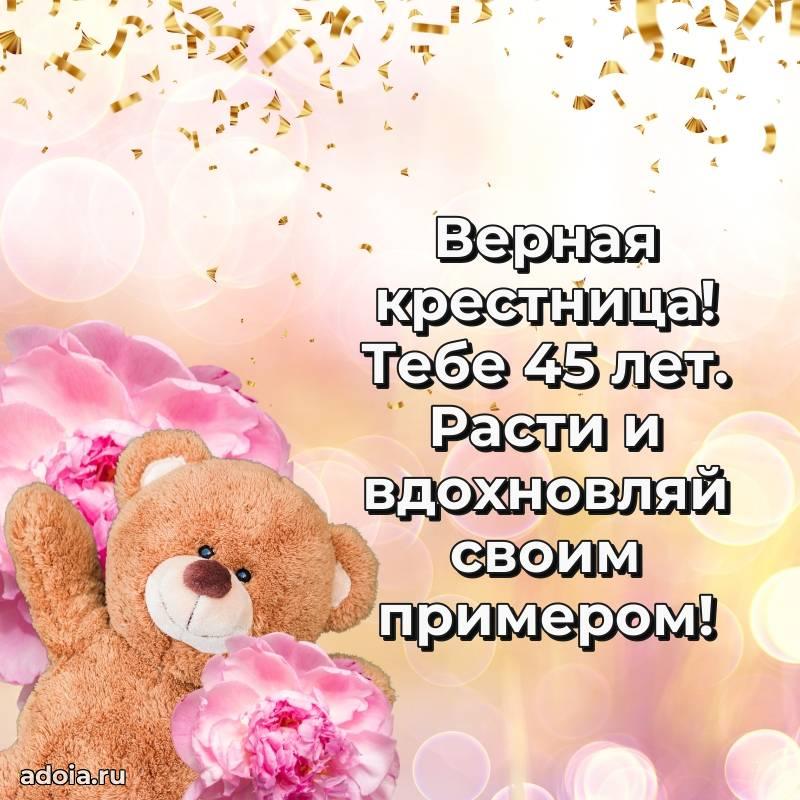 В поисках красивых и современных открыток? Вы попали по адресу! Здесь вы найдете картинки с днем рождения Крестнице на 45 лет! Все картинки в высоком качестве, которые можно скачать или отправить через WhatsApp бесплатно. Также вы найдете много прикольных и мерцающих гифок и анимаций, которые поднимут настроение! Все открытки содержат поздравления в стихах и прозе.