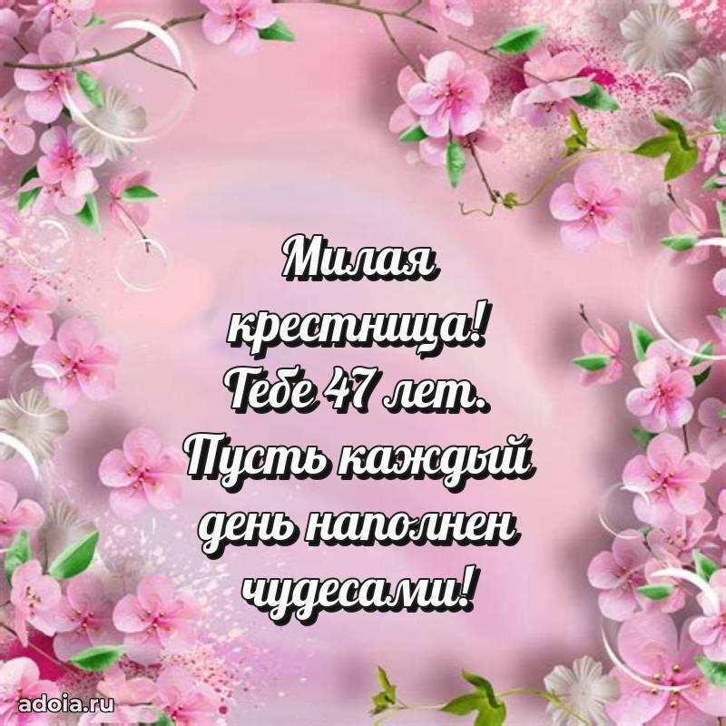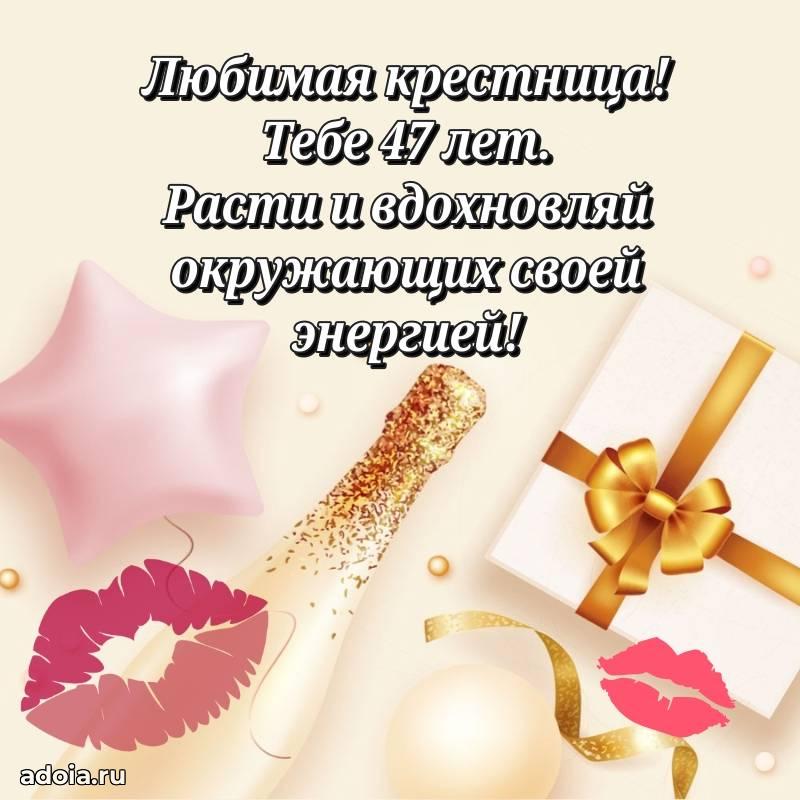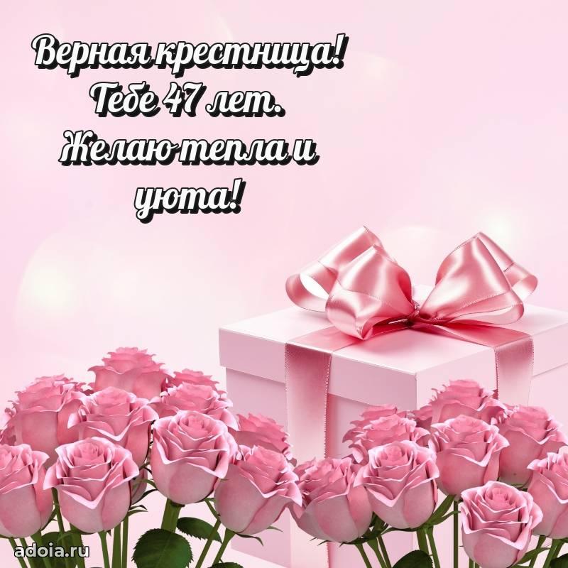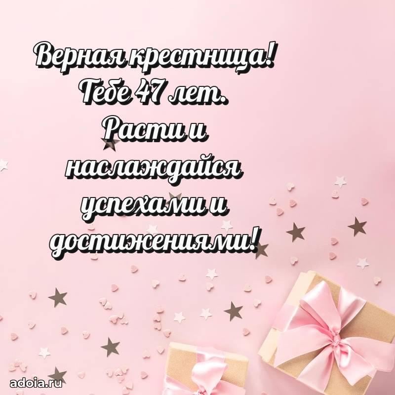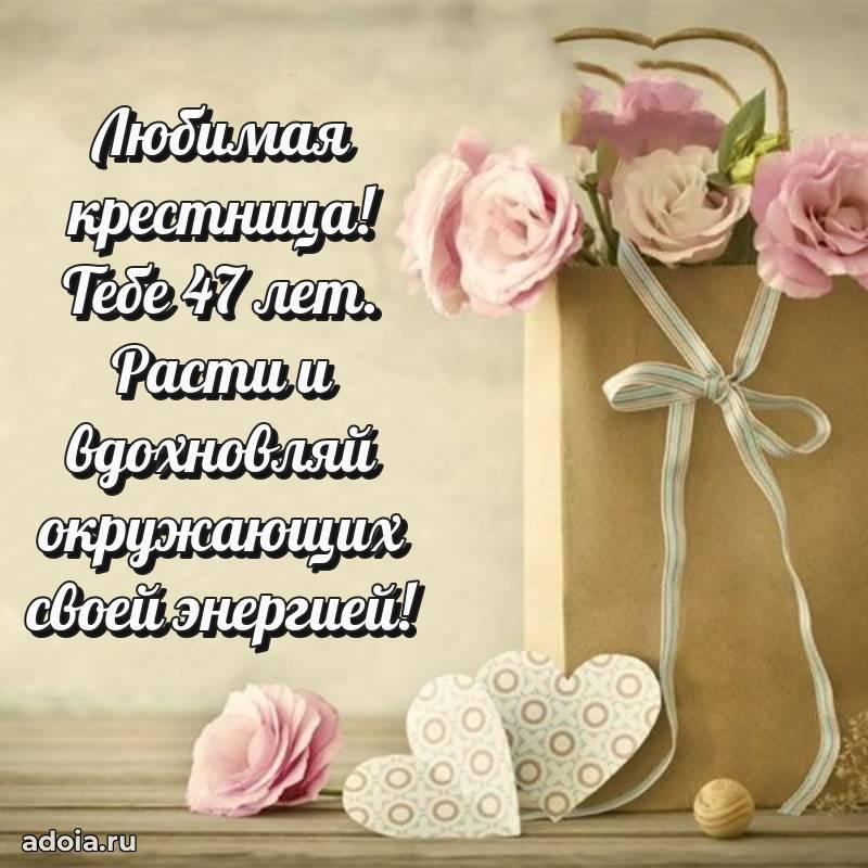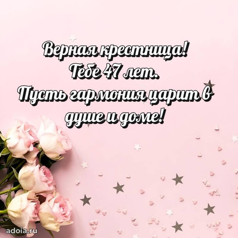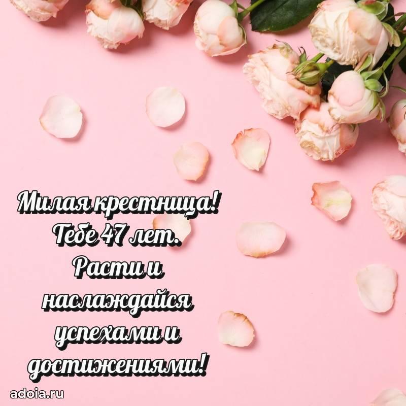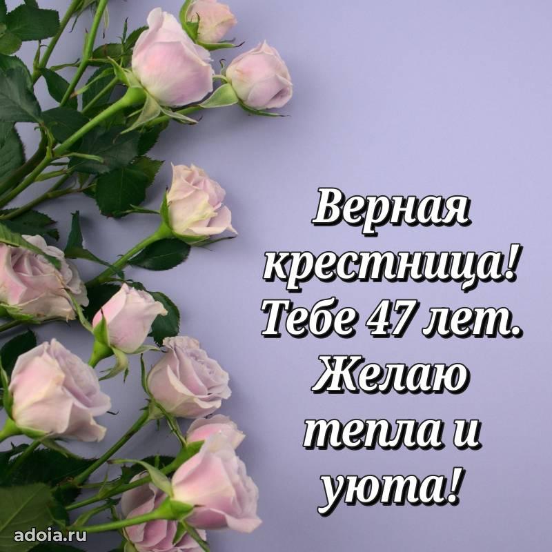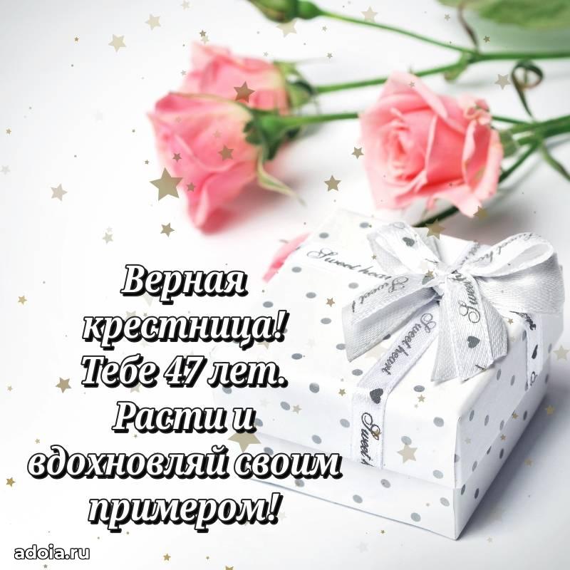 В поисках красивых и современных открыток? Вы попали по адресу! Здесь вы найдете картинки с днем рождения Крестнице на 47 лет! Все картинки в высоком качестве, которые можно скачать или отправить через WhatsApp бесплатно. Также вы найдете много прикольных и мерцающих гифок и анимаций, которые поднимут настроение! Все открытки содержат поздравления в стихах и прозе.