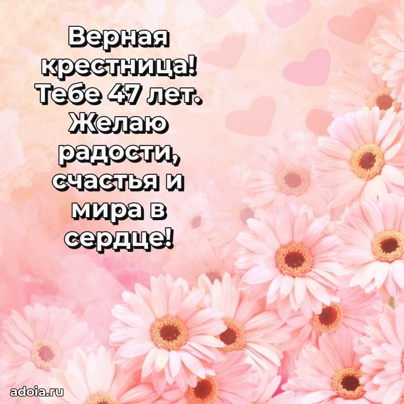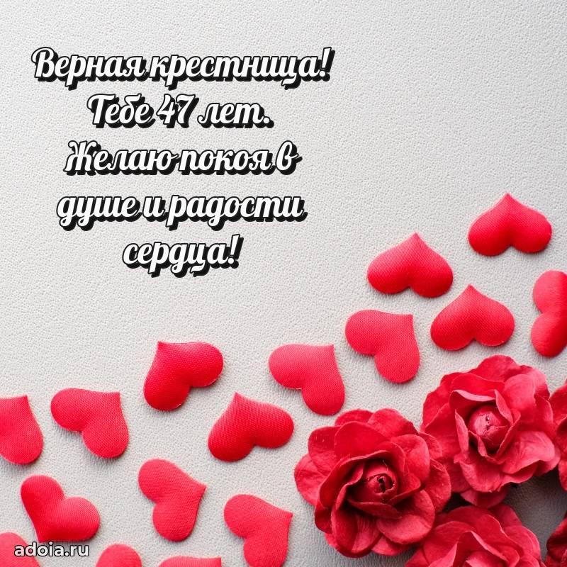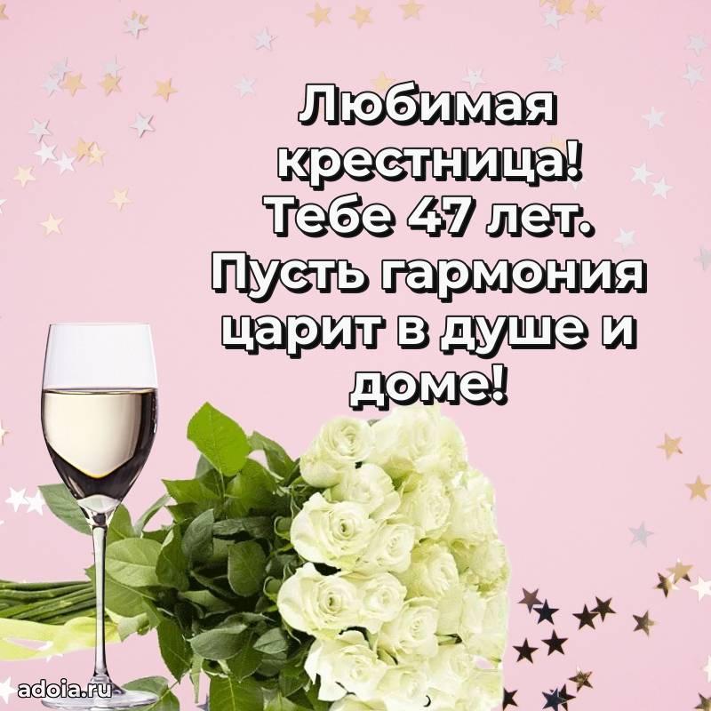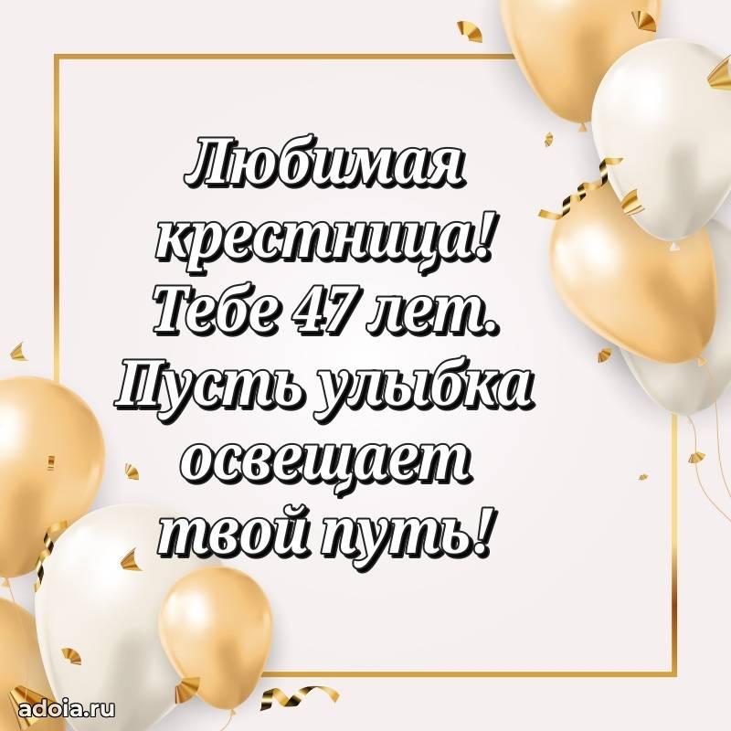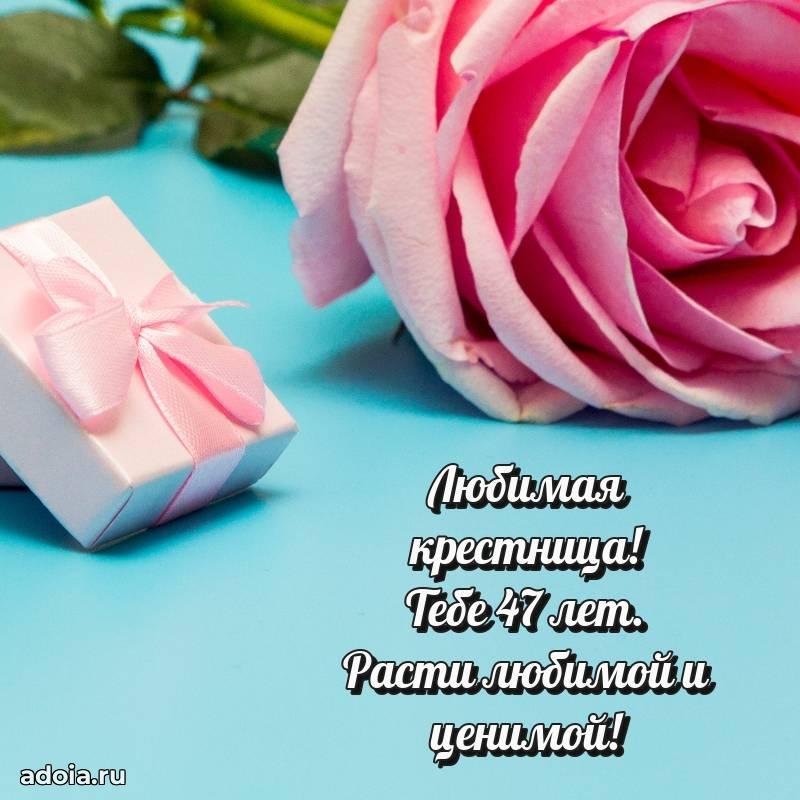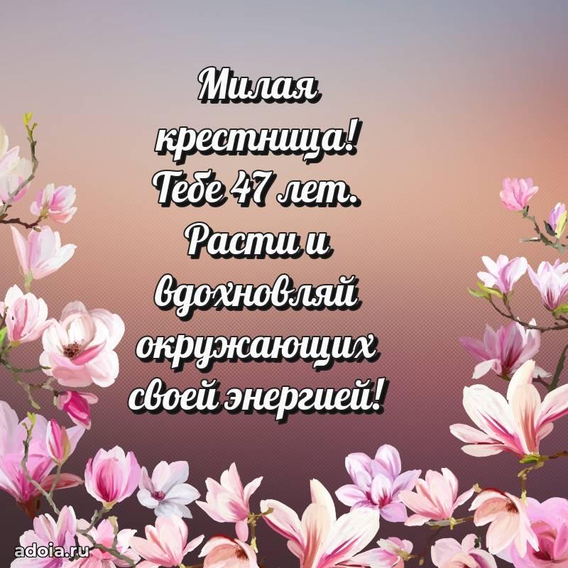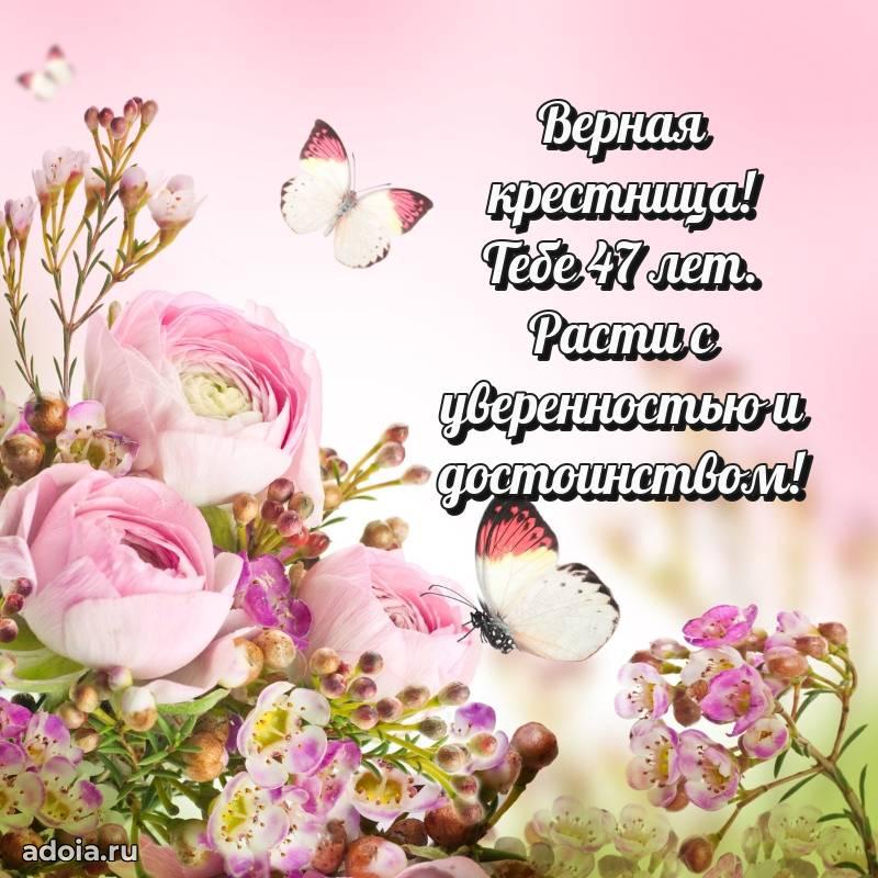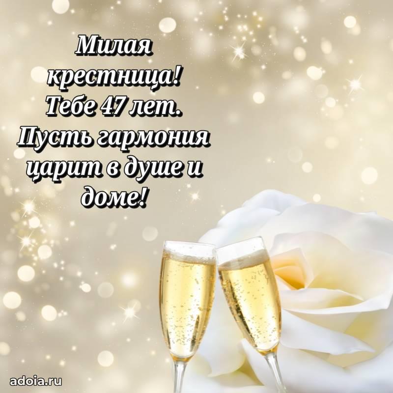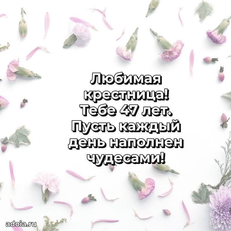 В поисках красивых и современных открыток? Вы попали по адресу! Здесь вы найдете картинки с днем рождения Крестнице на 47 лет! Все картинки в высоком качестве, которые можно скачать или отправить через WhatsApp бесплатно. Также вы найдете много прикольных и мерцающих гифок и анимаций, которые поднимут настроение! Все открытки содержат поздравления в стихах и прозе.