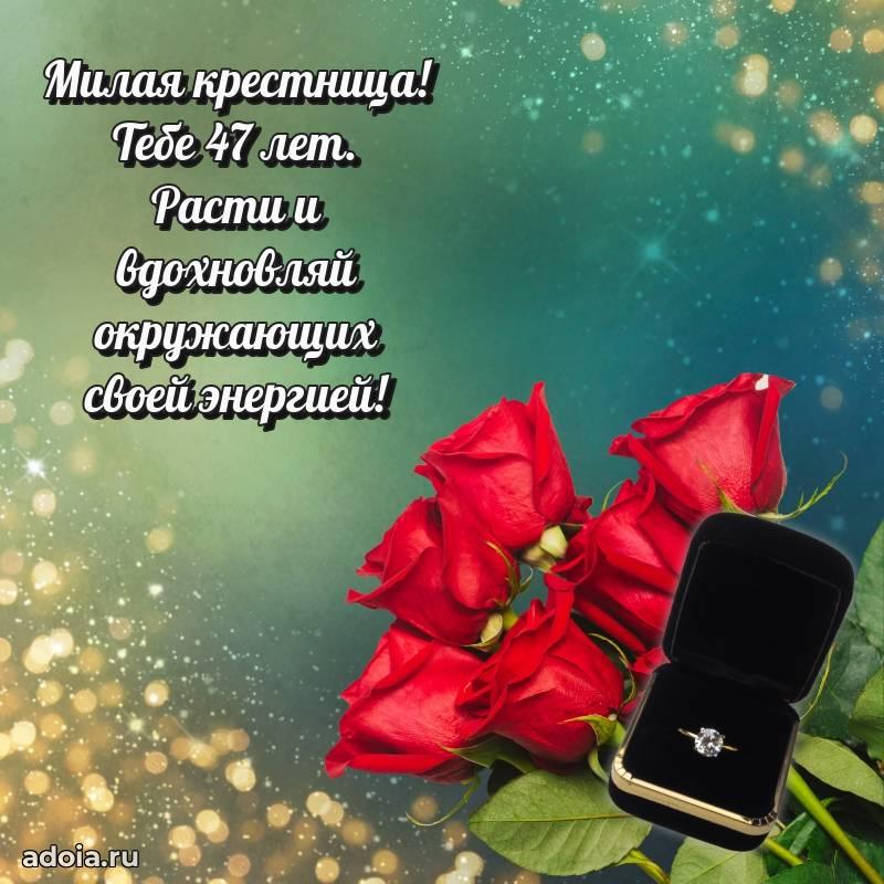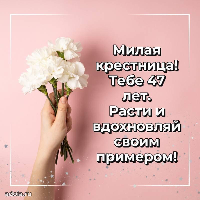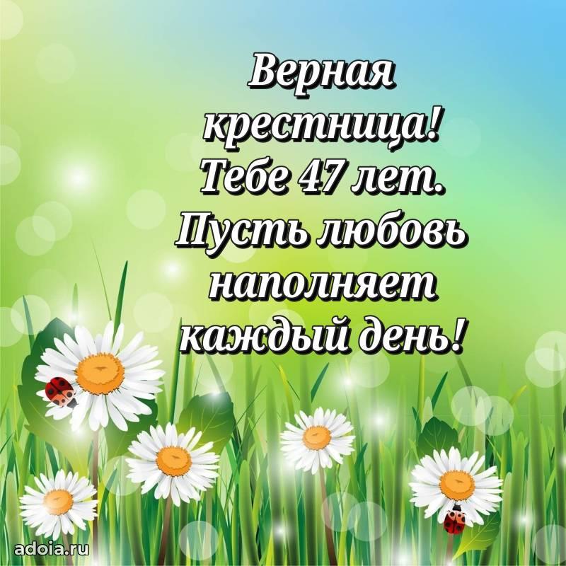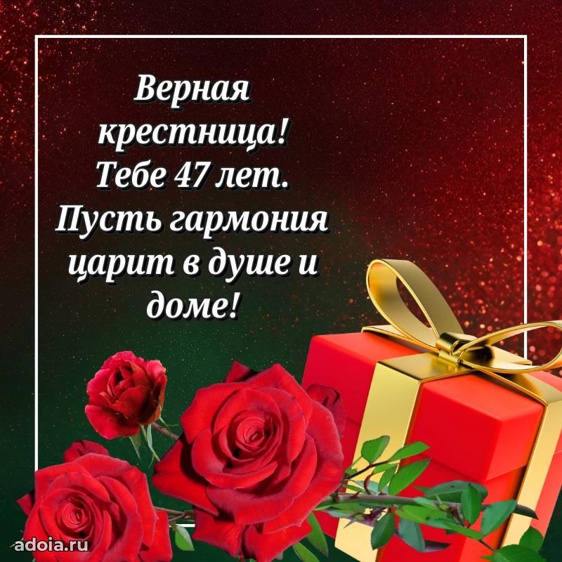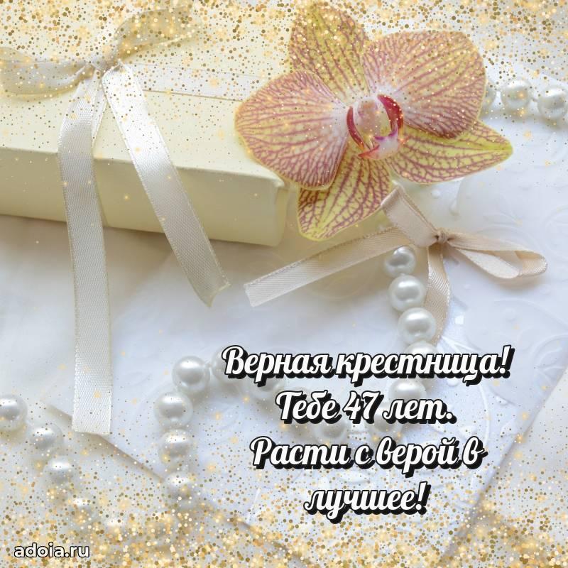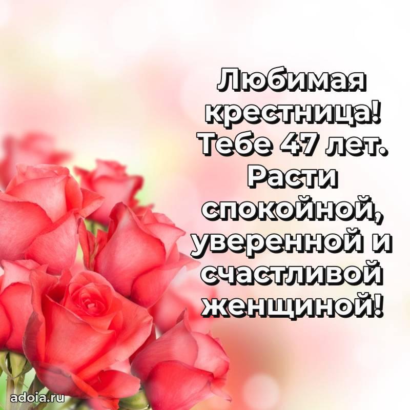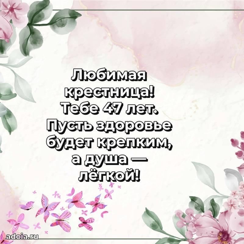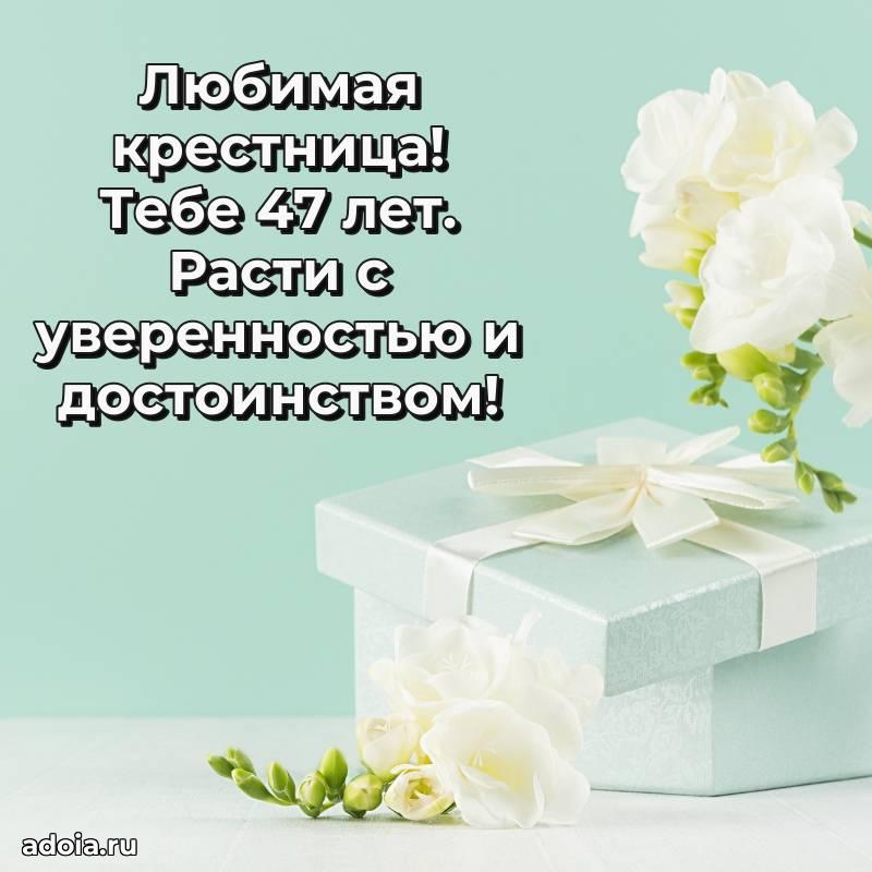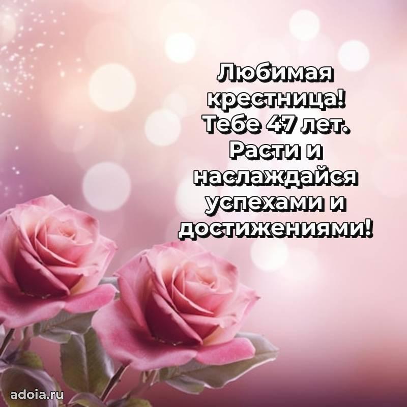 В поисках красивых и современных открыток? Вы попали по адресу! Здесь вы найдете картинки с днем рождения Крестнице на 47 лет! Все картинки в высоком качестве, которые можно скачать или отправить через WhatsApp бесплатно. Также вы найдете много прикольных и мерцающих гифок и анимаций, которые поднимут настроение! Все открытки содержат поздравления в стихах и прозе.