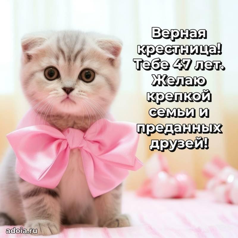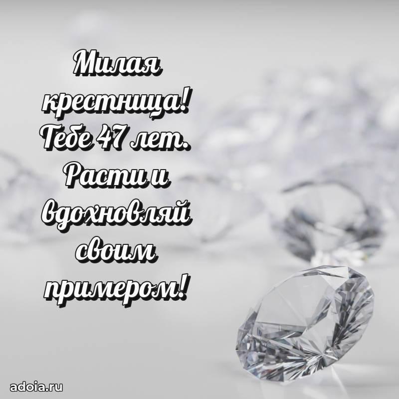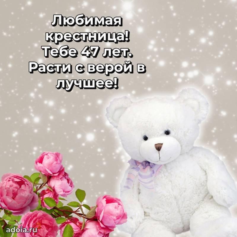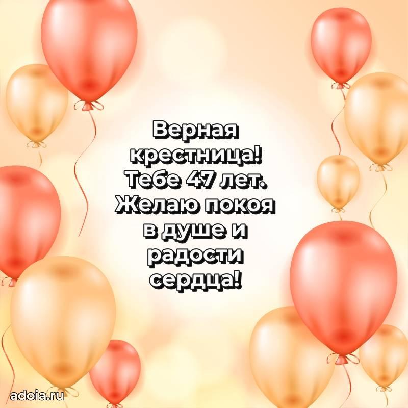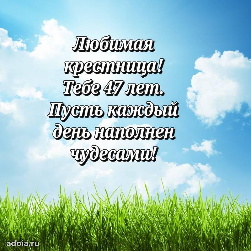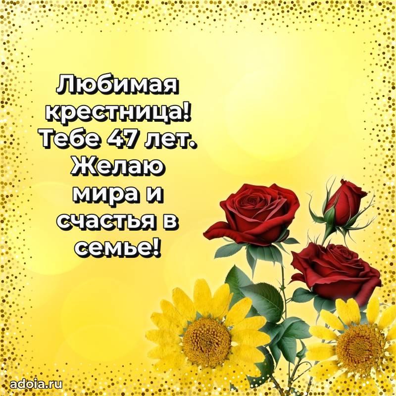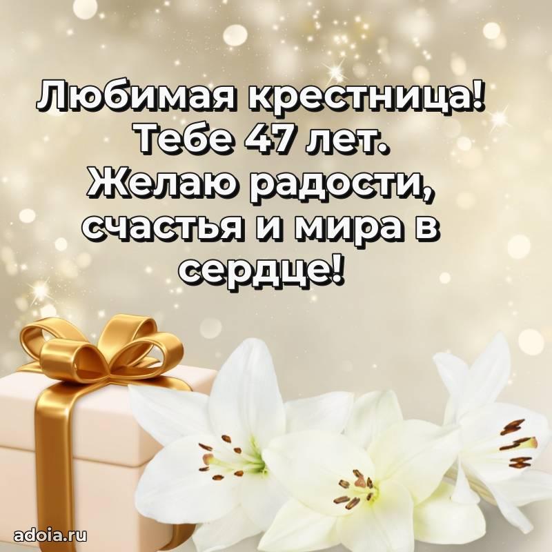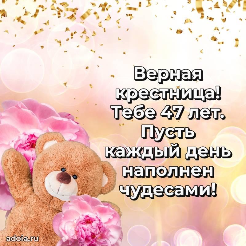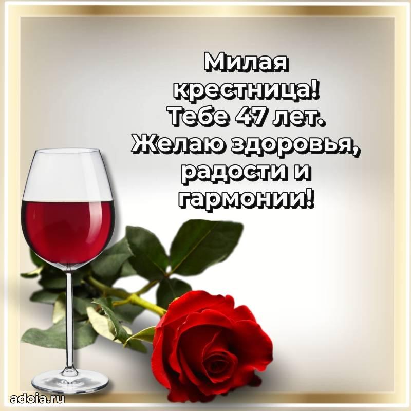 В поисках красивых и современных открыток? Вы попали по адресу! Здесь вы найдете картинки с днем рождения Крестнице на 47 лет! Все картинки в высоком качестве, которые можно скачать или отправить через WhatsApp бесплатно. Также вы найдете много прикольных и мерцающих гифок и анимаций, которые поднимут настроение! Все открытки содержат поздравления в стихах и прозе.