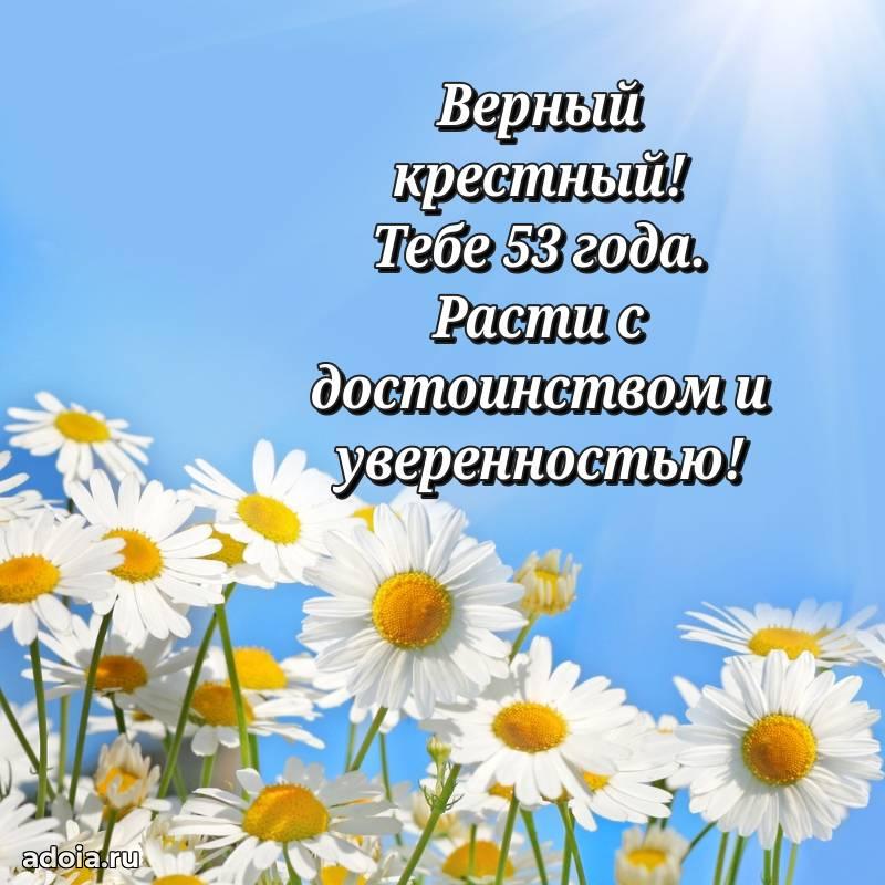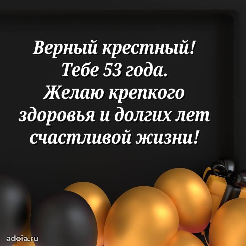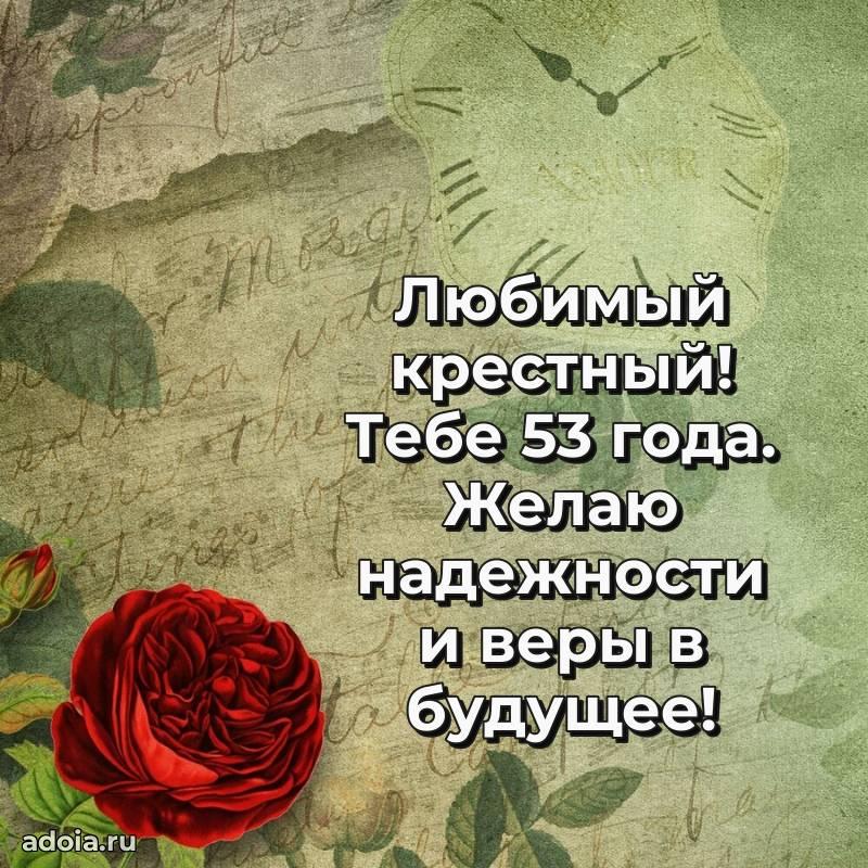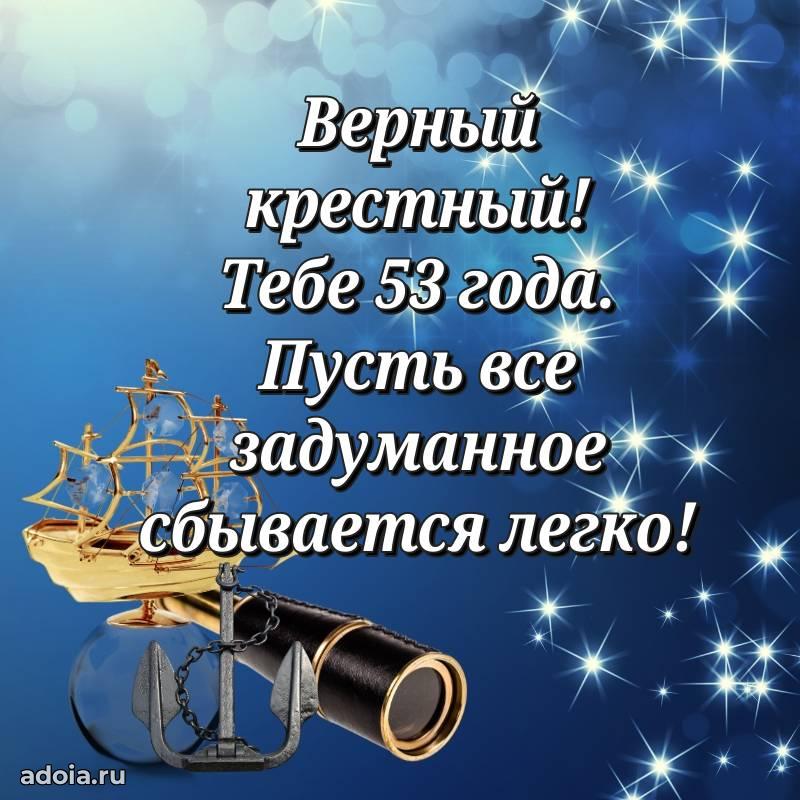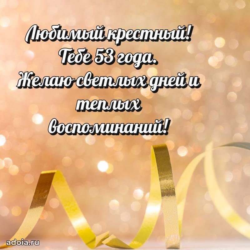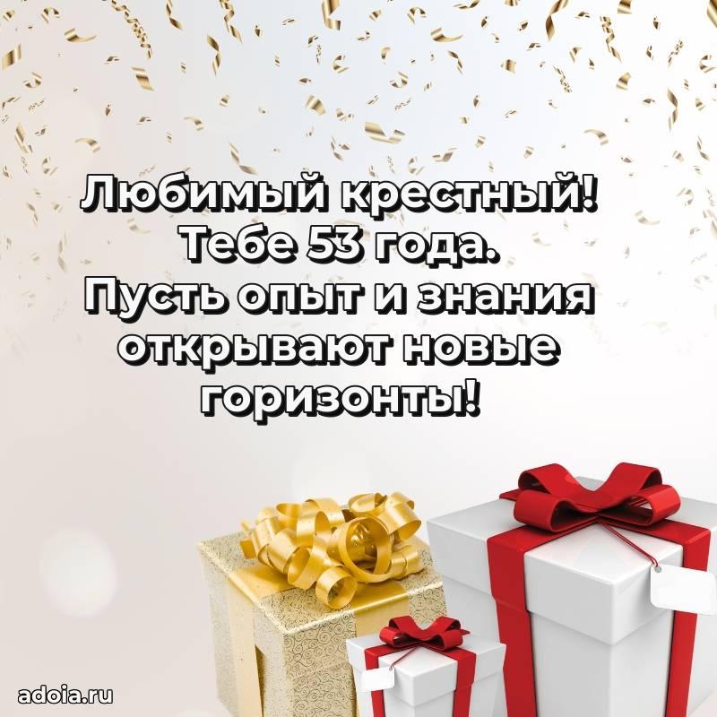 В поисках красивых и современных открыток? Вы попали по адресу! Здесь вы найдете картинки с днем рождения Крестному на 53 года! Все картинки в высоком качестве, которые можно скачать или отправить через WhatsApp бесплатно. Также вы найдете много прикольных и мерцающих гифок и анимаций, которые поднимут настроение! Все открытки содержат поздравления в стихах и прозе.