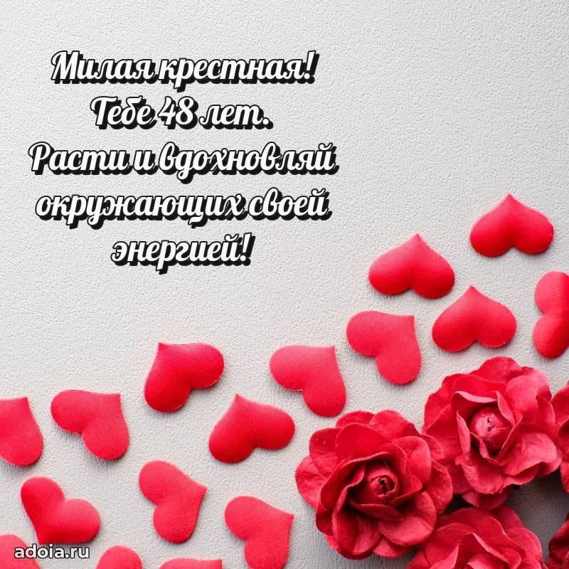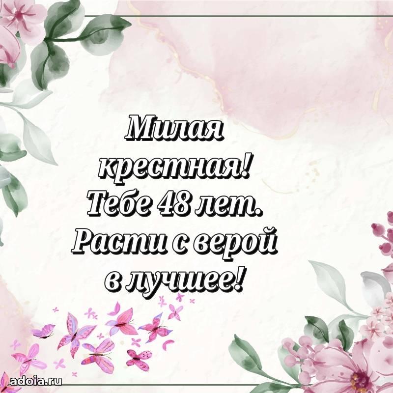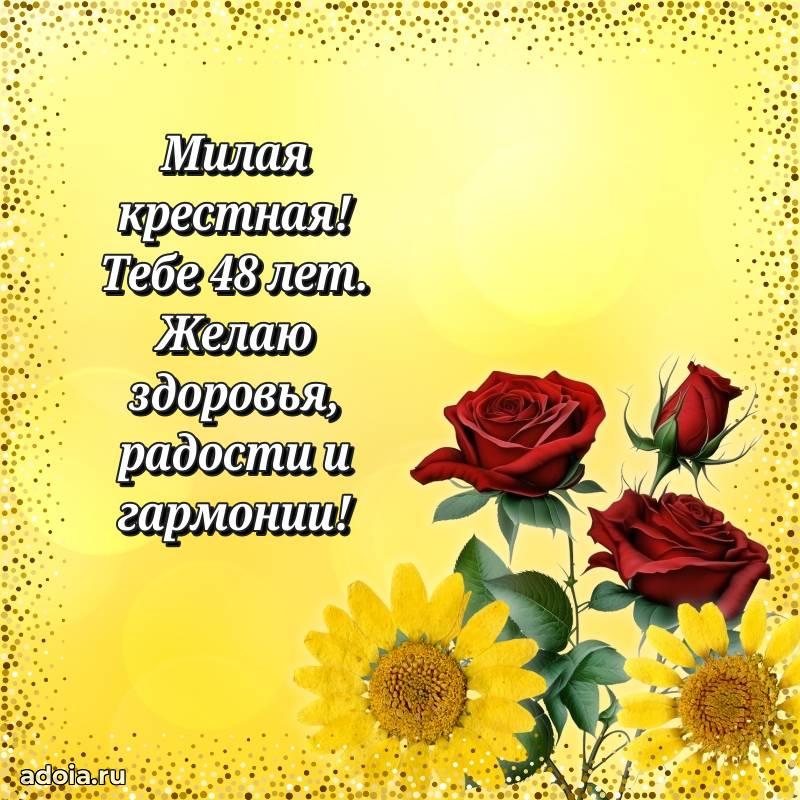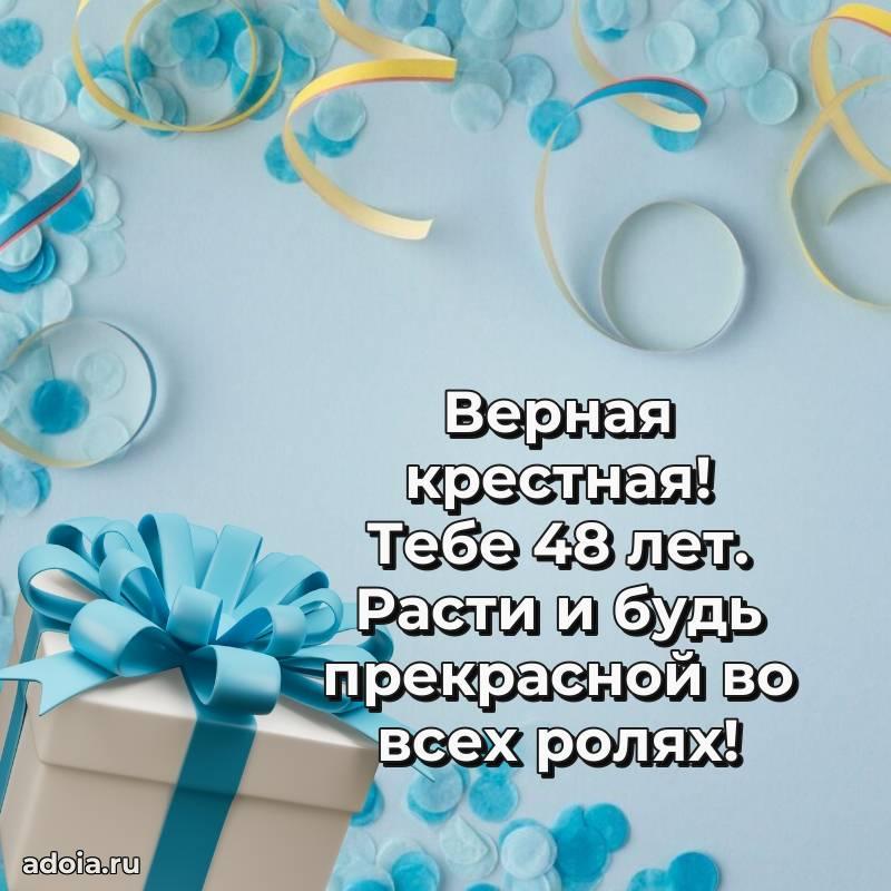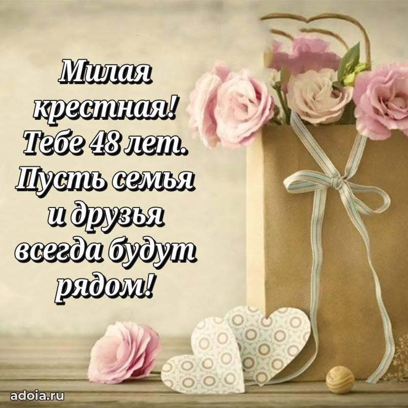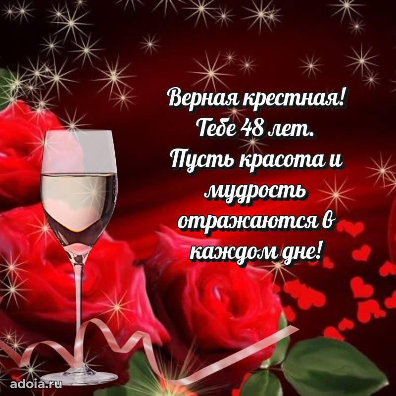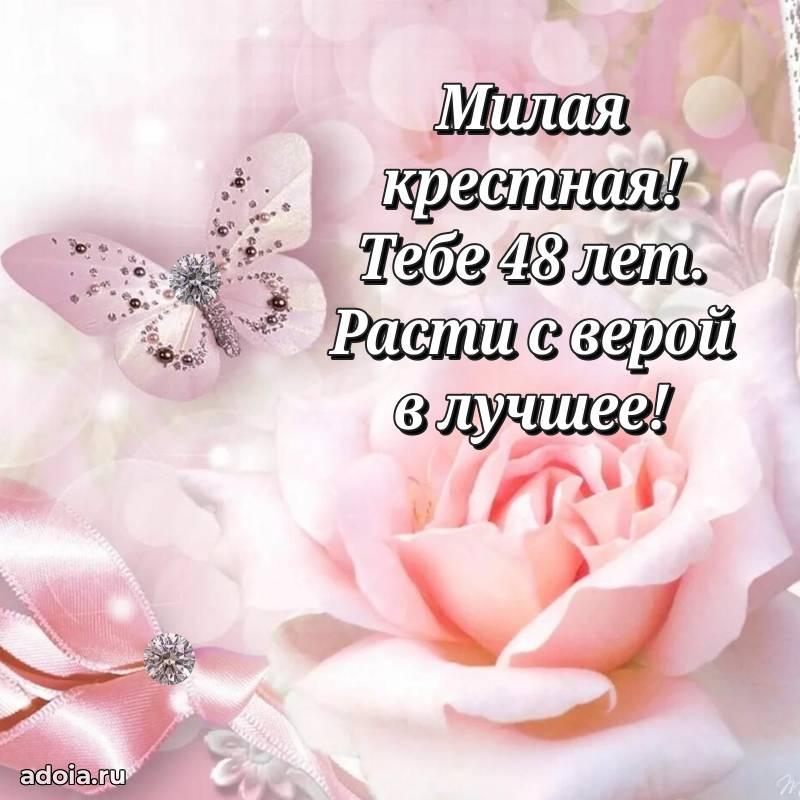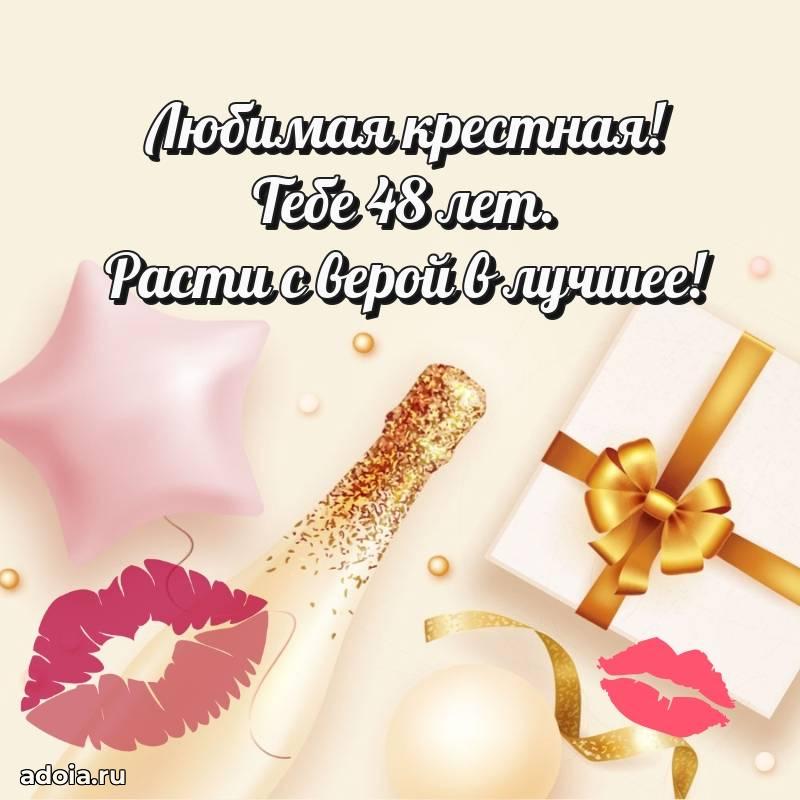 В поисках красивых и современных открыток? Вы попали по адресу! Здесь вы найдете картинки с днем рождения Крестной на 48 лет! Все картинки в высоком качестве, которые можно скачать или отправить через WhatsApp бесплатно. Также вы найдете много прикольных и мерцающих гифок и анимаций, которые поднимут настроение! Все открытки содержат поздравления в стихах и прозе.