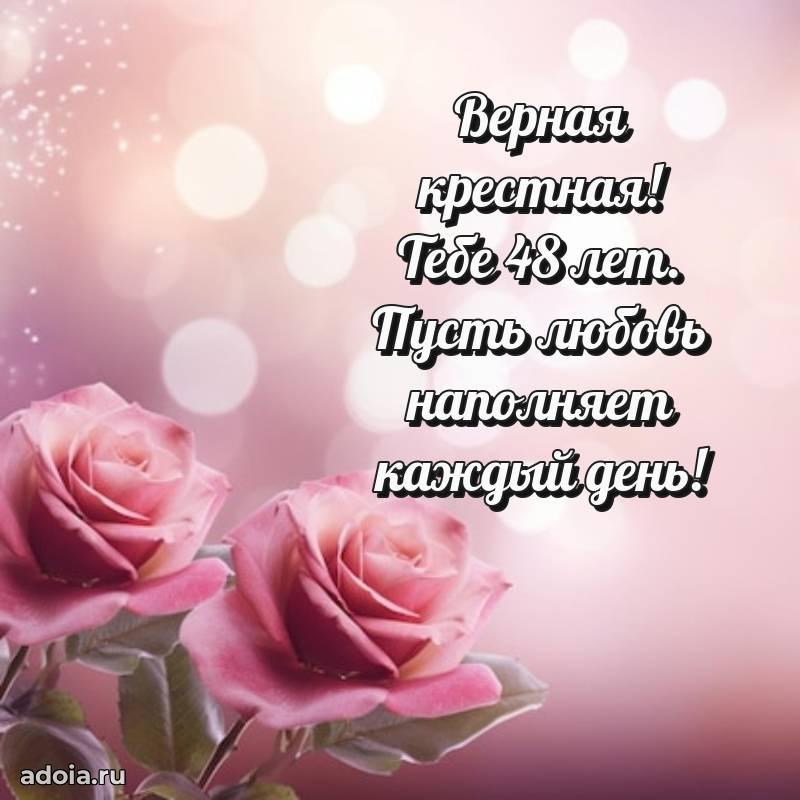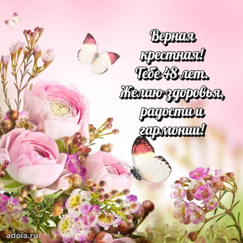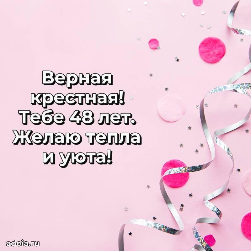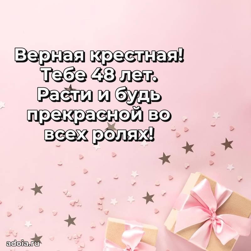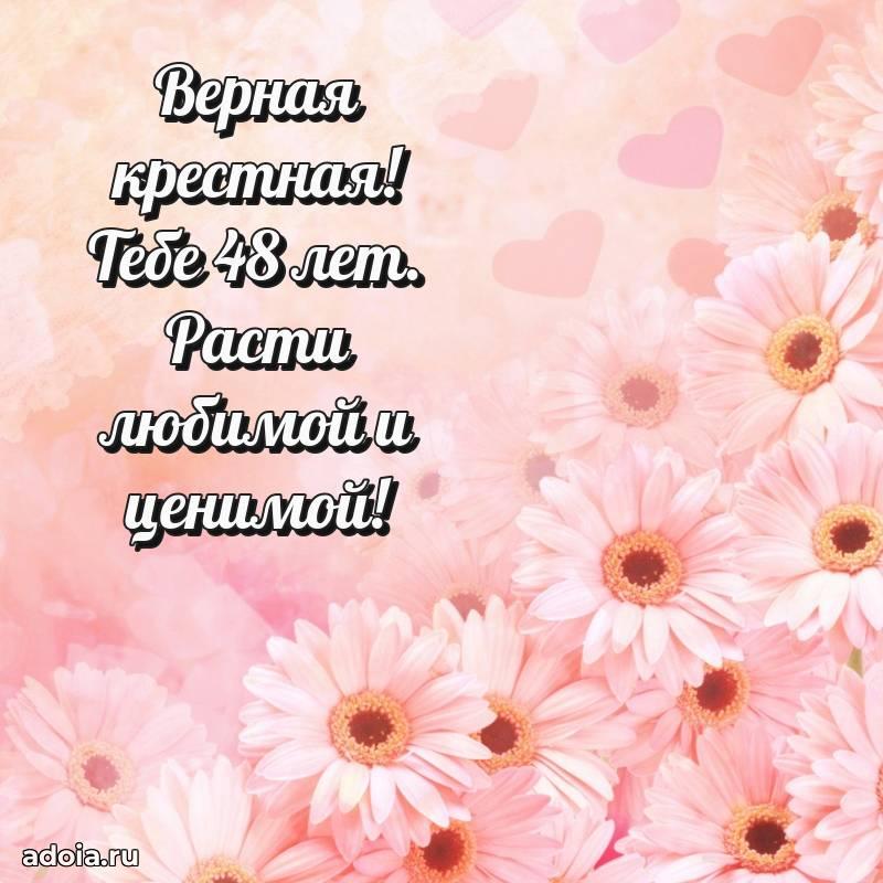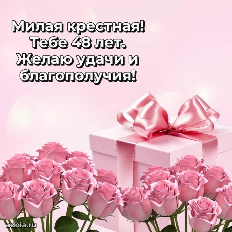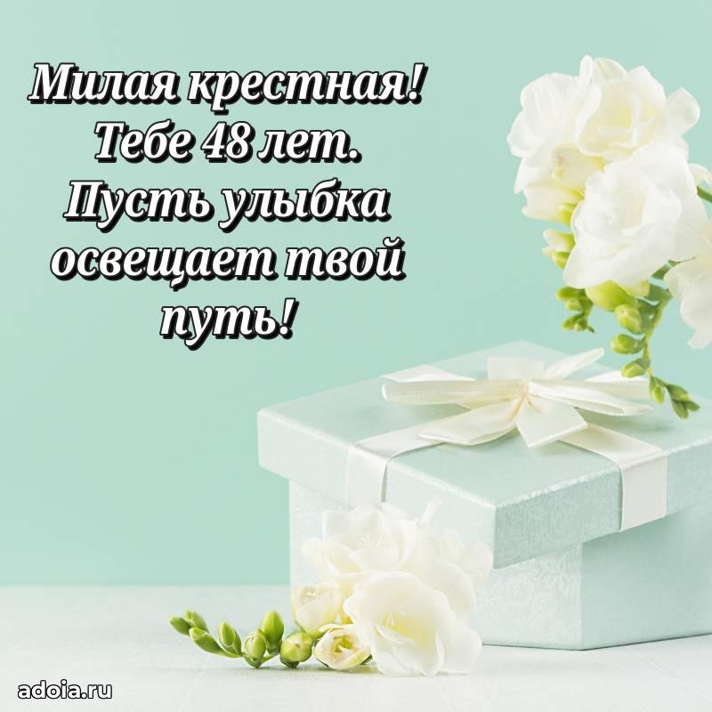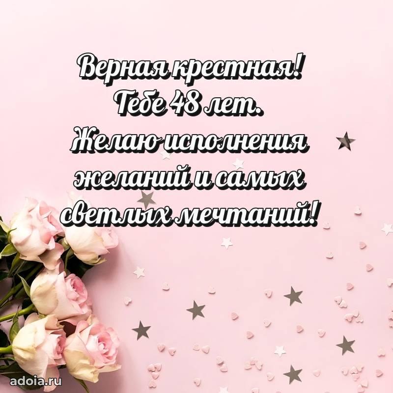 В поисках красивых и современных открыток? Вы попали по адресу! Здесь вы найдете картинки с днем рождения Крестной на 48 лет! Все картинки в высоком качестве, которые можно скачать или отправить через WhatsApp бесплатно. Также вы найдете много прикольных и мерцающих гифок и анимаций, которые поднимут настроение! Все открытки содержат поздравления в стихах и прозе.