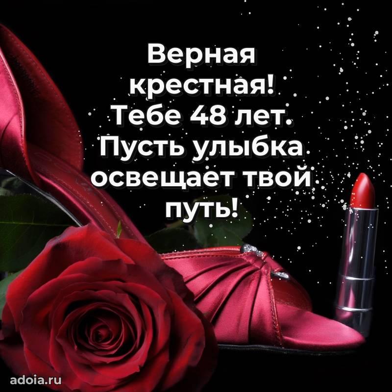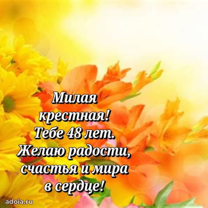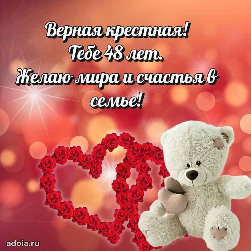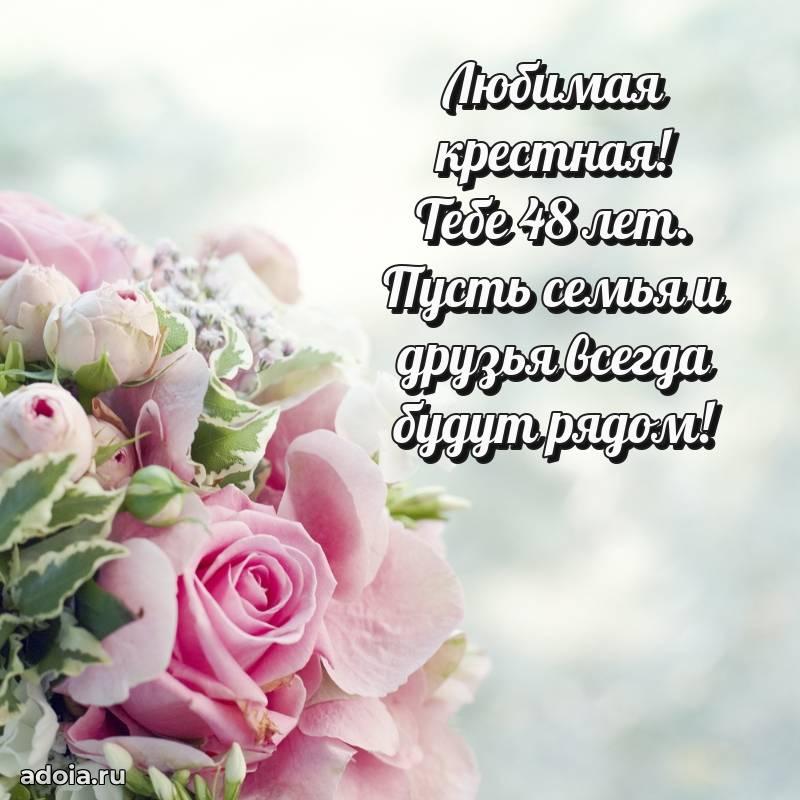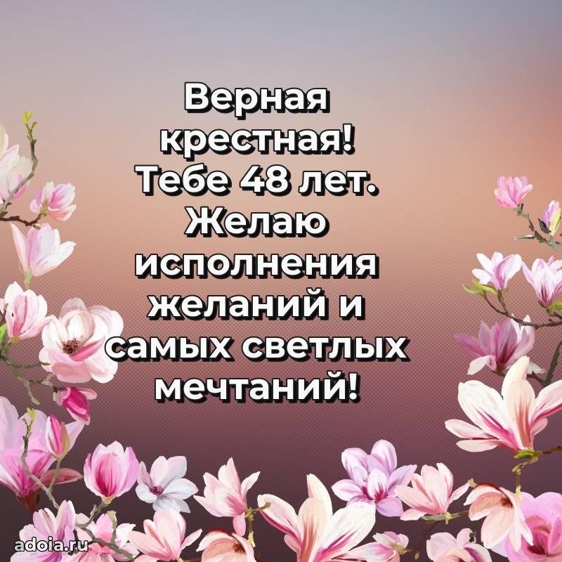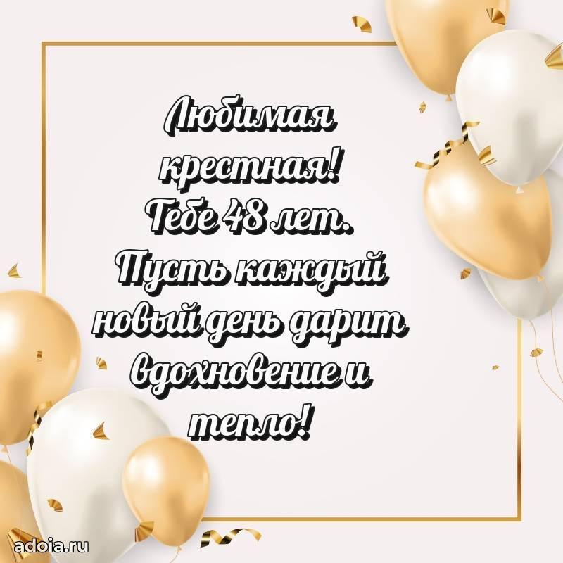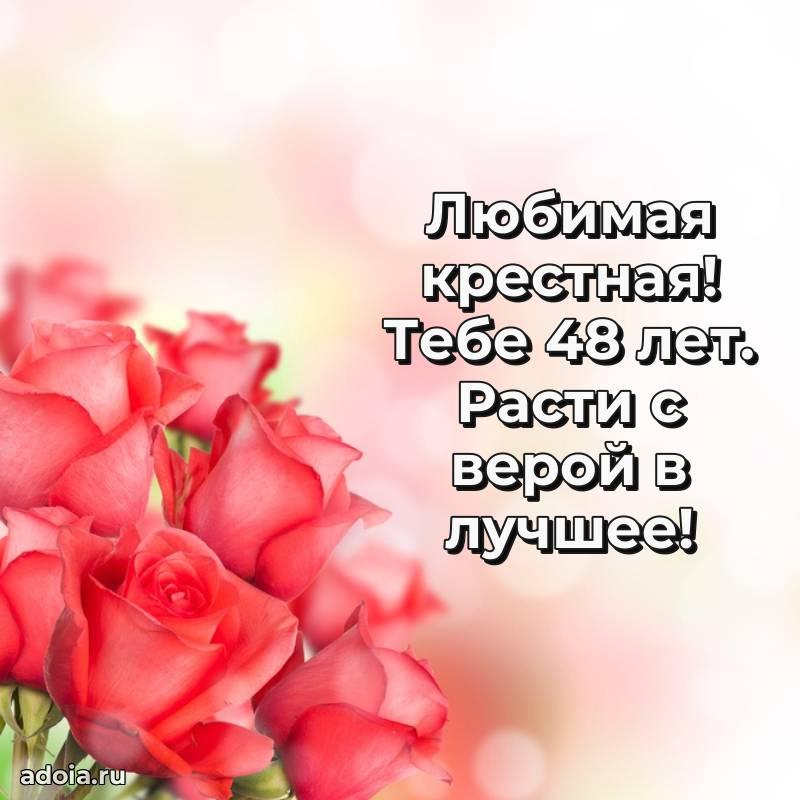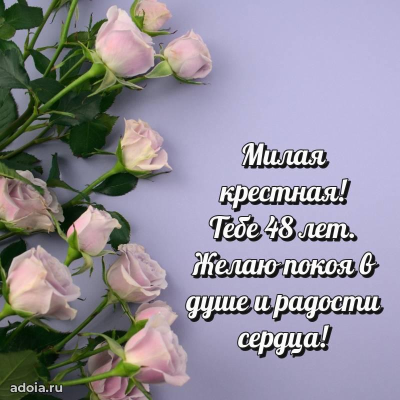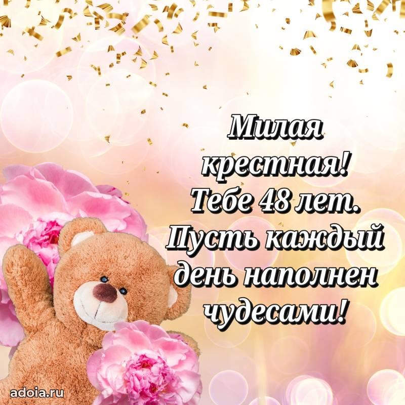 В поисках красивых и современных открыток? Вы попали по адресу! Здесь вы найдете картинки с днем рождения Крестной на 48 лет! Все картинки в высоком качестве, которые можно скачать или отправить через WhatsApp бесплатно. Также вы найдете много прикольных и мерцающих гифок и анимаций, которые поднимут настроение! Все открытки содержат поздравления в стихах и прозе.