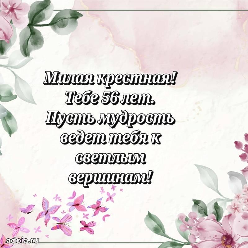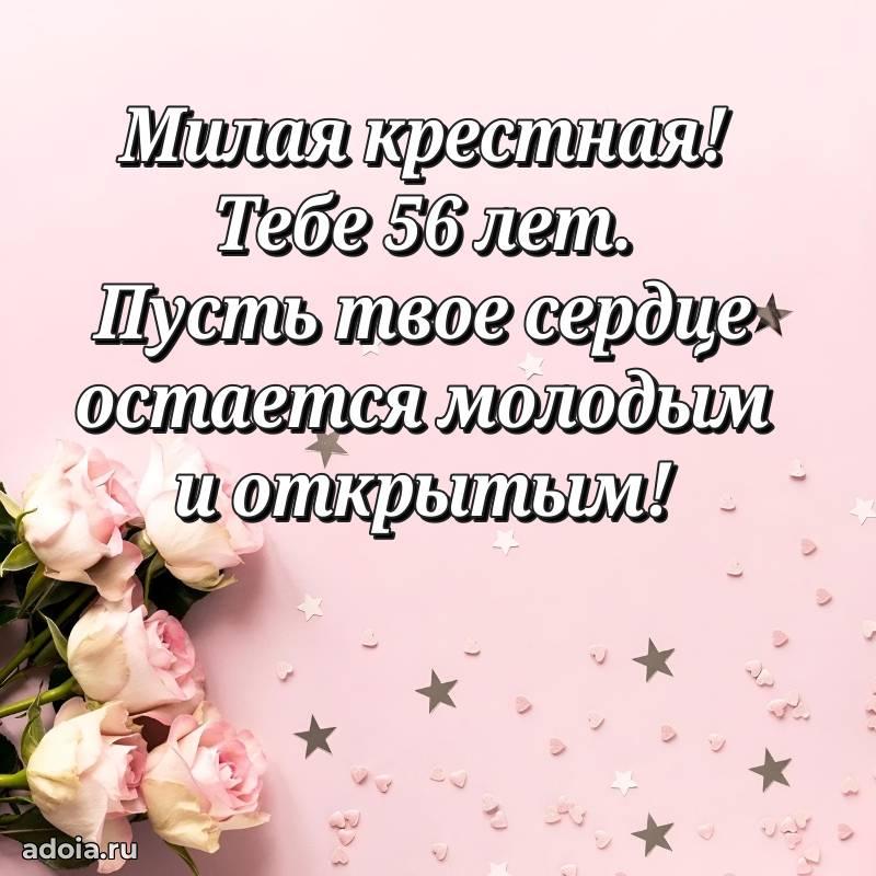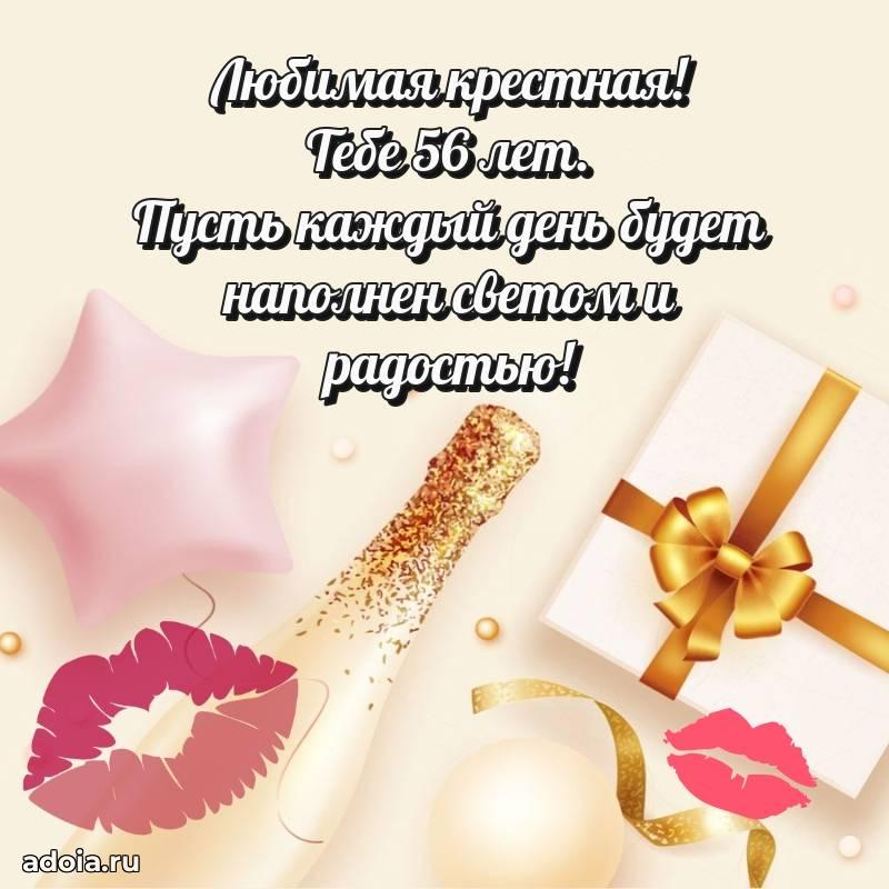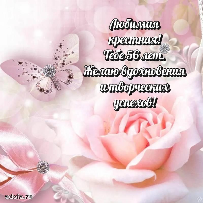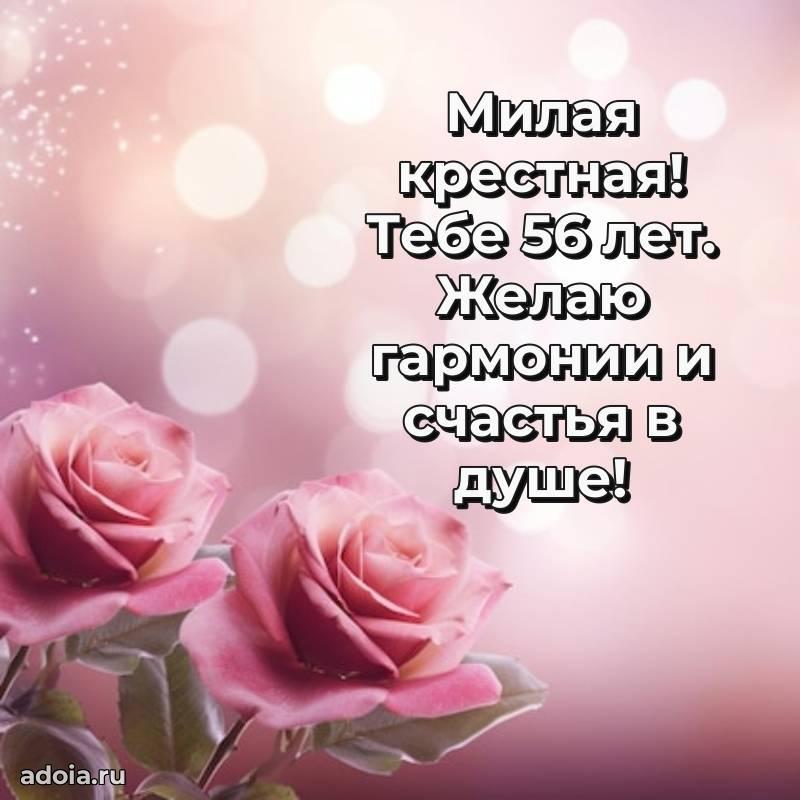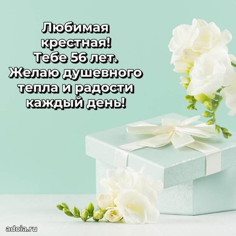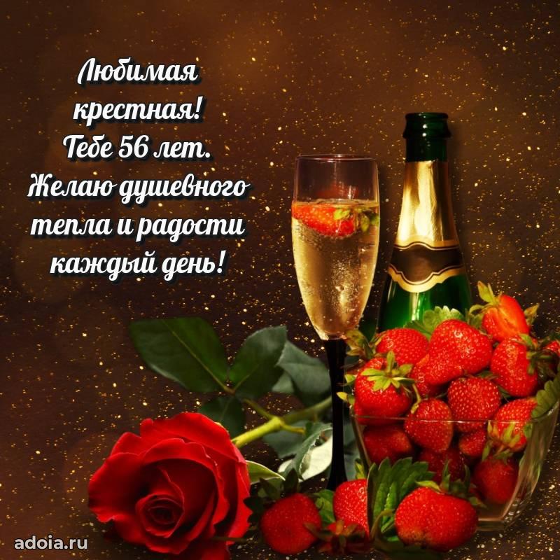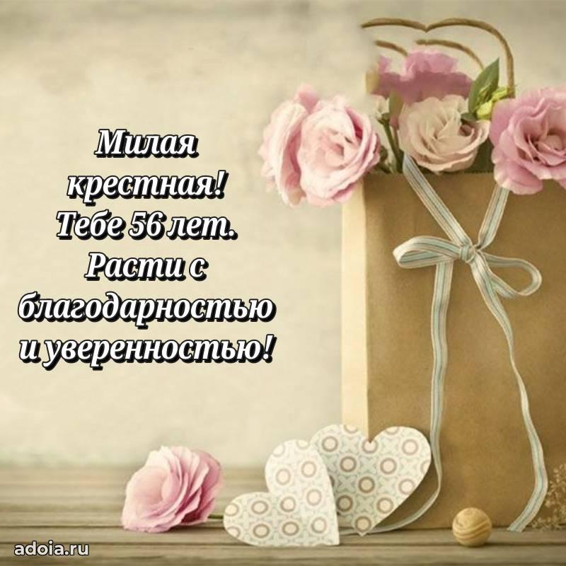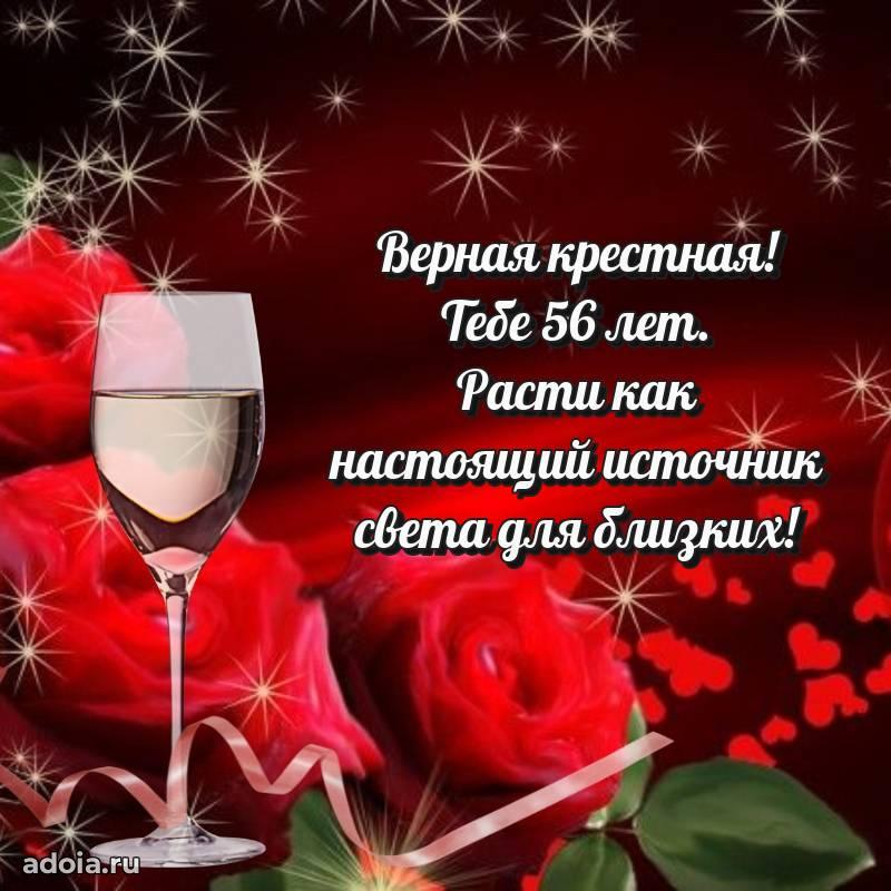 В поисках красивых и современных открыток? Вы попали по адресу! Здесь вы найдете картинки с днем рождения Крестной на 56 лет! Все картинки в высоком качестве, которые можно скачать или отправить через WhatsApp бесплатно. Также вы найдете много прикольных и мерцающих гифок и анимаций, которые поднимут настроение! Все открытки содержат поздравления в стихах и прозе.