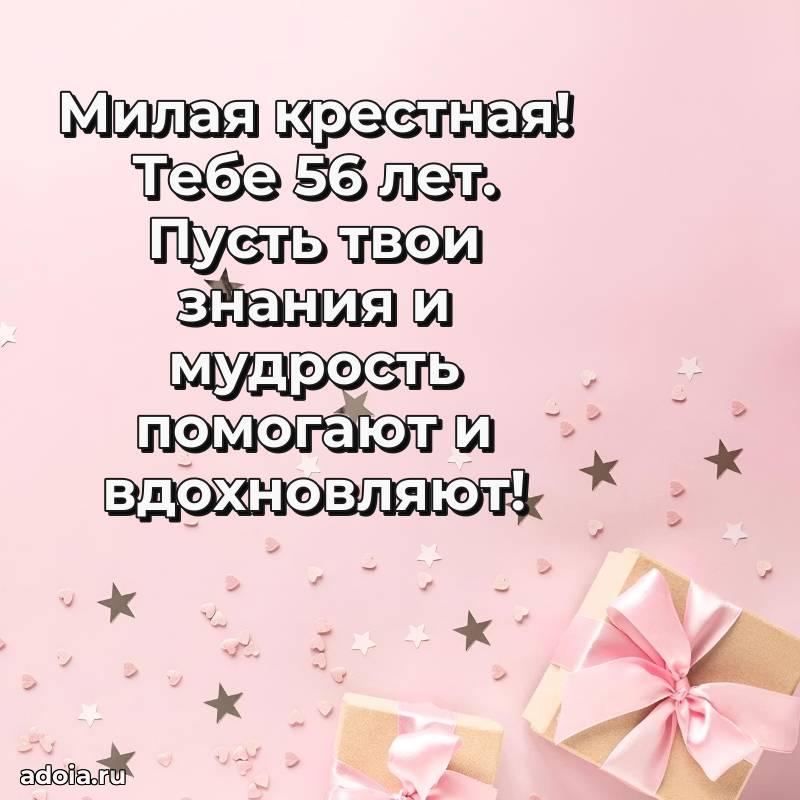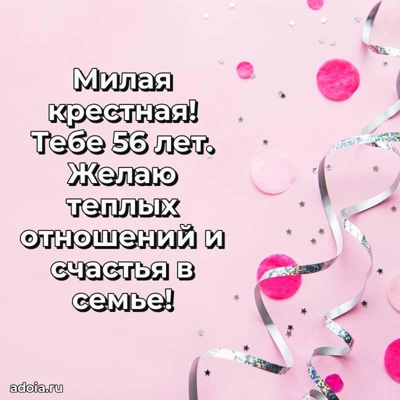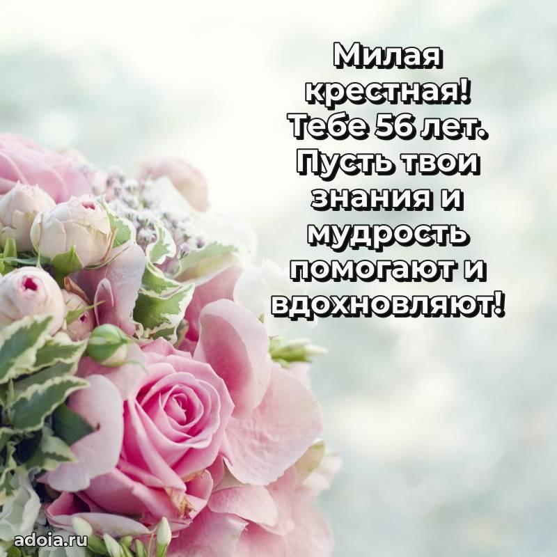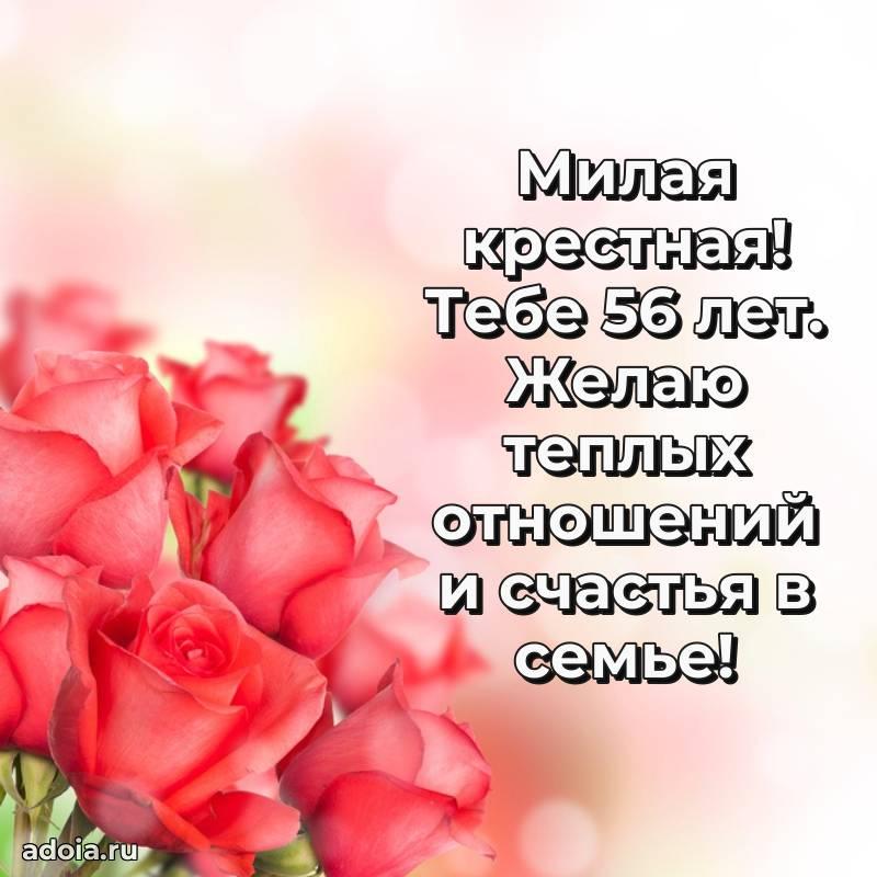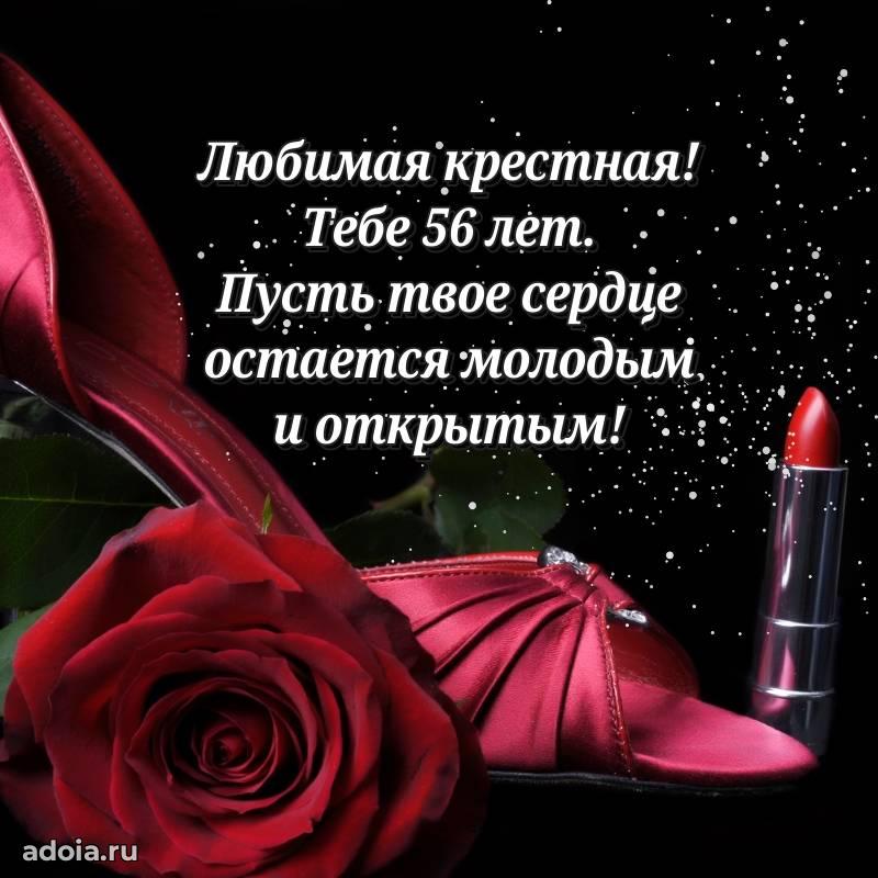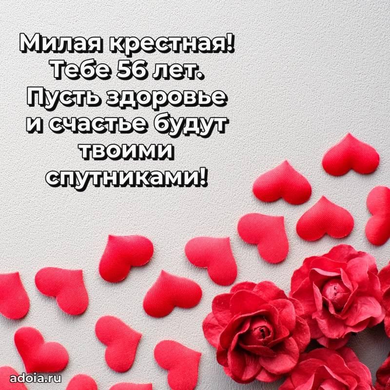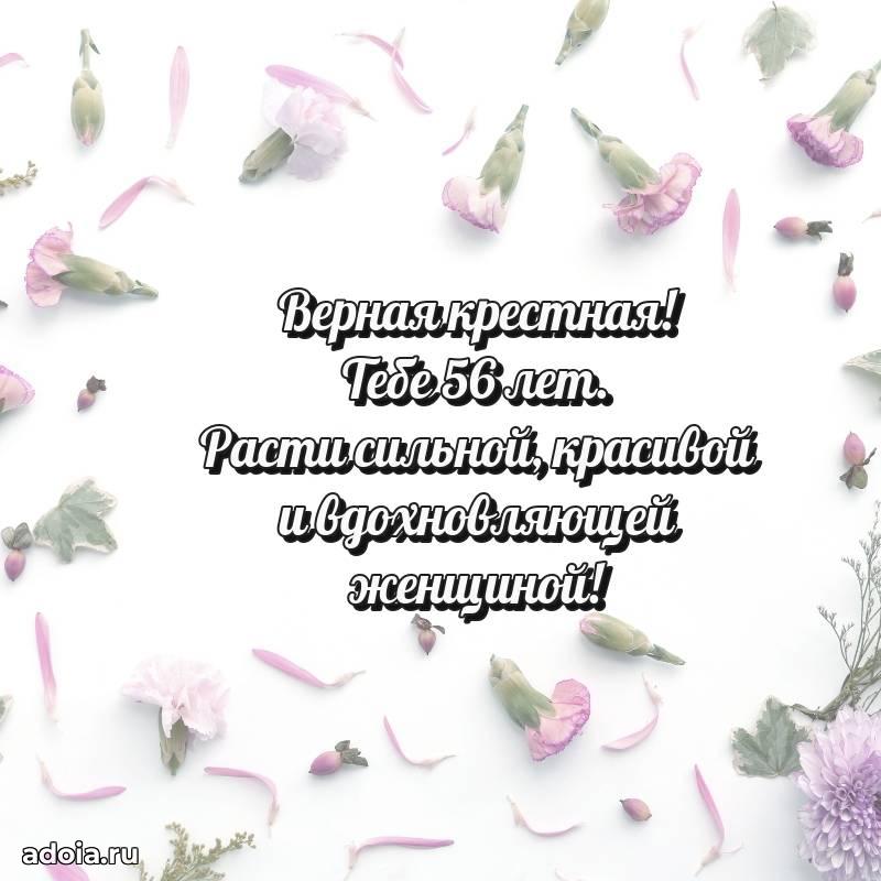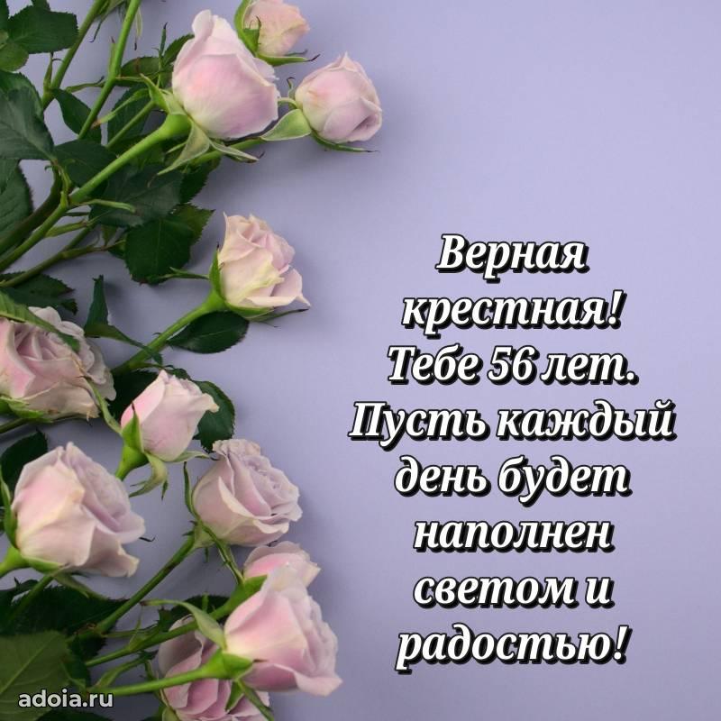 В поисках красивых и современных открыток? Вы попали по адресу! Здесь вы найдете картинки с днем рождения Крестной на 56 лет! Все картинки в высоком качестве, которые можно скачать или отправить через WhatsApp бесплатно. Также вы найдете много прикольных и мерцающих гифок и анимаций, которые поднимут настроение! Все открытки содержат поздравления в стихах и прозе.