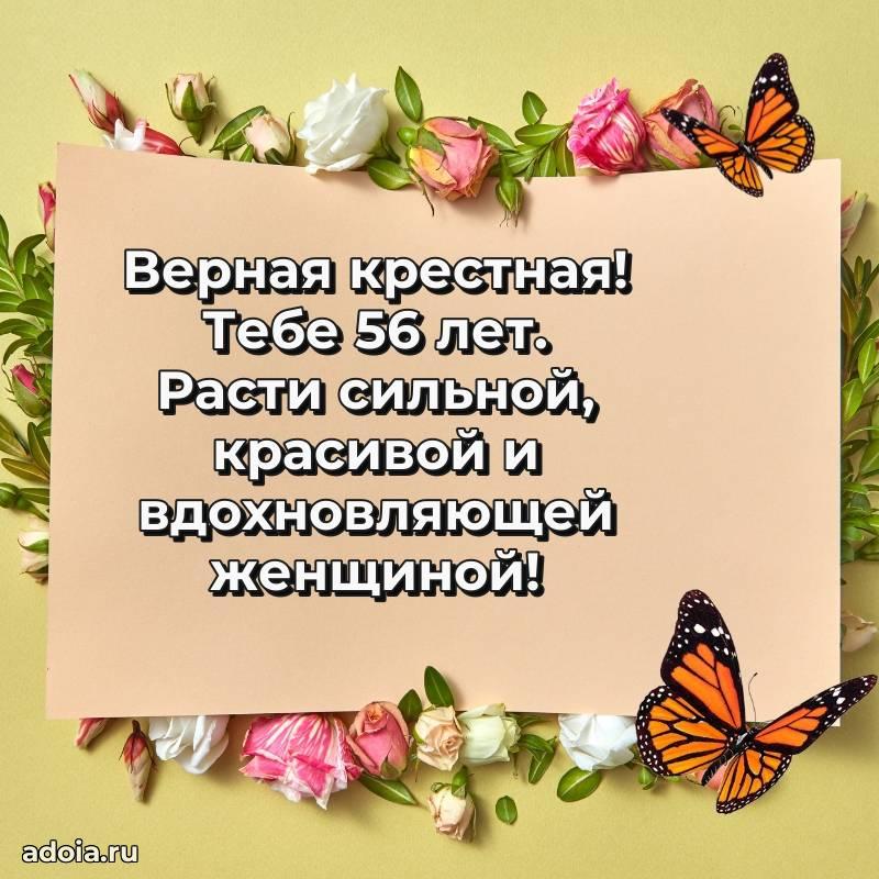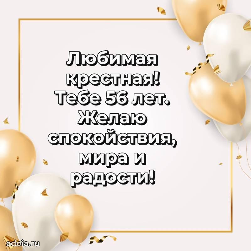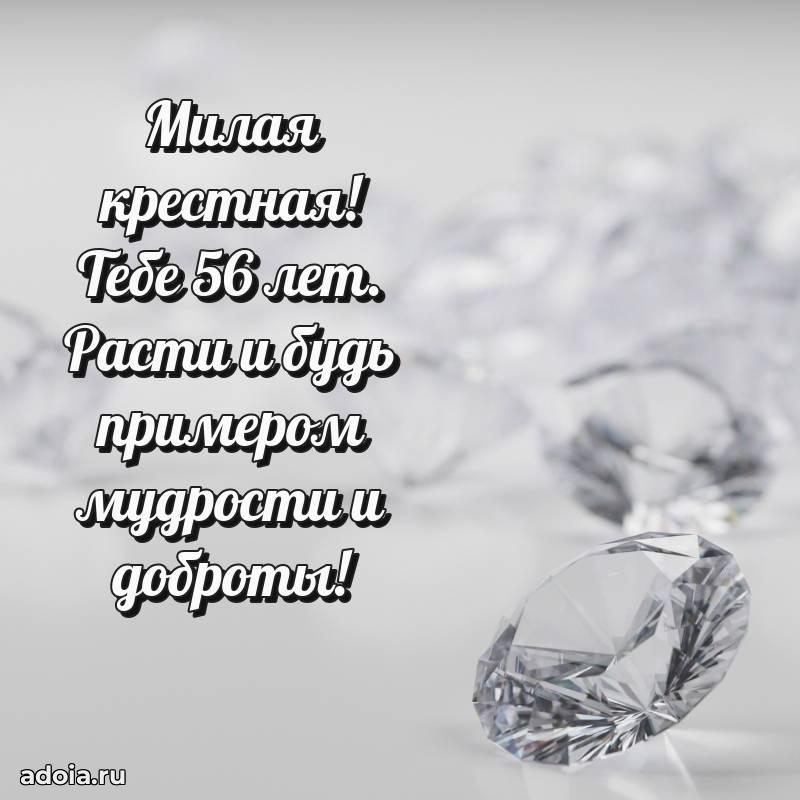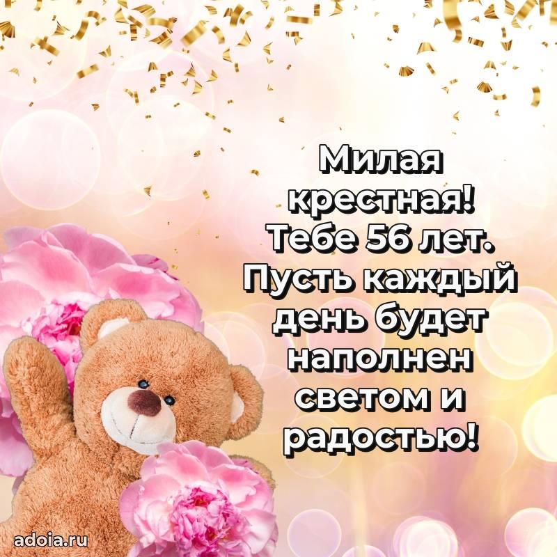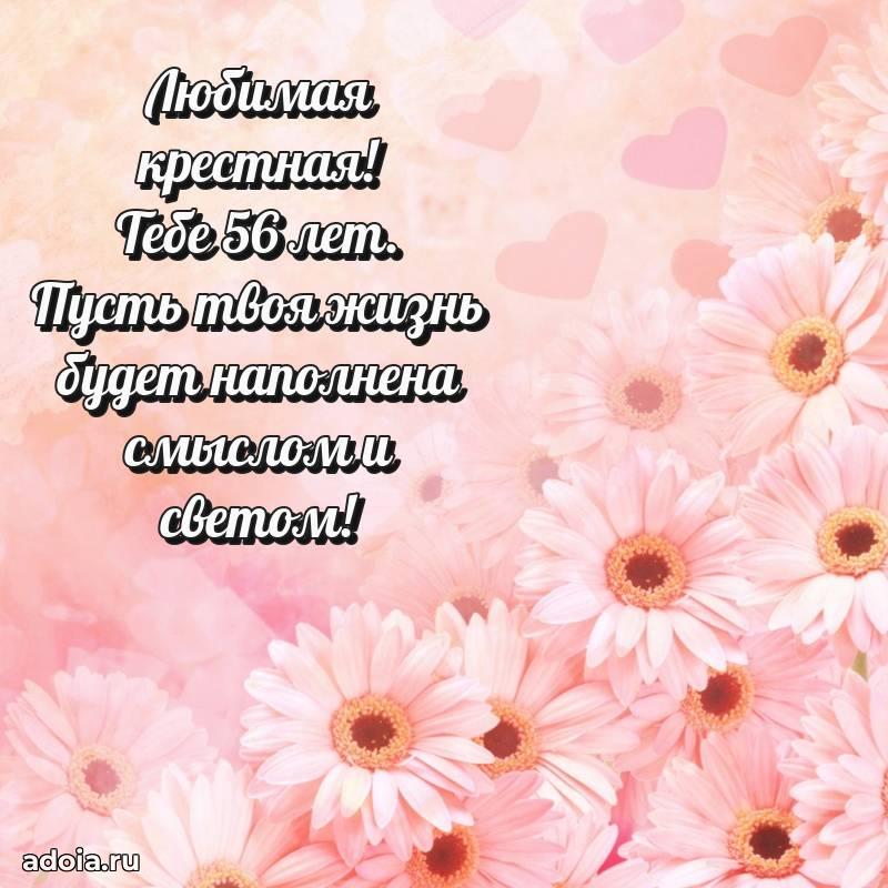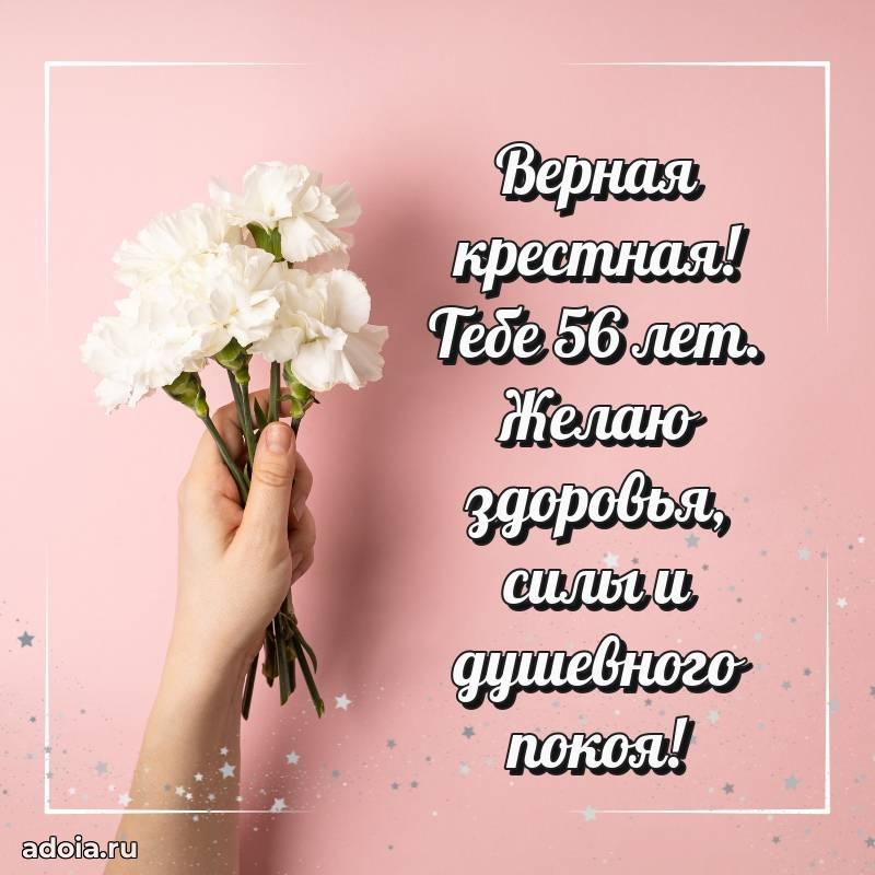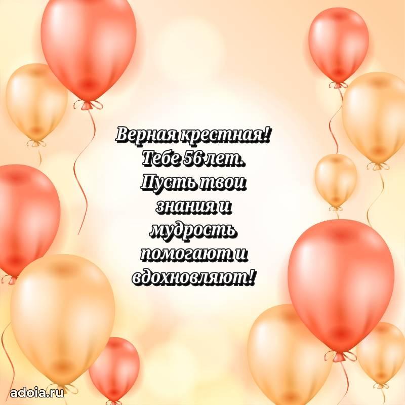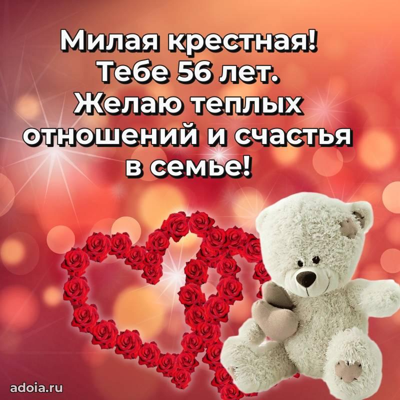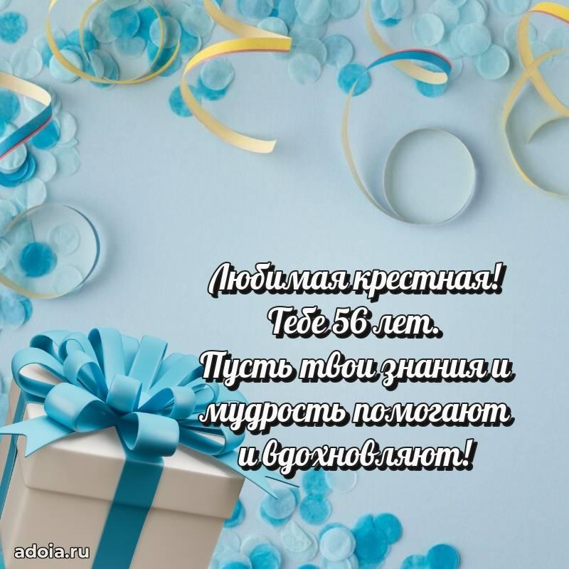 В поисках красивых и современных открыток? Вы попали по адресу! Здесь вы найдете картинки с днем рождения Крестной на 56 лет! Все картинки в высоком качестве, которые можно скачать или отправить через WhatsApp бесплатно. Также вы найдете много прикольных и мерцающих гифок и анимаций, которые поднимут настроение! Все открытки содержат поздравления в стихах и прозе.