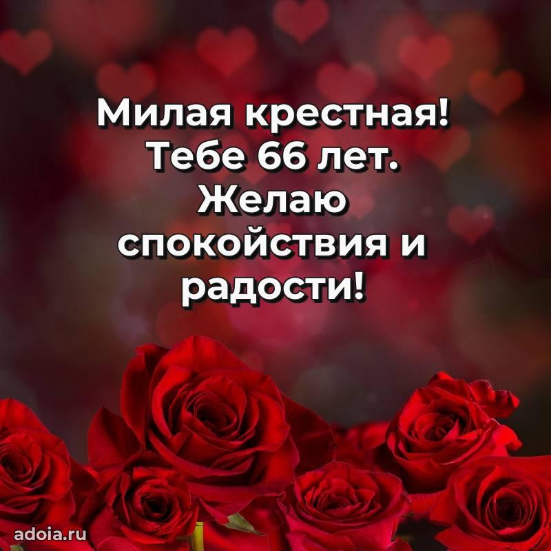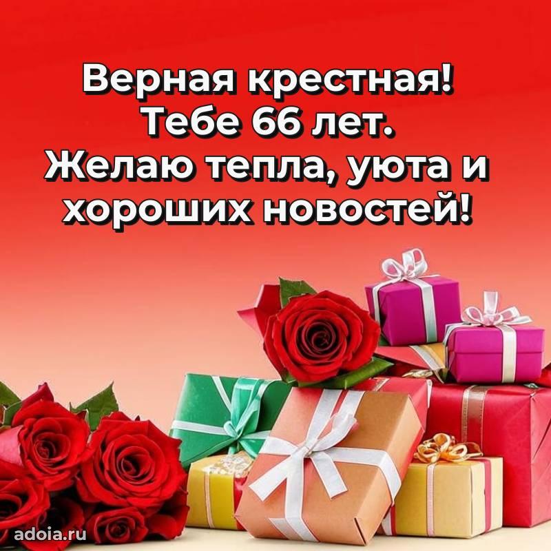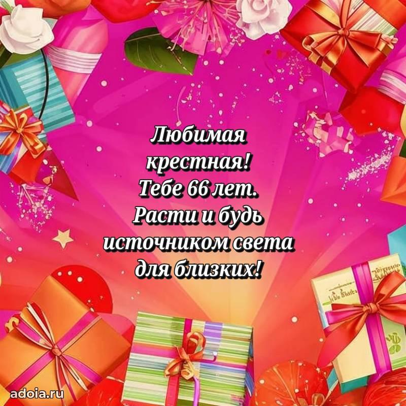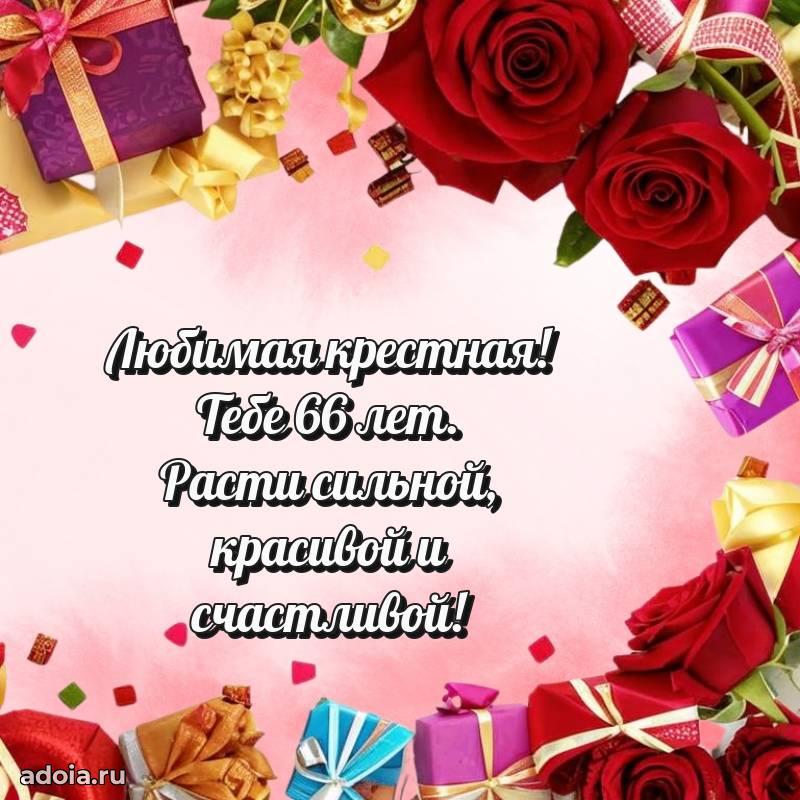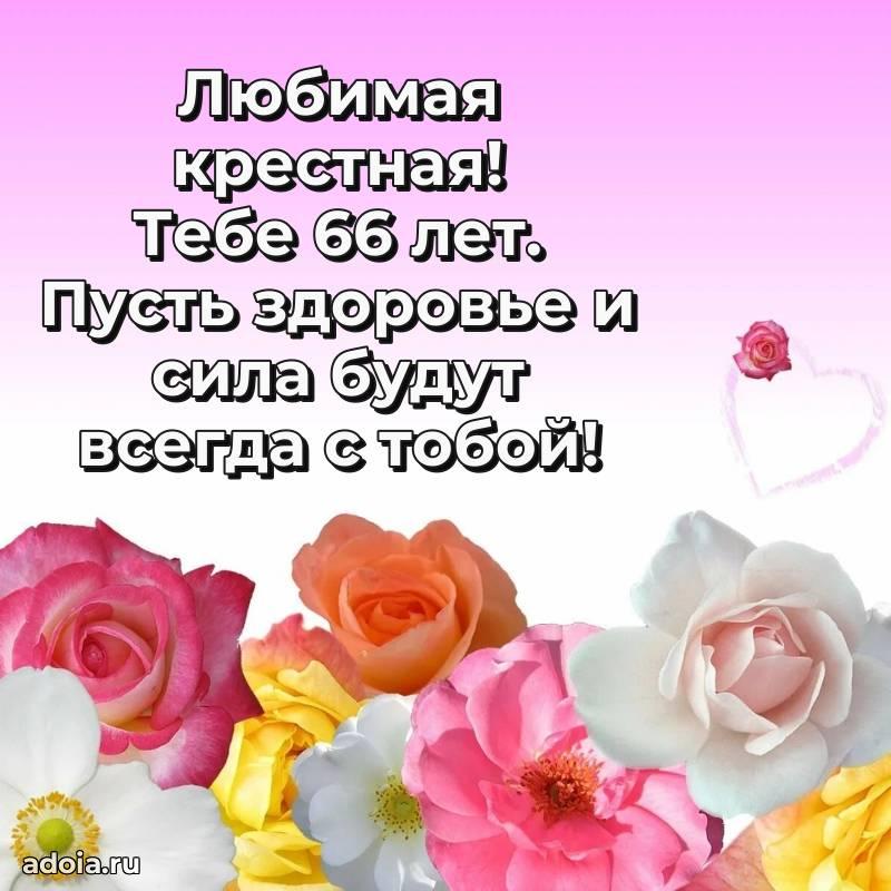 В поисках красивых и современных открыток? Вы попали по адресу! Здесь вы найдете картинки с днем рождения Крестной на 66 лет! Все картинки в высоком качестве, которые можно скачать или отправить через WhatsApp бесплатно. Также вы найдете много прикольных и мерцающих гифок и анимаций, которые поднимут настроение! Все открытки содержат поздравления в стихах и прозе.
