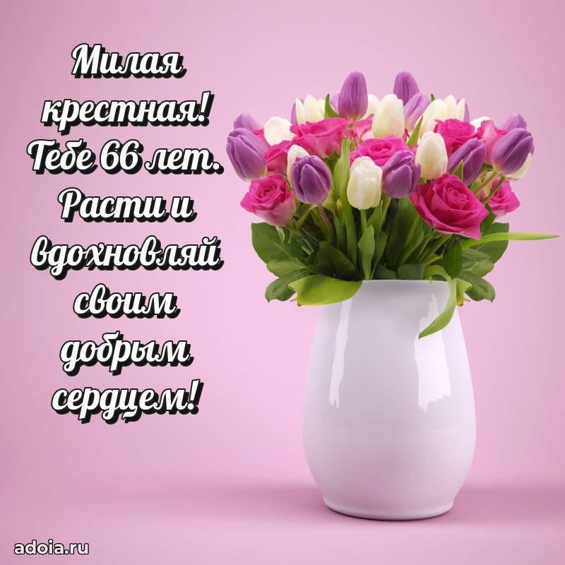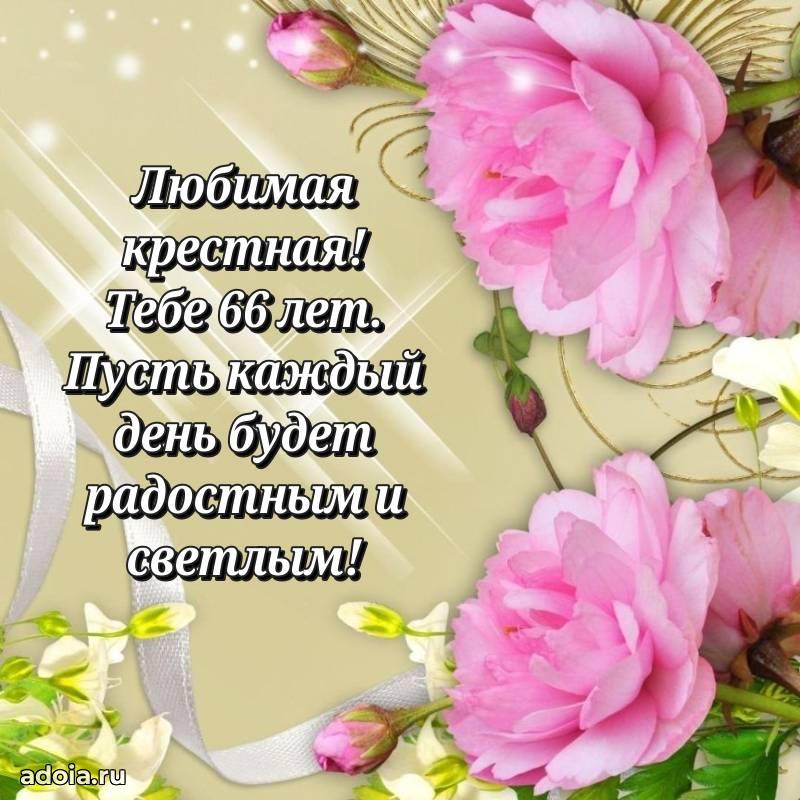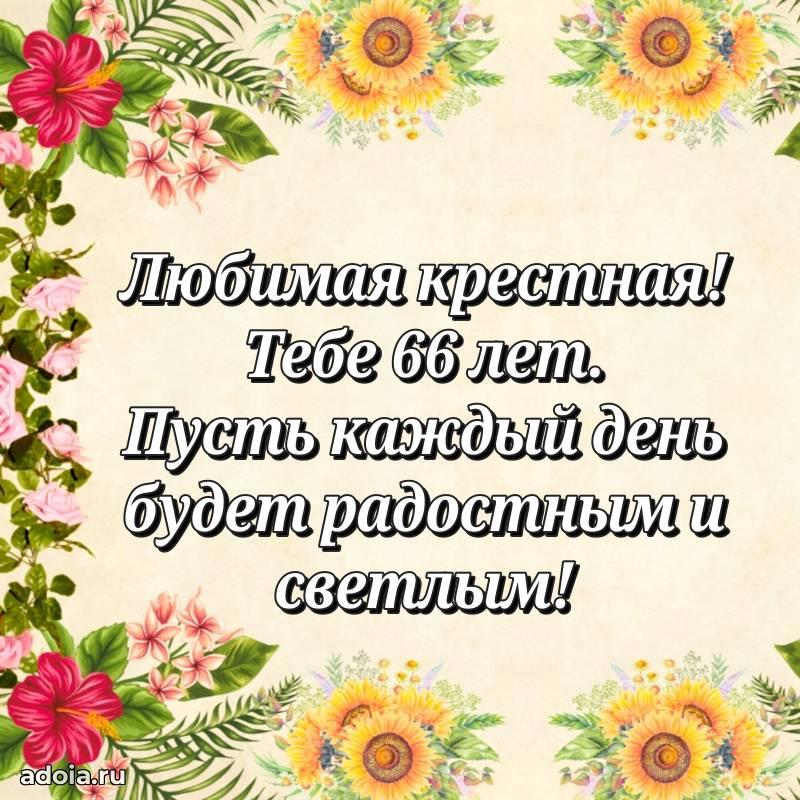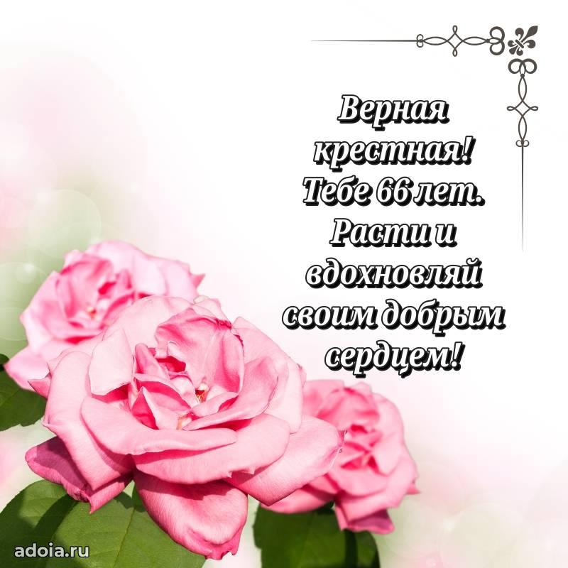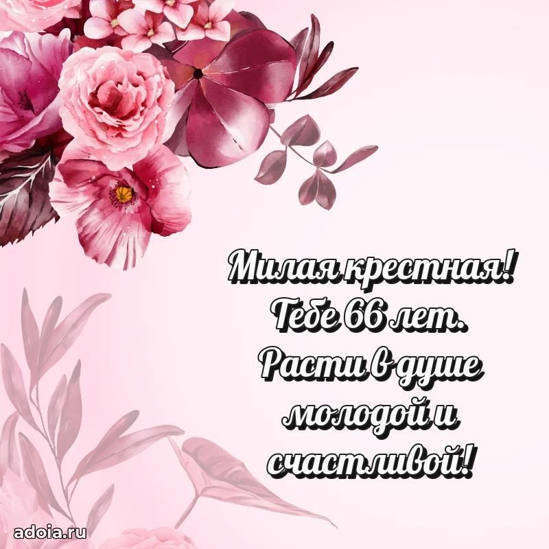 В поисках красивых и современных открыток? Вы попали по адресу! Здесь вы найдете картинки с днем рождения Крестной на 66 лет! Все картинки в высоком качестве, которые можно скачать или отправить через WhatsApp бесплатно. Также вы найдете много прикольных и мерцающих гифок и анимаций, которые поднимут настроение! Все открытки содержат поздравления в стихах и прозе.