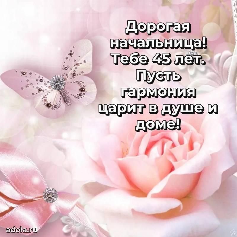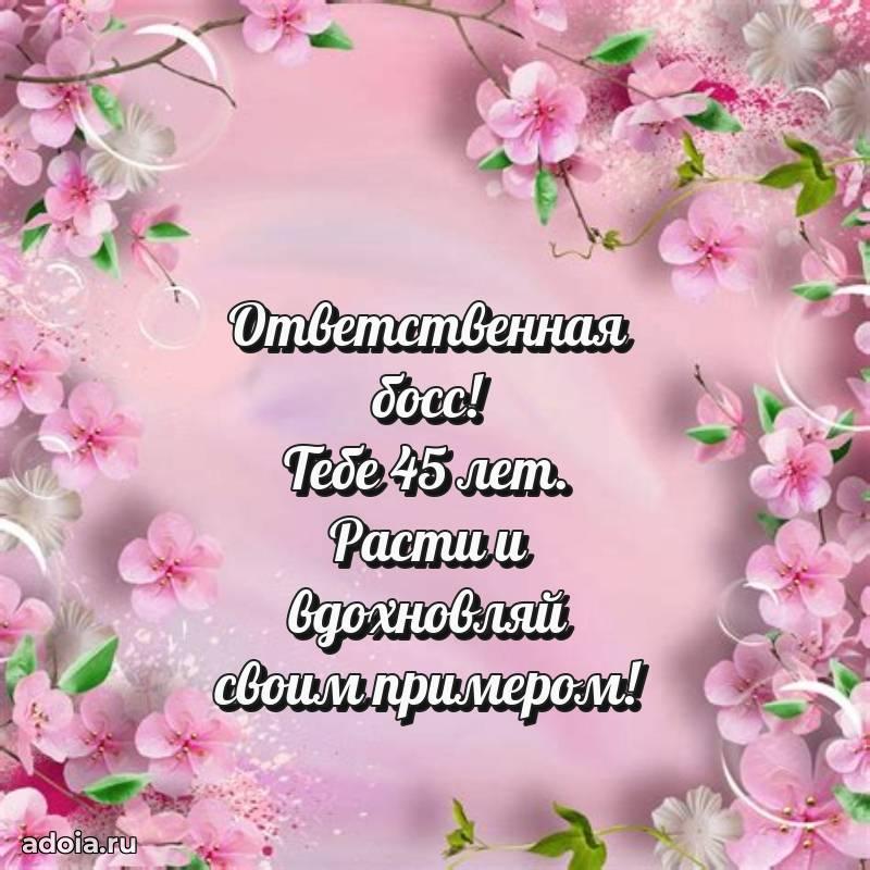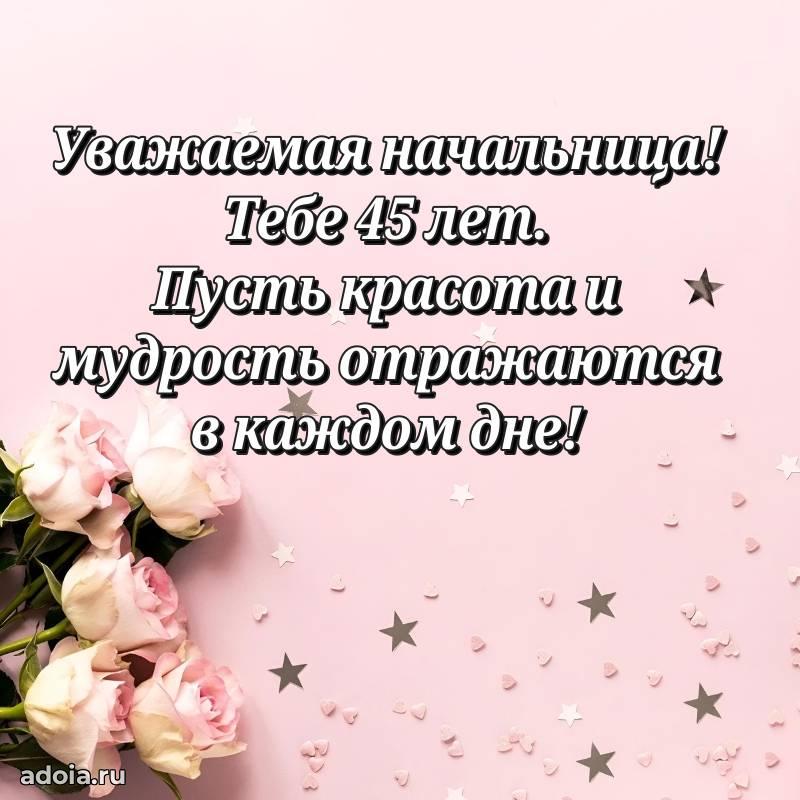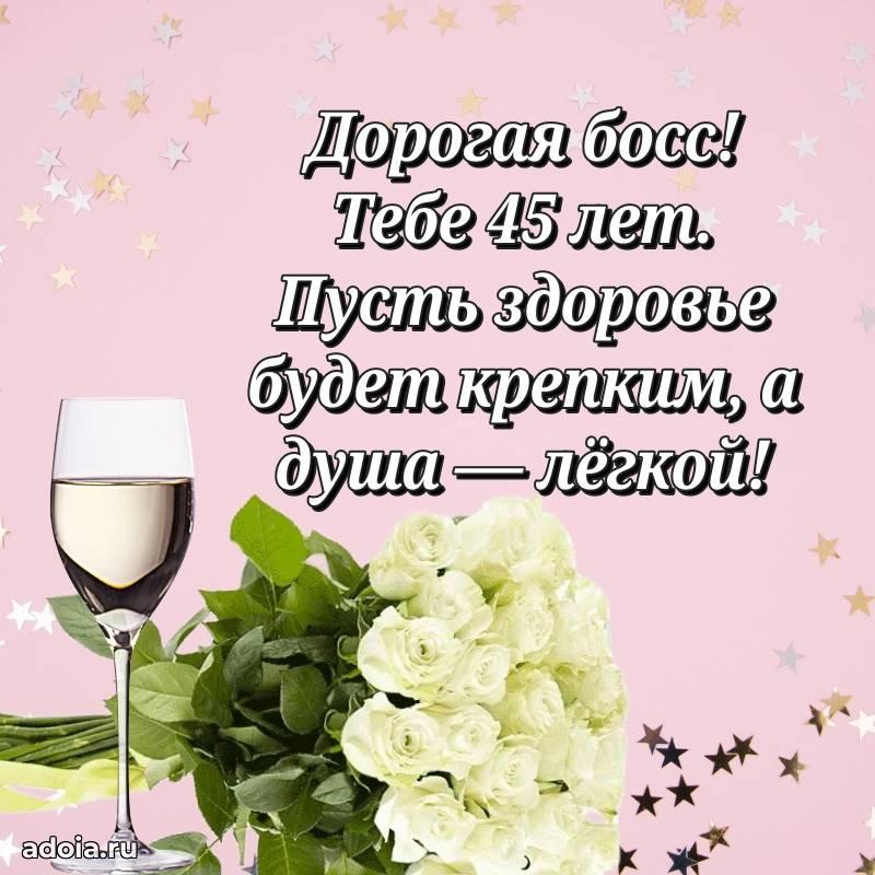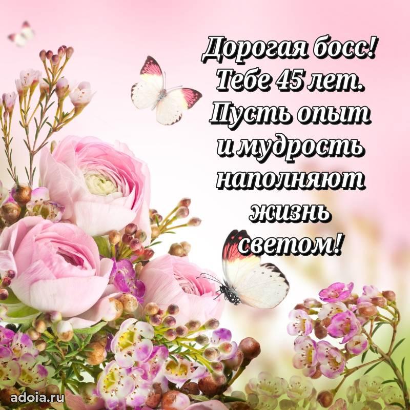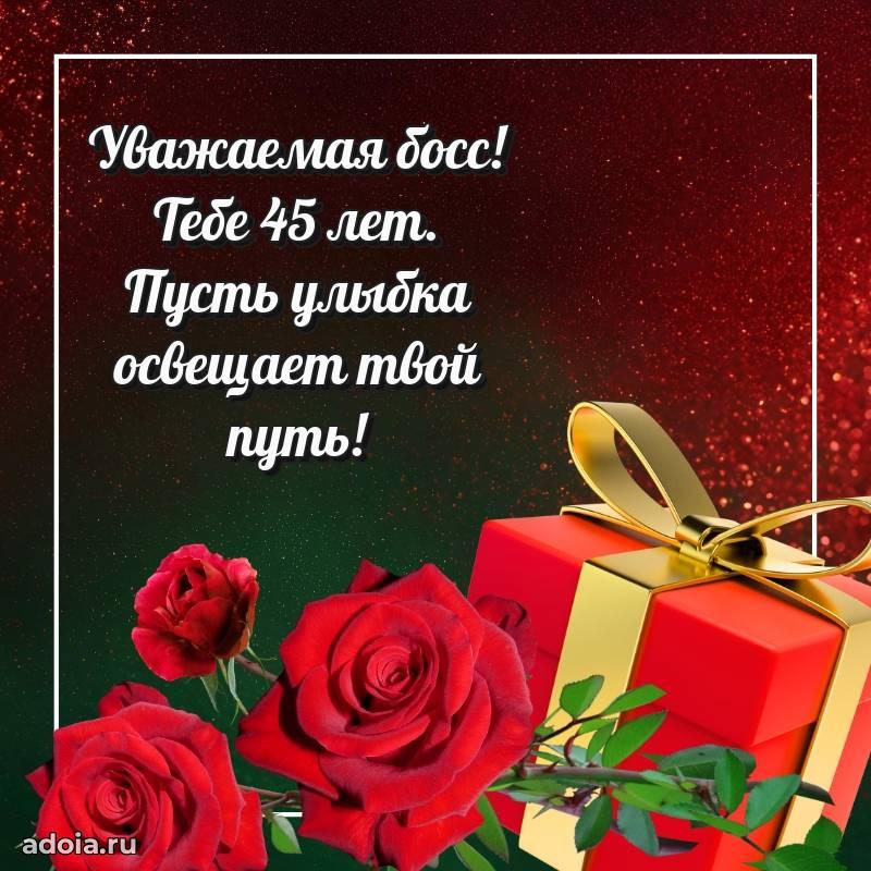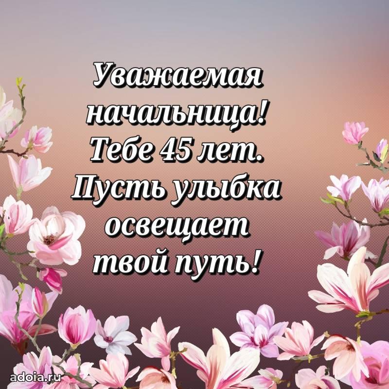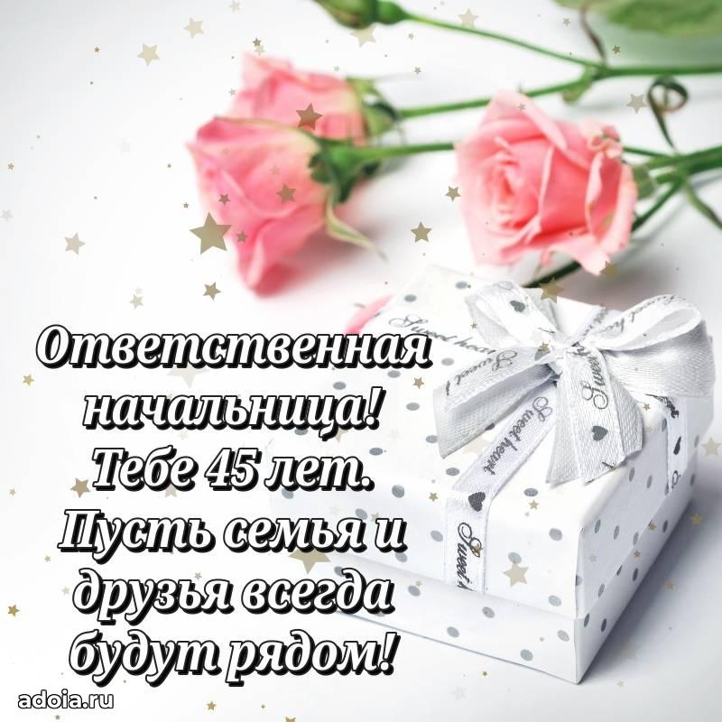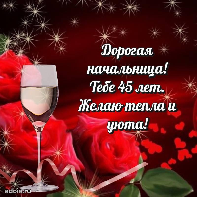 В поисках красивых и современных открыток? Вы попали по адресу! Здесь вы найдете картинки с днем рождения Начальнице на 45 лет! Все картинки в высоком качестве, которые можно скачать или отправить через WhatsApp бесплатно. Также вы найдете много прикольных и мерцающих гифок и анимаций, которые поднимут настроение! Все открытки содержат поздравления в стихах и прозе.