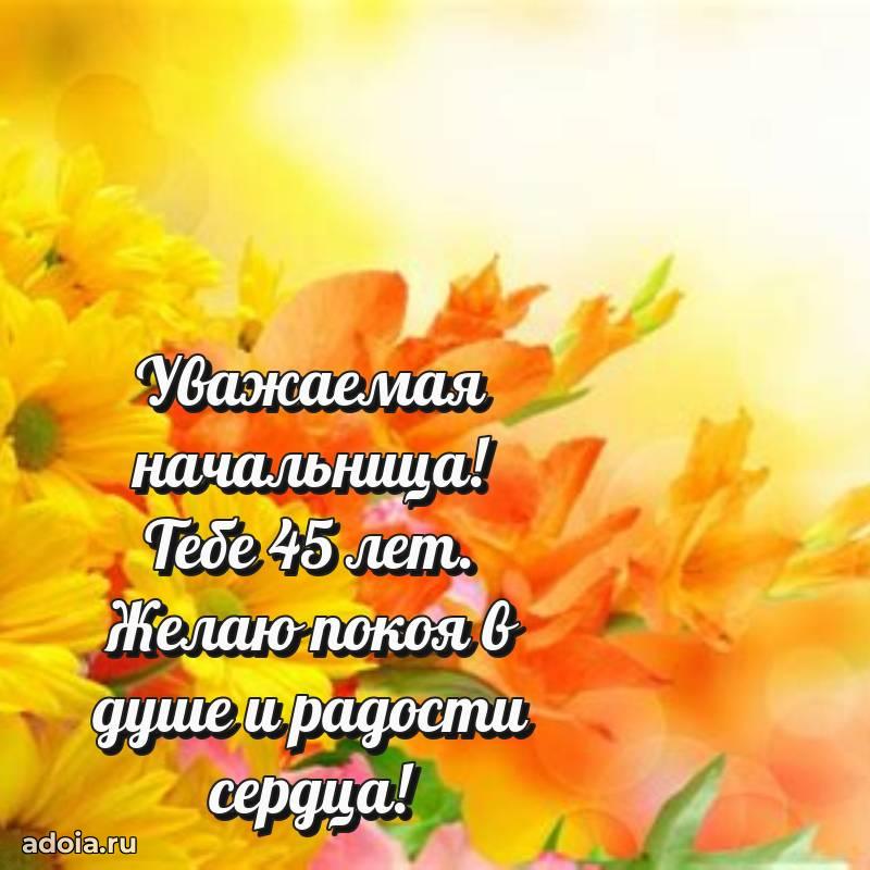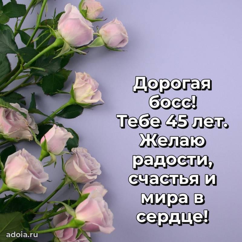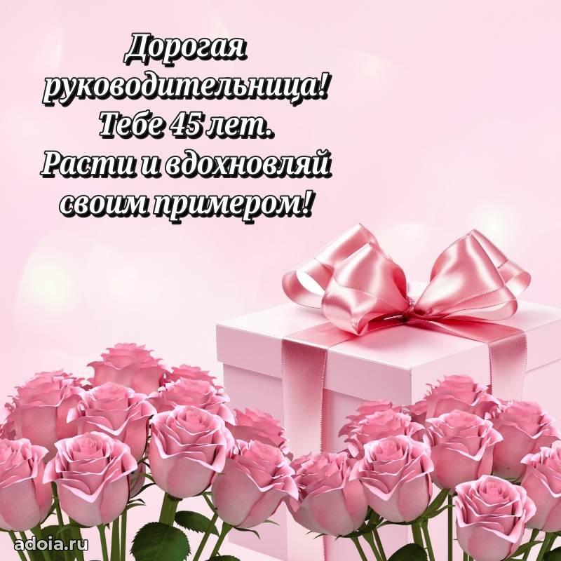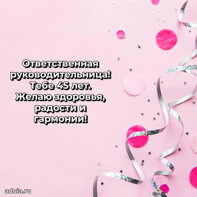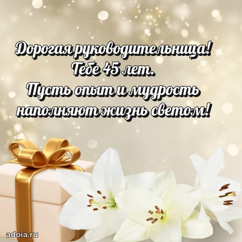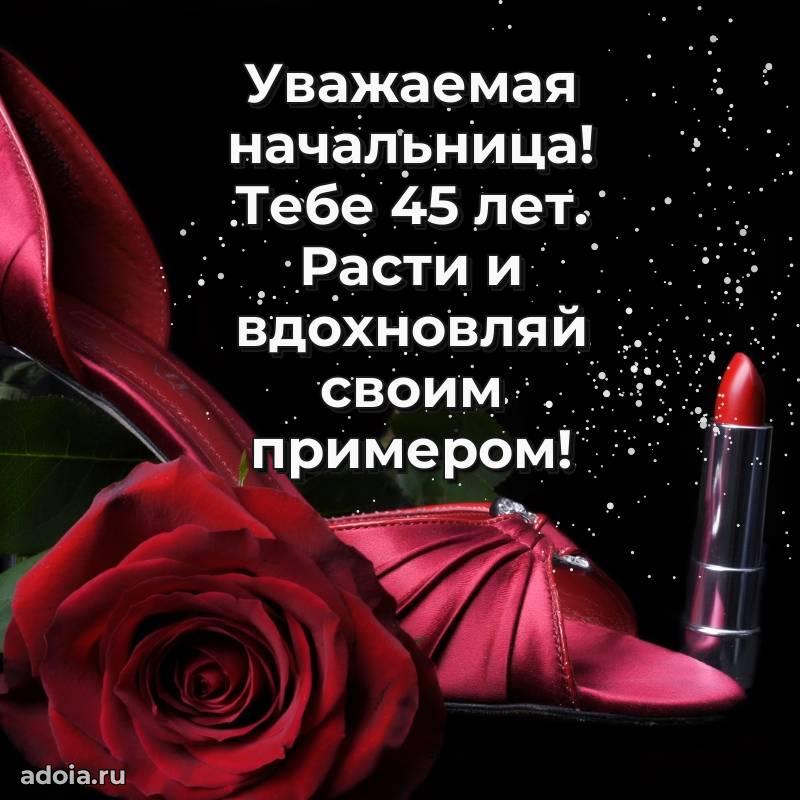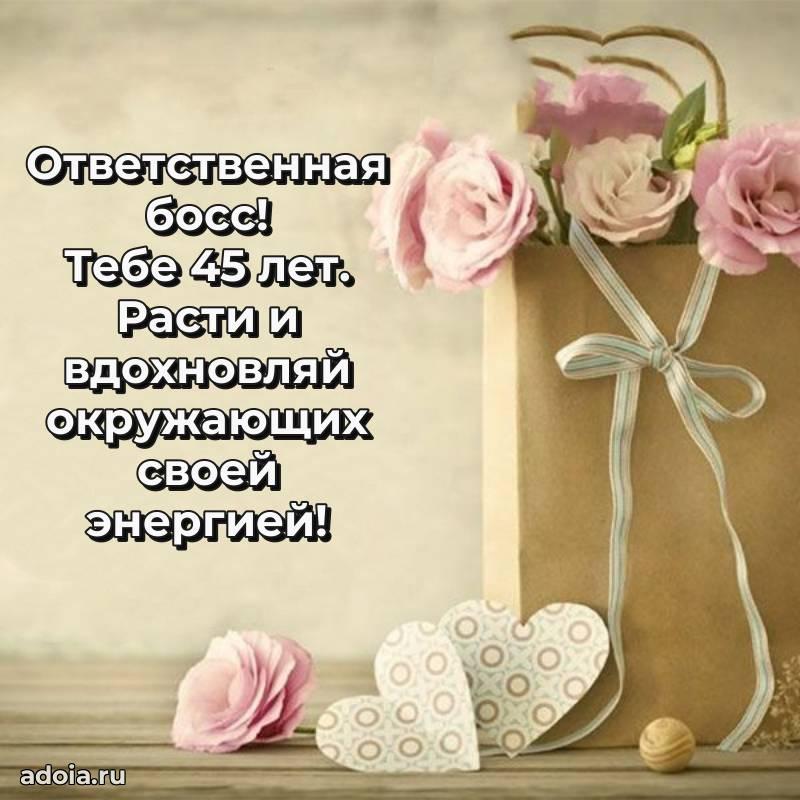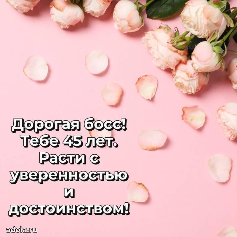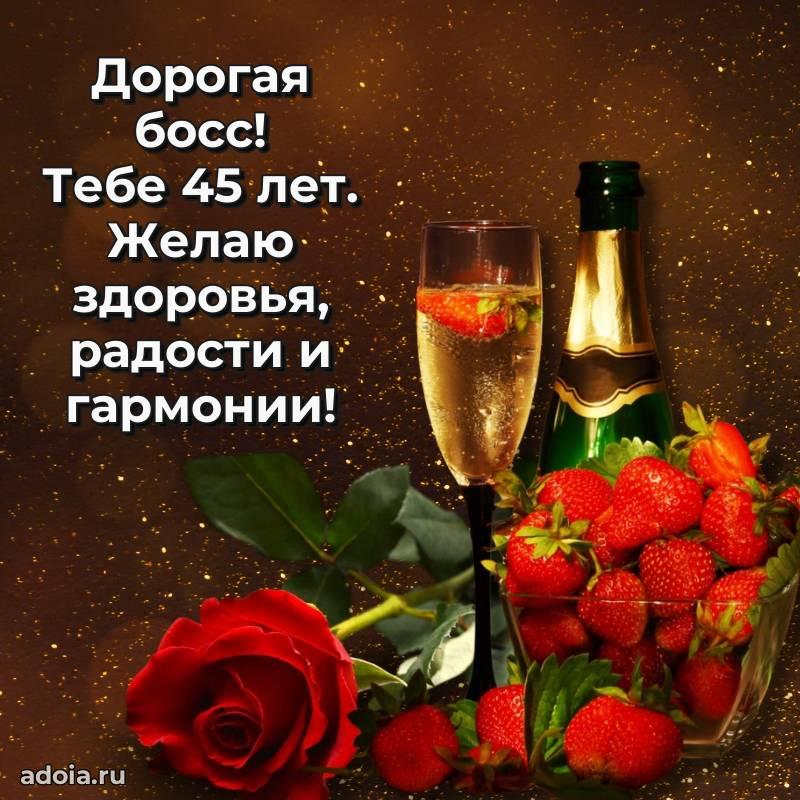 В поисках красивых и современных открыток? Вы попали по адресу! Здесь вы найдете картинки с днем рождения Начальнице на 45 лет! Все картинки в высоком качестве, которые можно скачать или отправить через WhatsApp бесплатно. Также вы найдете много прикольных и мерцающих гифок и анимаций, которые поднимут настроение! Все открытки содержат поздравления в стихах и прозе.