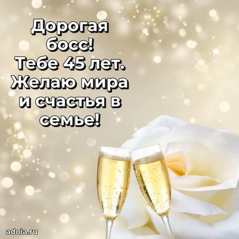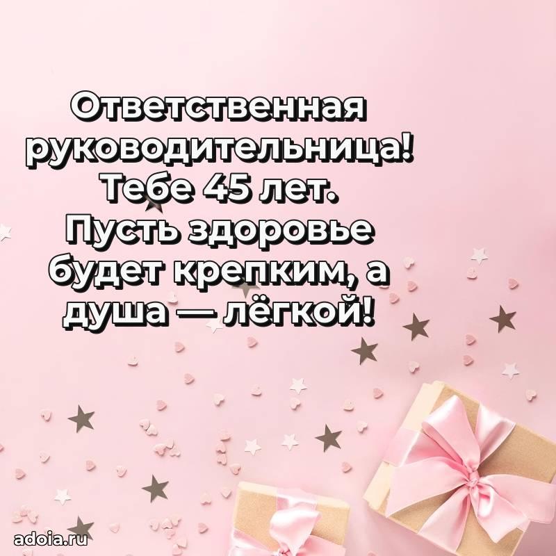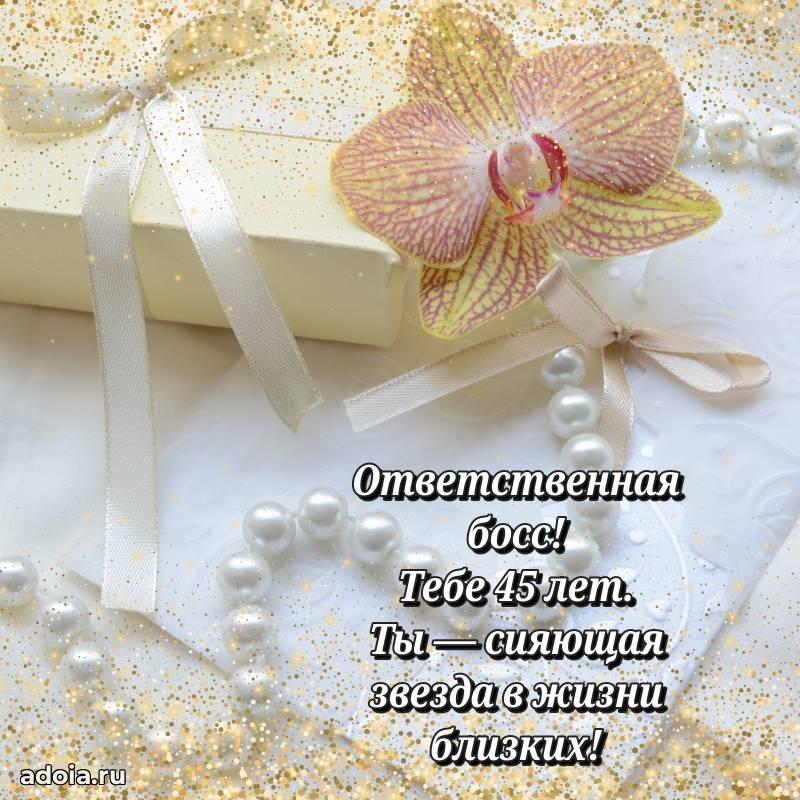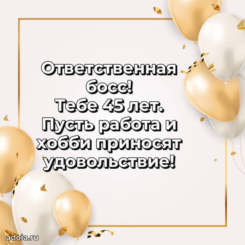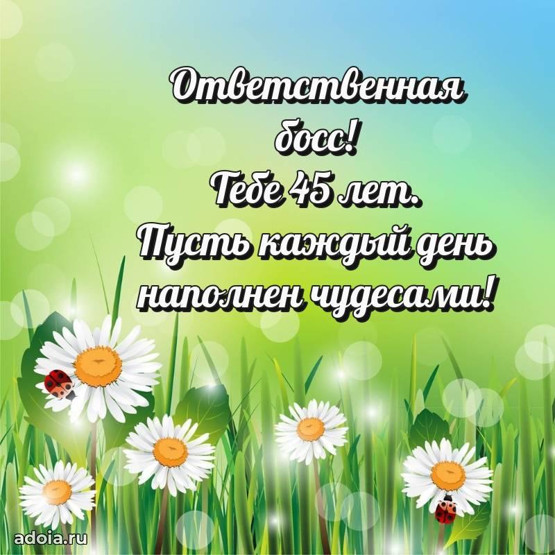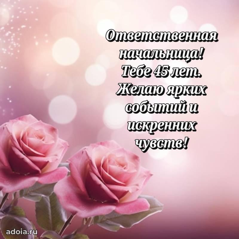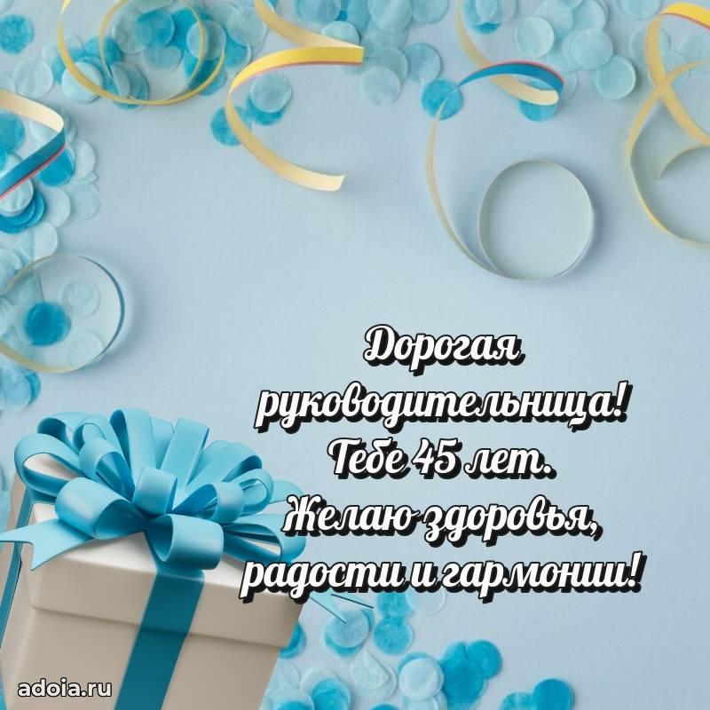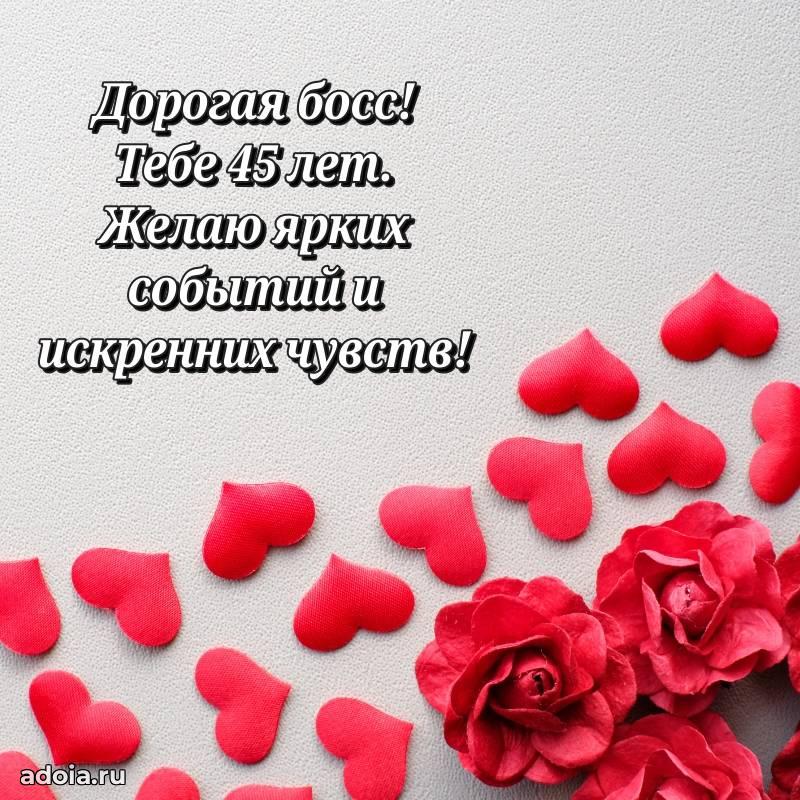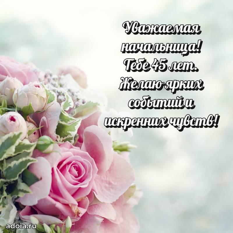 В поисках красивых и современных открыток? Вы попали по адресу! Здесь вы найдете картинки с днем рождения Начальнице на 45 лет! Все картинки в высоком качестве, которые можно скачать или отправить через WhatsApp бесплатно. Также вы найдете много прикольных и мерцающих гифок и анимаций, которые поднимут настроение! Все открытки содержат поздравления в стихах и прозе.