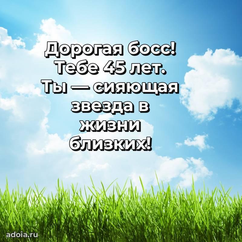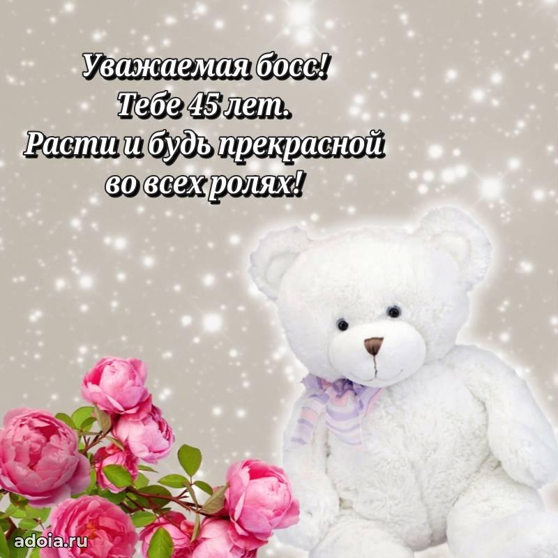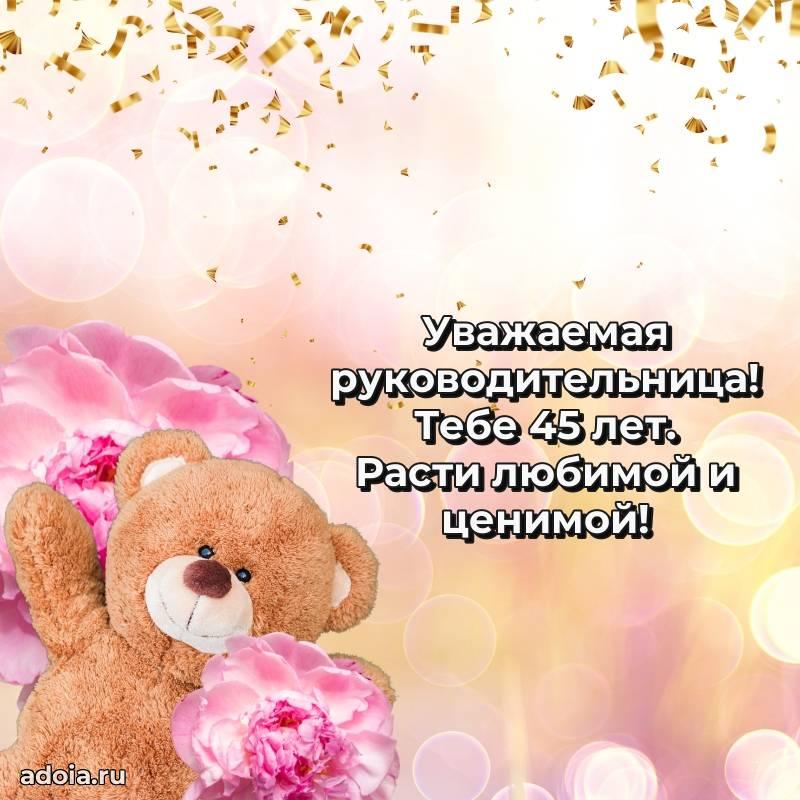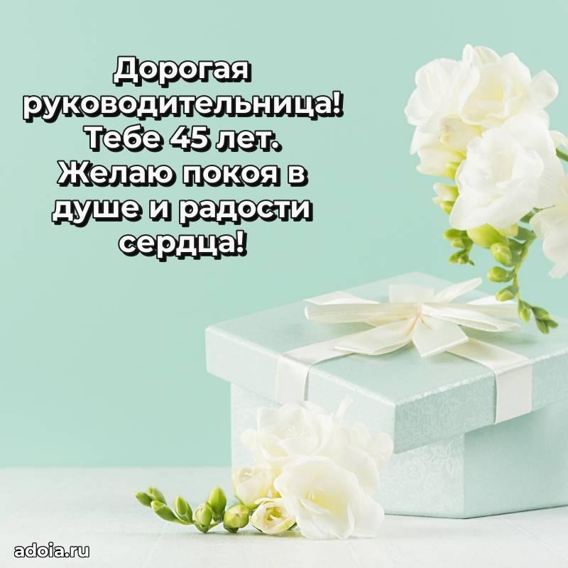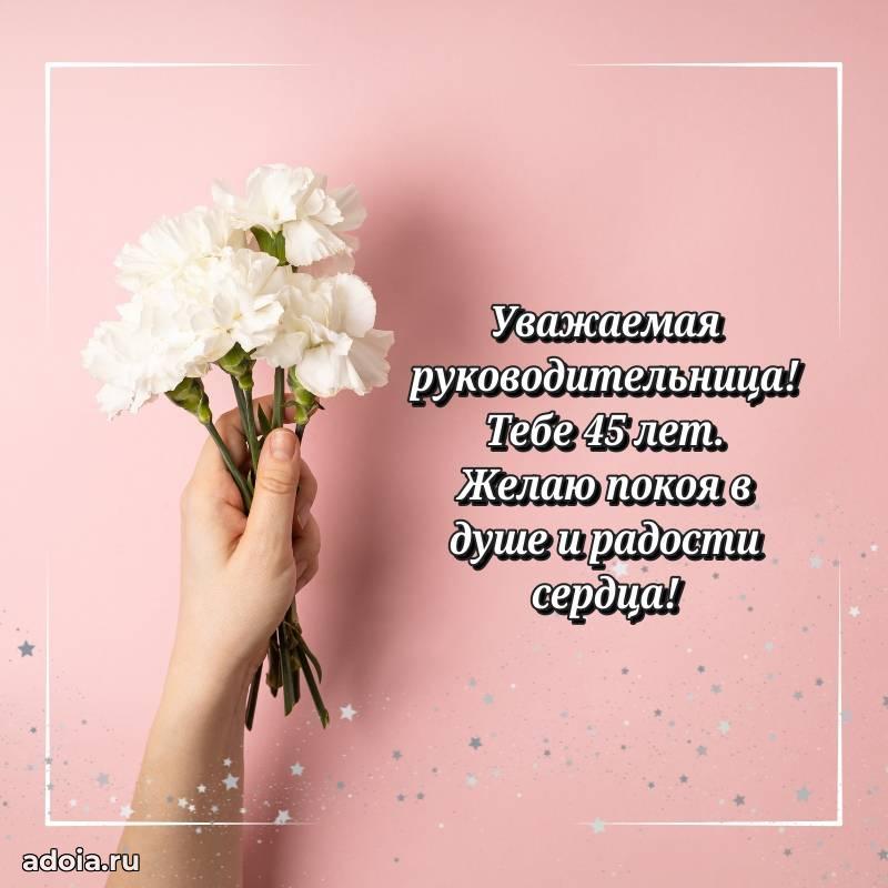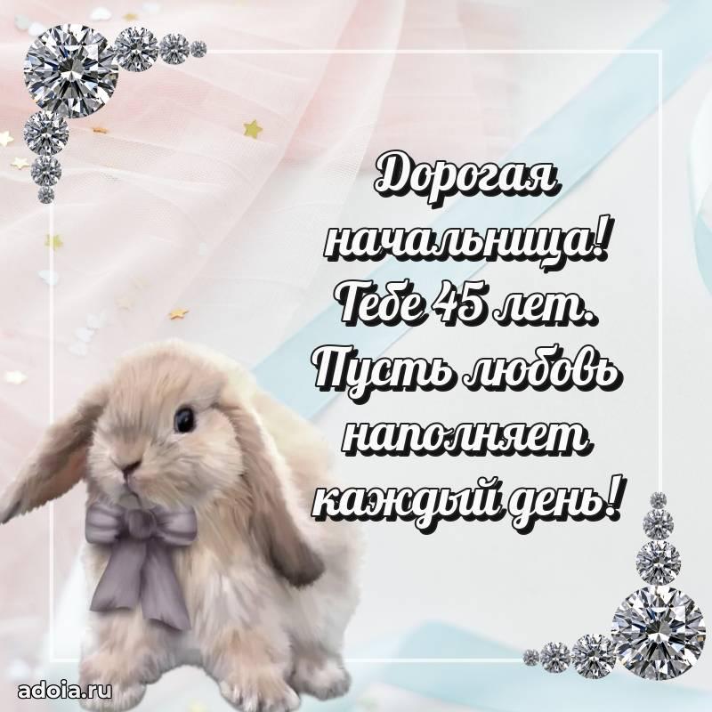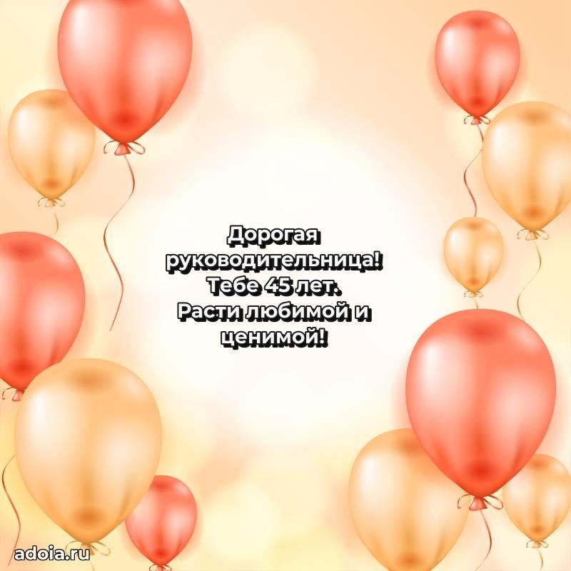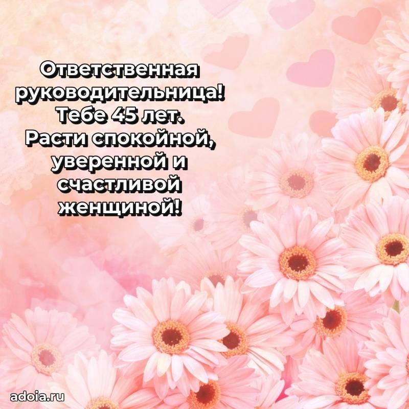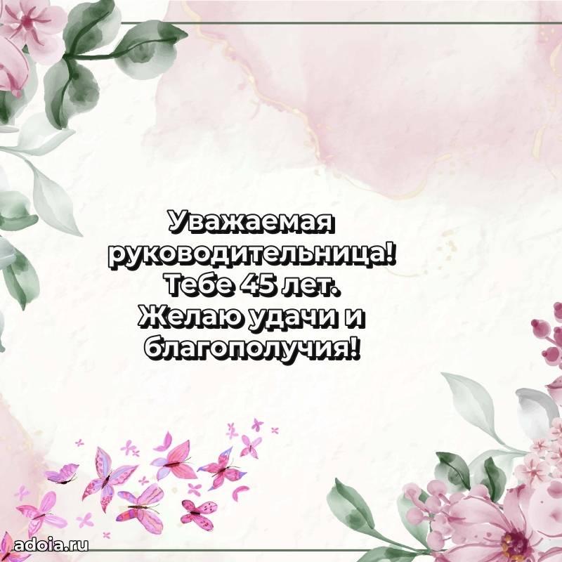 В поисках красивых и современных открыток? Вы попали по адресу! Здесь вы найдете картинки с днем рождения Начальнице на 45 лет! Все картинки в высоком качестве, которые можно скачать или отправить через WhatsApp бесплатно. Также вы найдете много прикольных и мерцающих гифок и анимаций, которые поднимут настроение! Все открытки содержат поздравления в стихах и прозе.