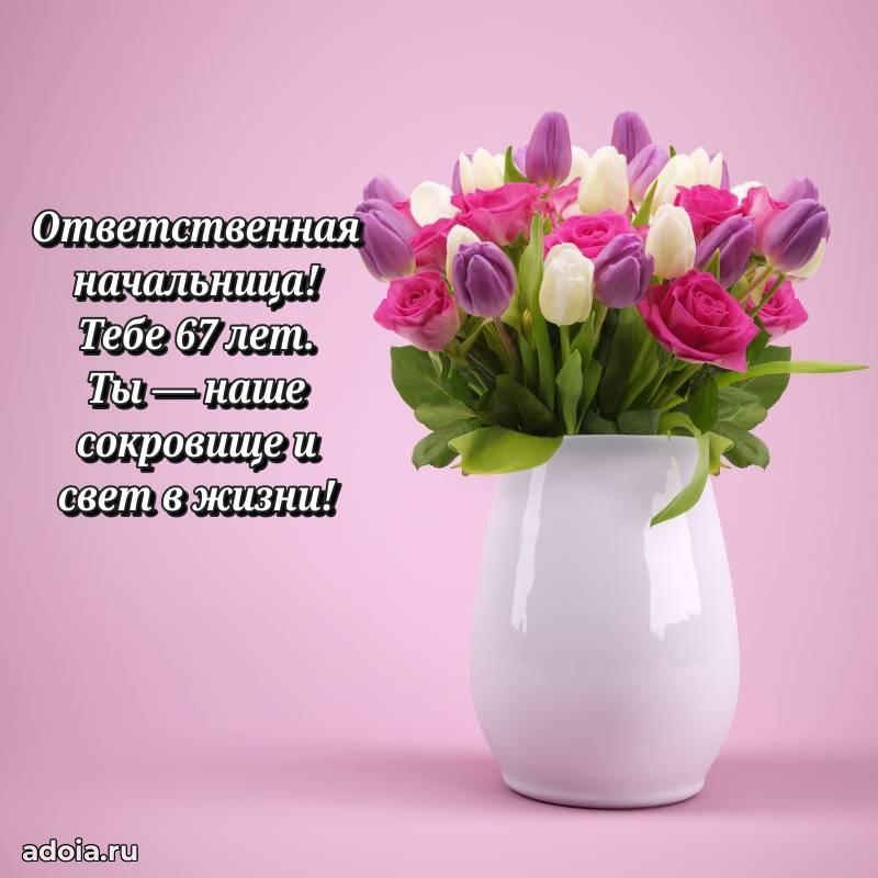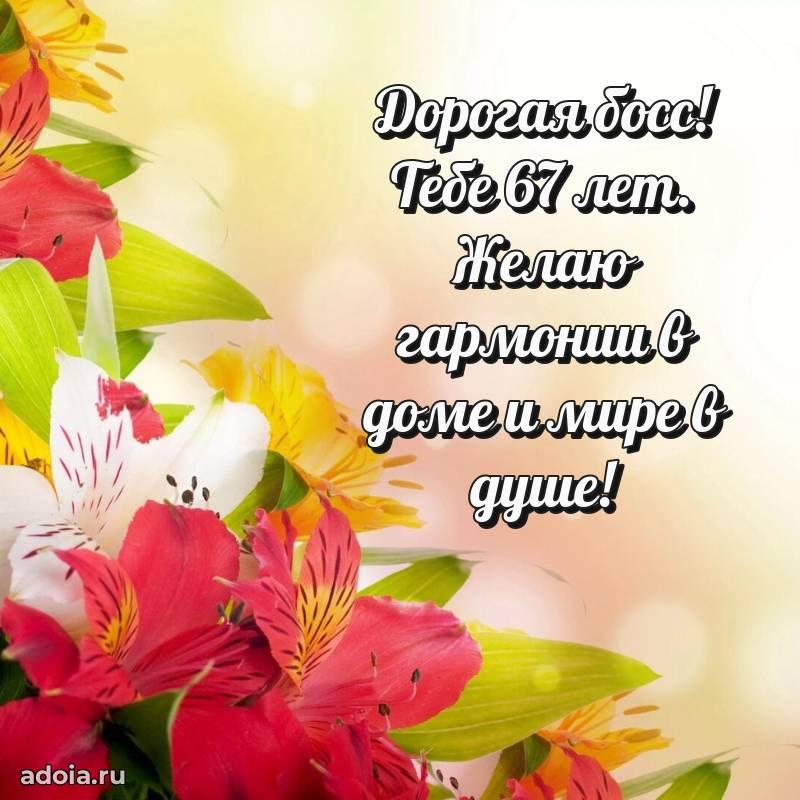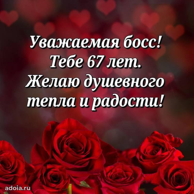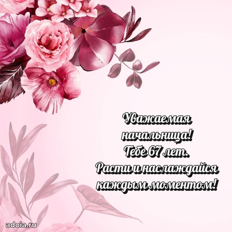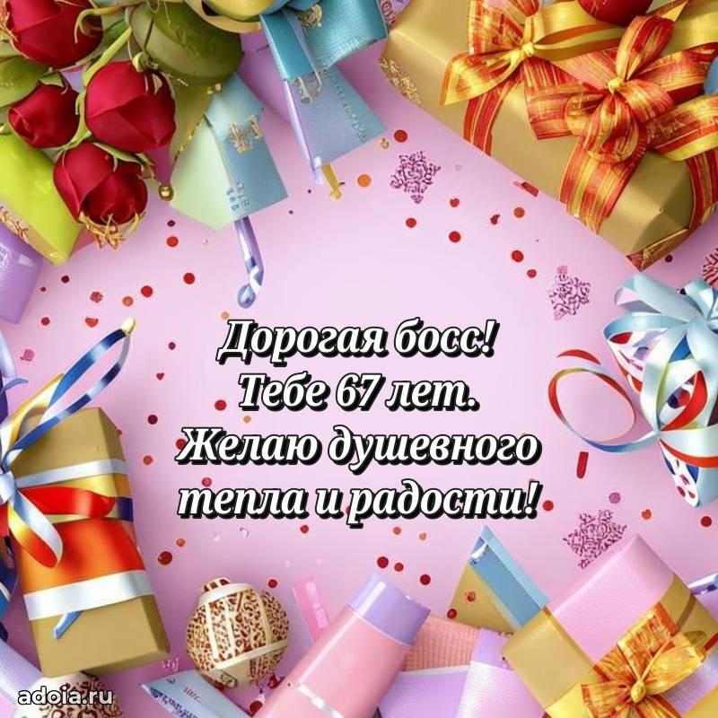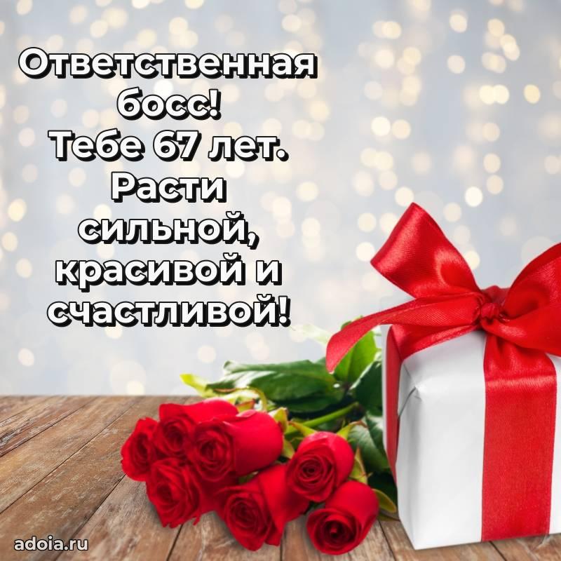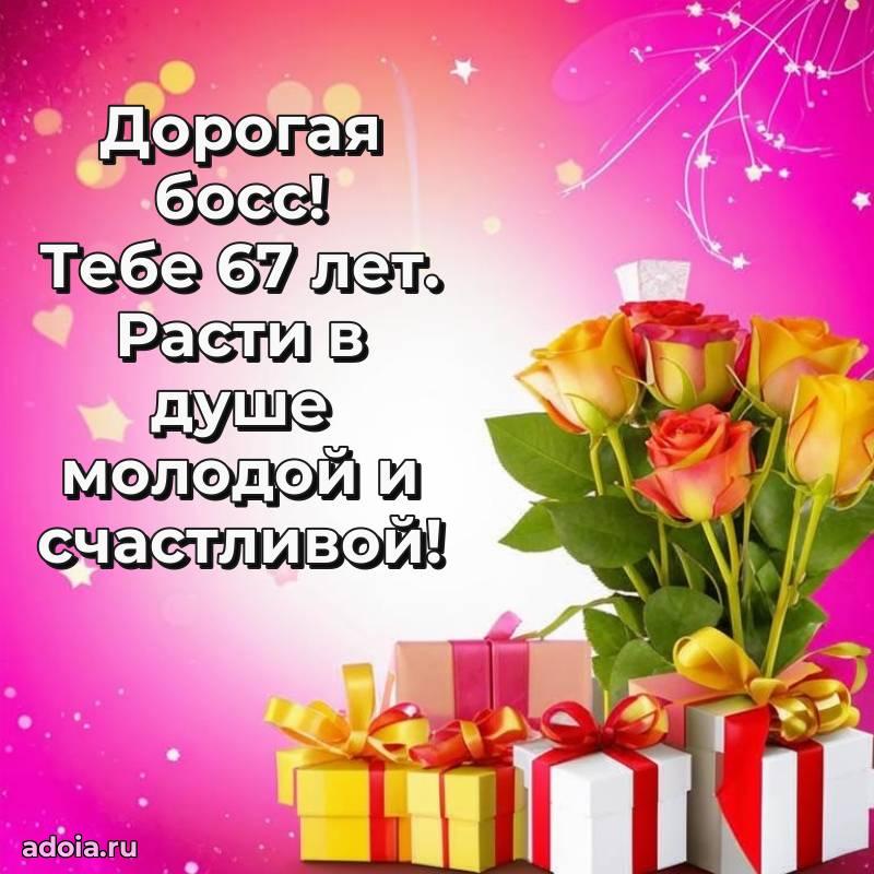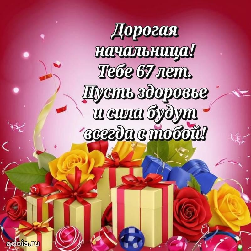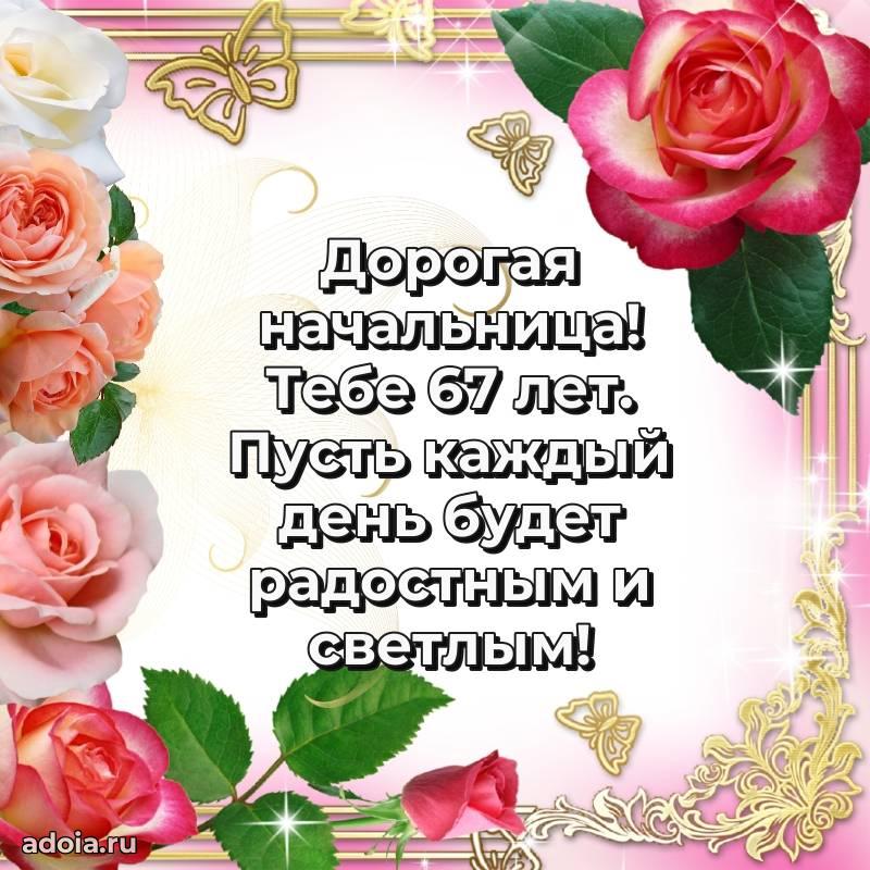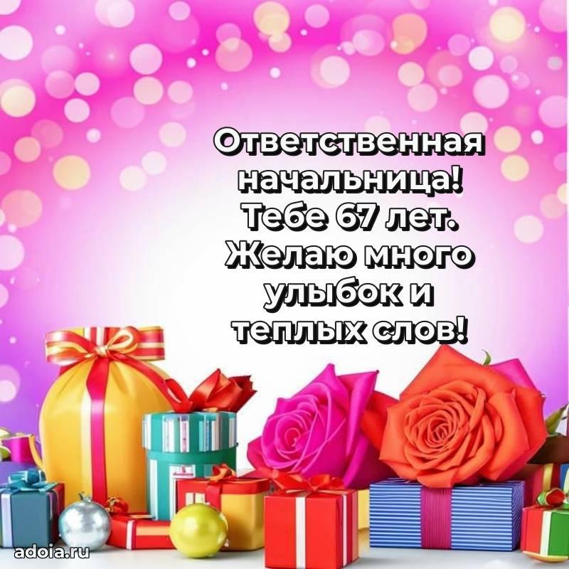В поисках красивых и современных открыток? Вы попали по адресу! Здесь вы найдете картинки с днем рождения Начальнице на 67 лет! Все картинки в высоком качестве, которые можно скачать или отправить через WhatsApp бесплатно. Также вы найдете много прикольных и мерцающих гифок и анимаций, которые поднимут настроение! Все открытки содержат поздравления в стихах и прозе.
