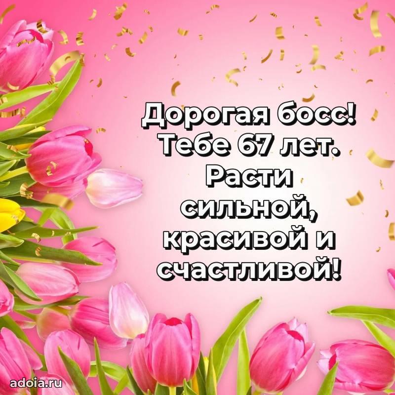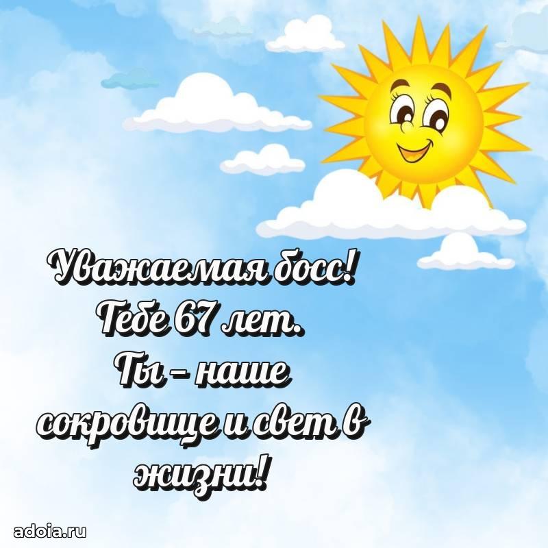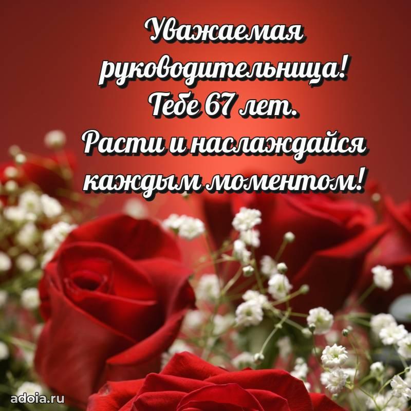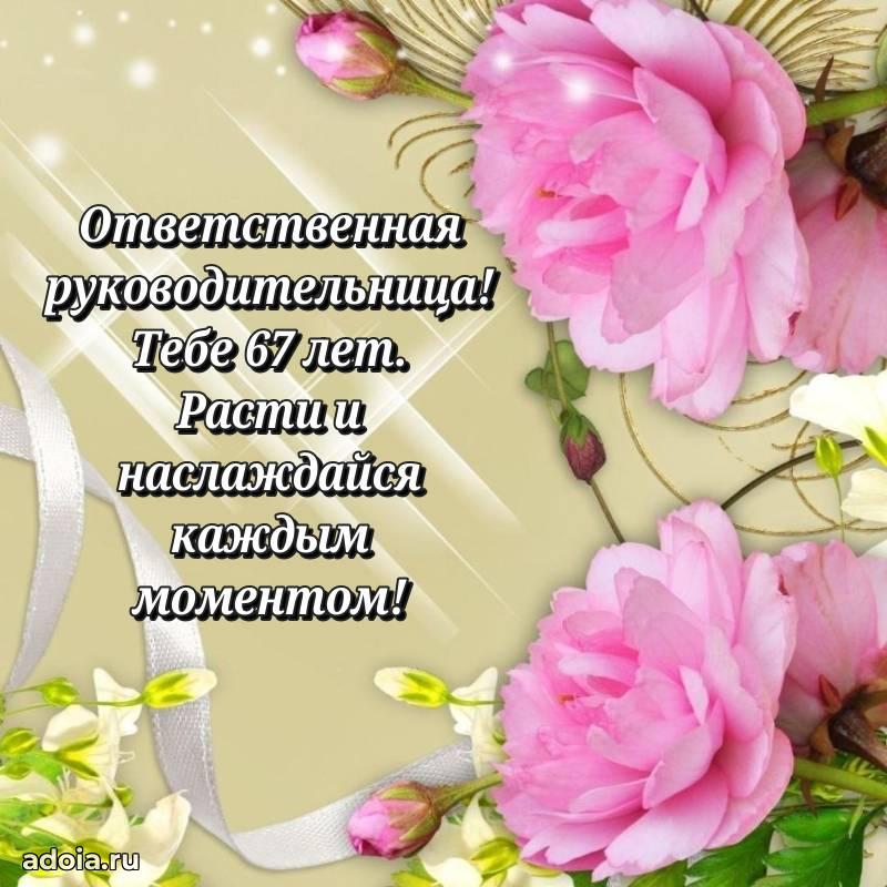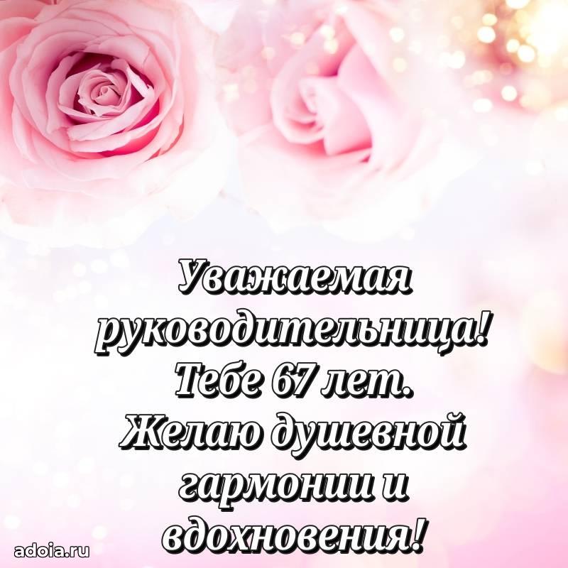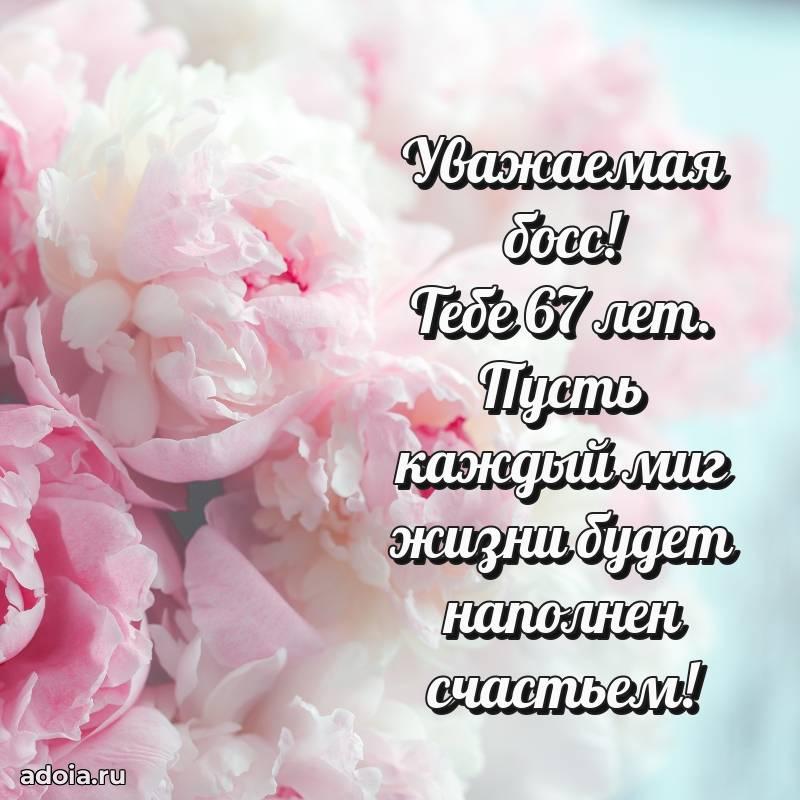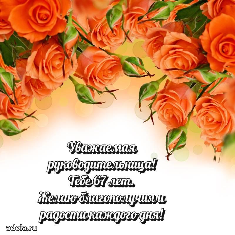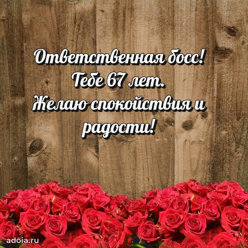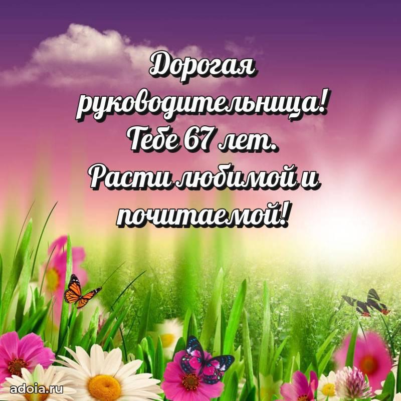 В поисках красивых и современных открыток? Вы попали по адресу! Здесь вы найдете картинки с днем рождения Начальнице на 67 лет! Все картинки в высоком качестве, которые можно скачать или отправить через WhatsApp бесплатно. Также вы найдете много прикольных и мерцающих гифок и анимаций, которые поднимут настроение! Все открытки содержат поздравления в стихах и прозе.