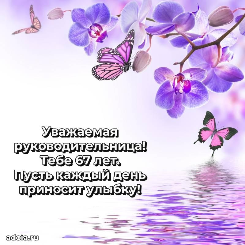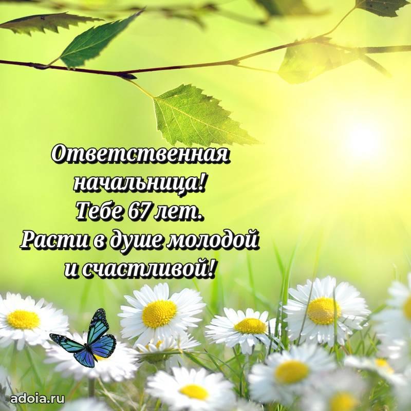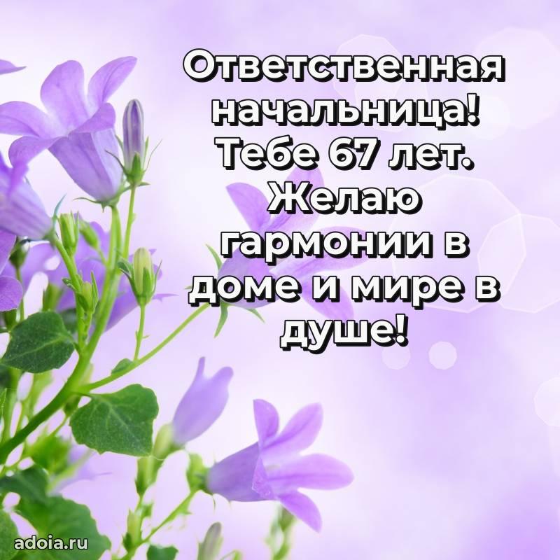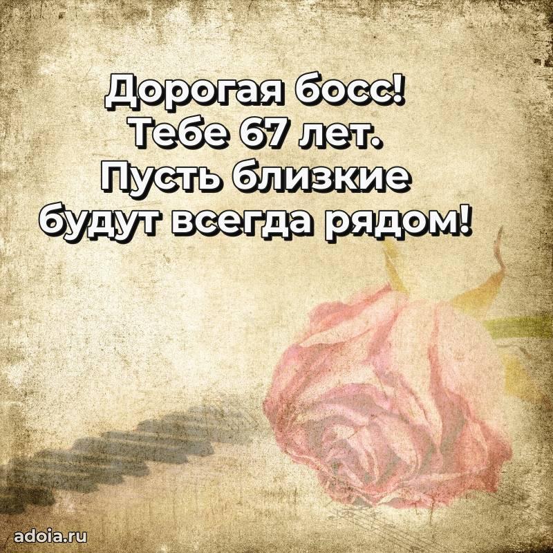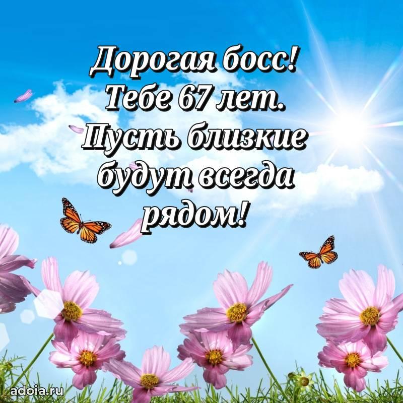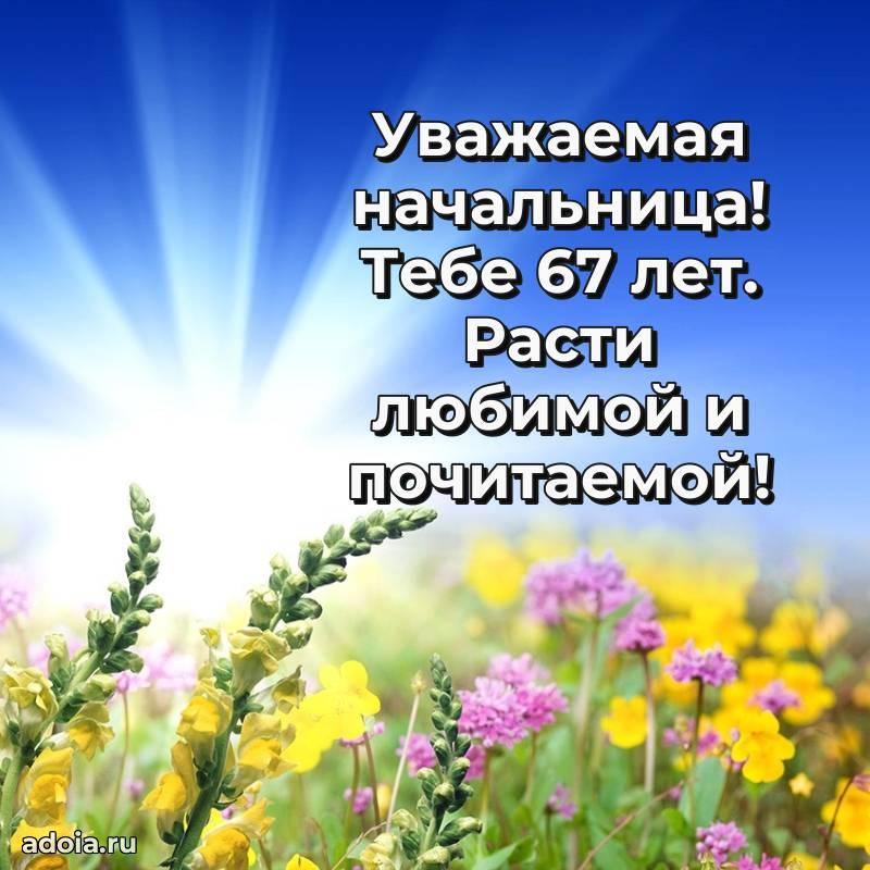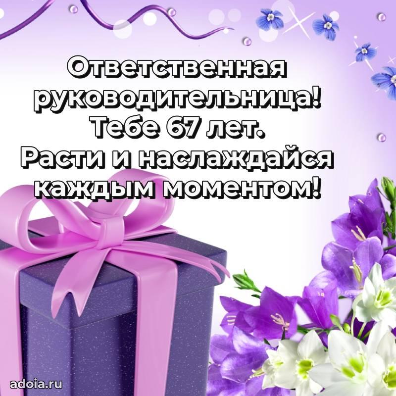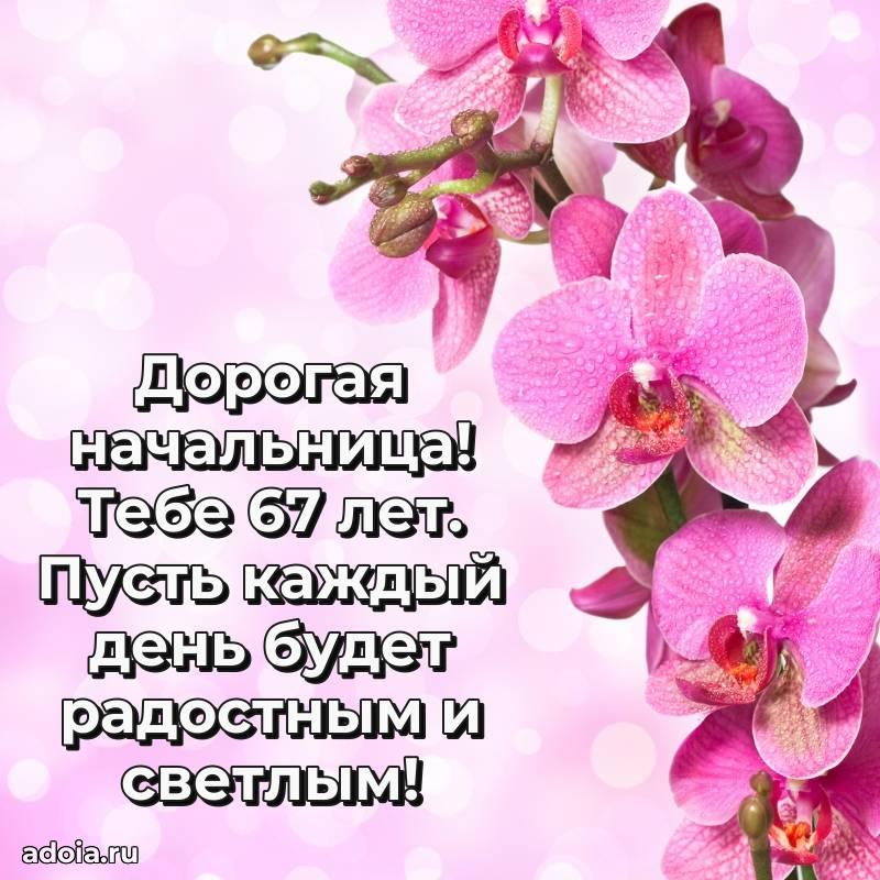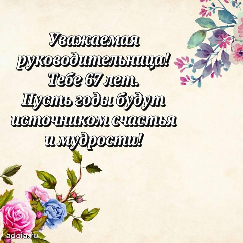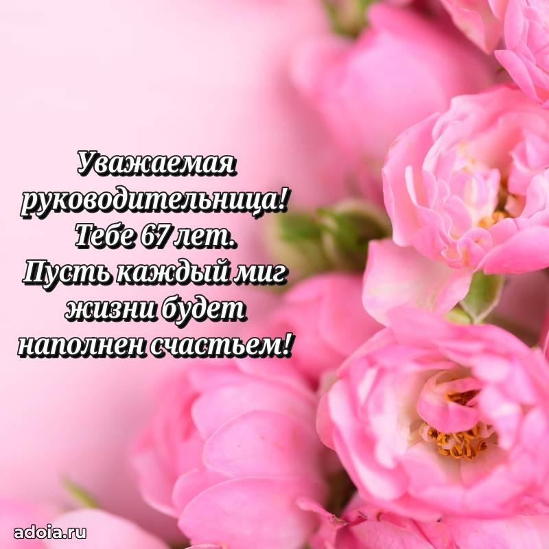 В поисках красивых и современных открыток? Вы попали по адресу! Здесь вы найдете картинки с днем рождения Начальнице на 67 лет! Все картинки в высоком качестве, которые можно скачать или отправить через WhatsApp бесплатно. Также вы найдете много прикольных и мерцающих гифок и анимаций, которые поднимут настроение! Все открытки содержат поздравления в стихах и прозе.