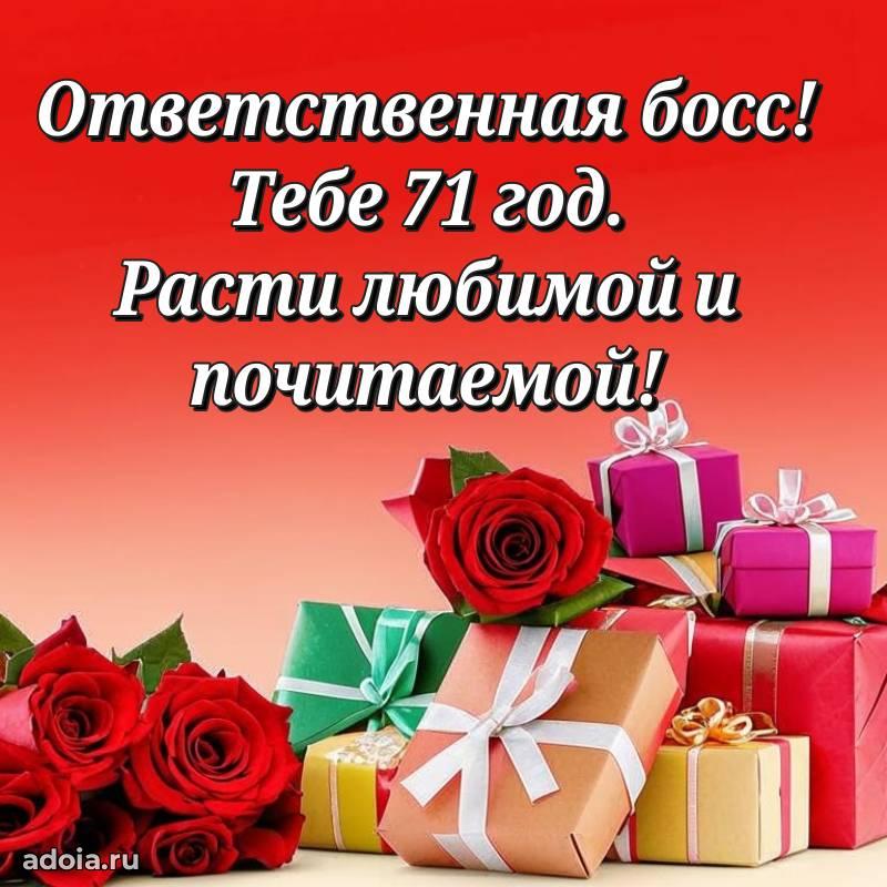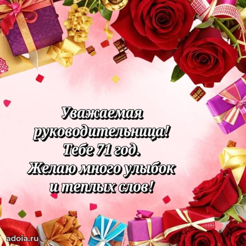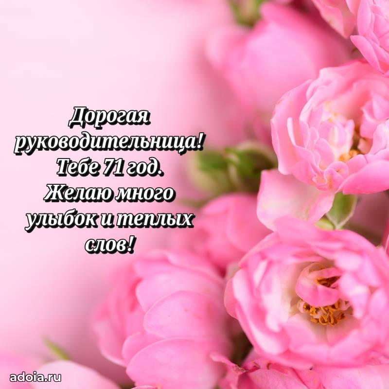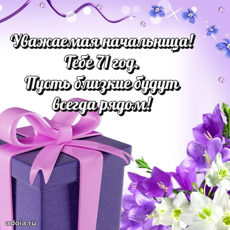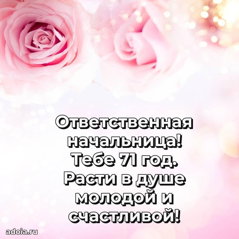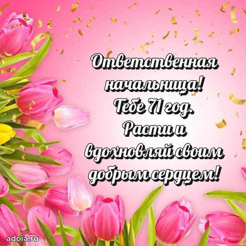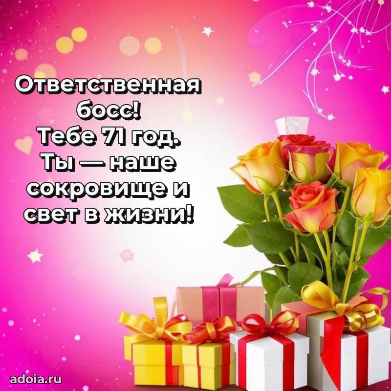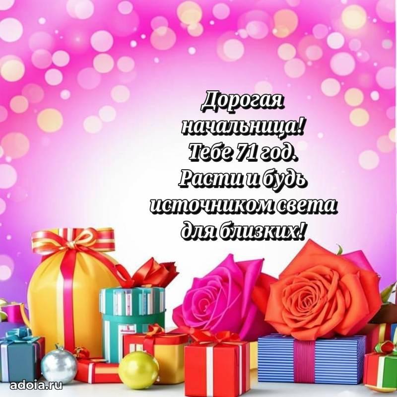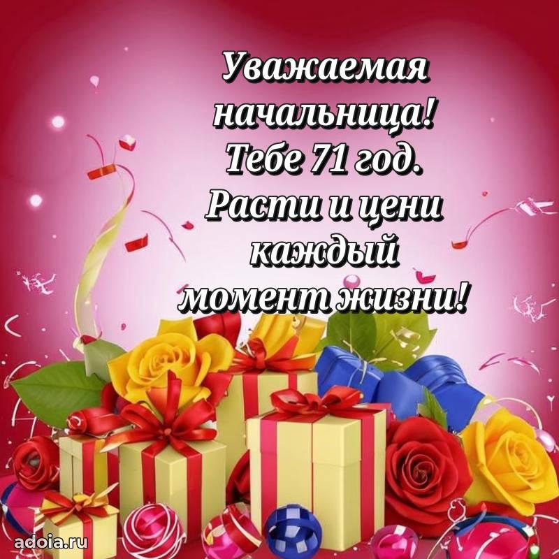 В поисках красивых и современных открыток? Вы попали по адресу! Здесь вы найдете картинки с днем рождения Начальнице на 71 год! Все картинки в высоком качестве, которые можно скачать или отправить через WhatsApp бесплатно. Также вы найдете много прикольных и мерцающих гифок и анимаций, которые поднимут настроение! Все открытки содержат поздравления в стихах и прозе.
