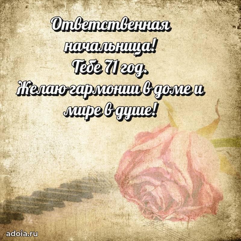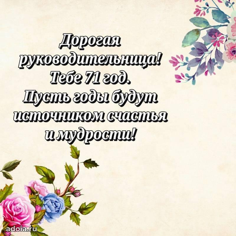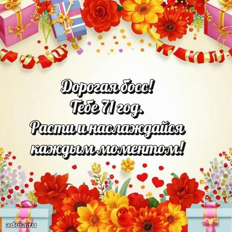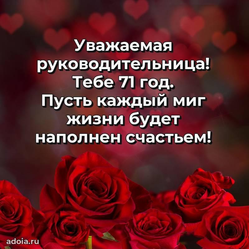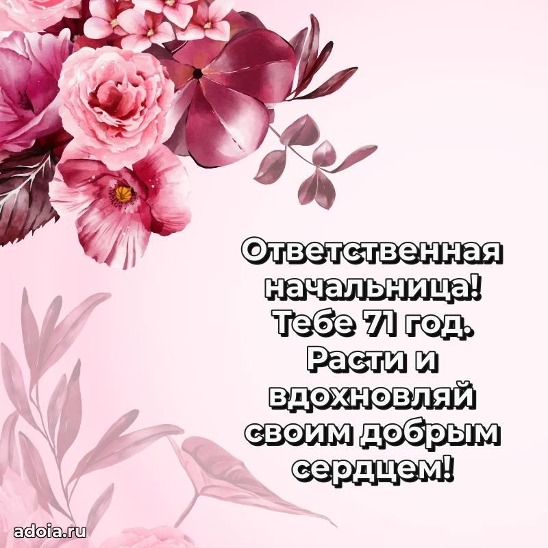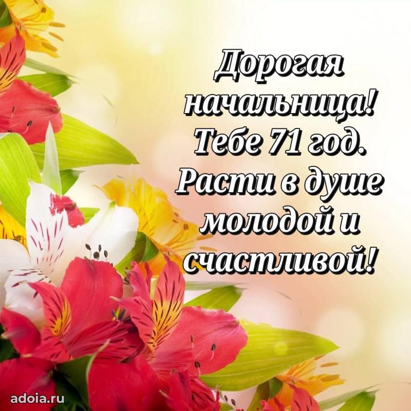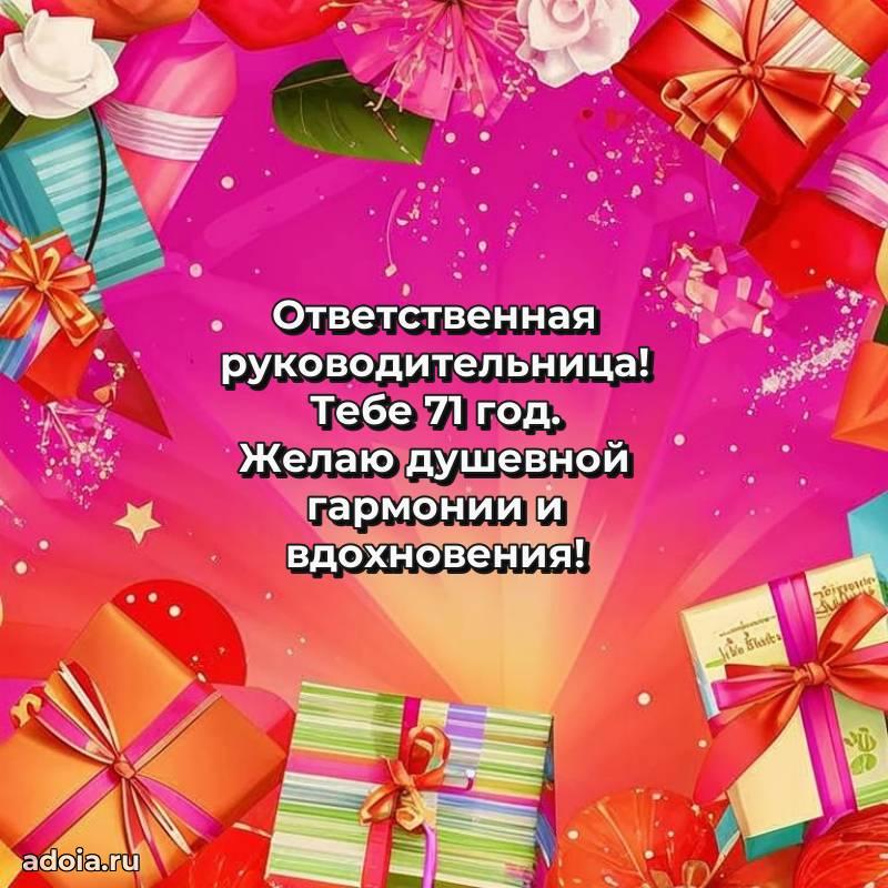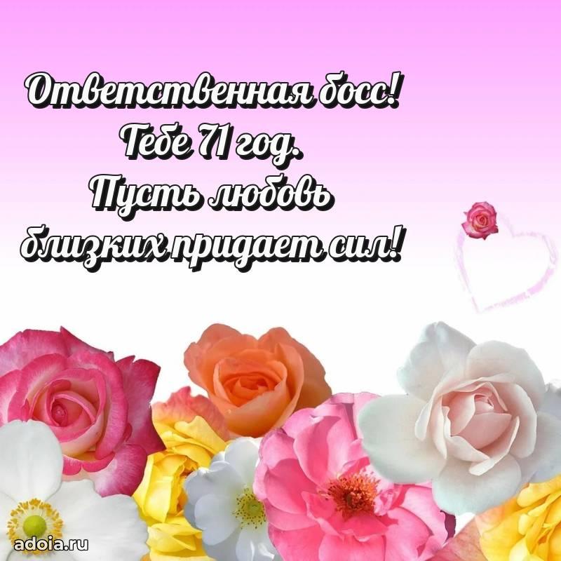 В поисках красивых и современных открыток? Вы попали по адресу! Здесь вы найдете картинки с днем рождения Начальнице на 71 год! Все картинки в высоком качестве, которые можно скачать или отправить через WhatsApp бесплатно. Также вы найдете много прикольных и мерцающих гифок и анимаций, которые поднимут настроение! Все открытки содержат поздравления в стихах и прозе.