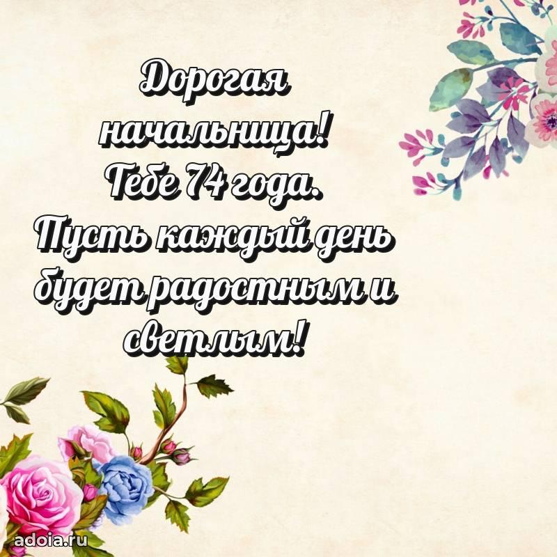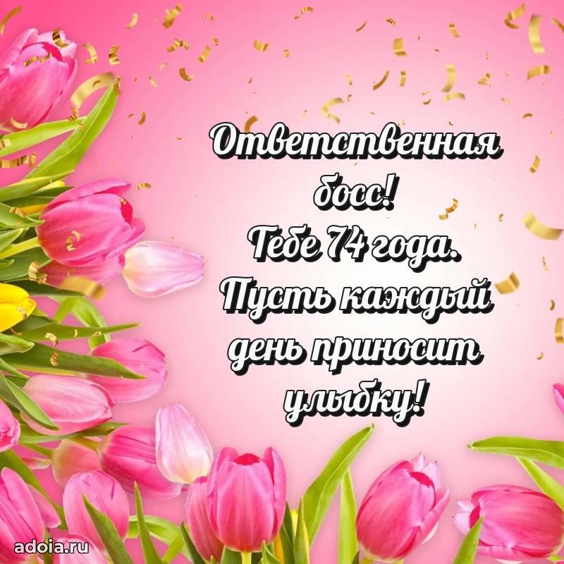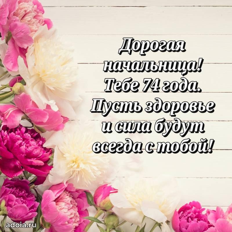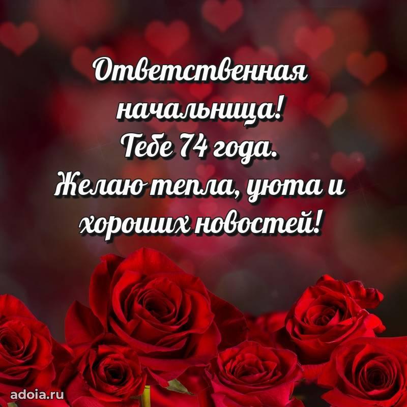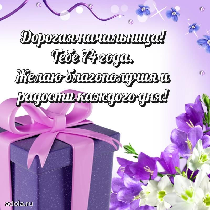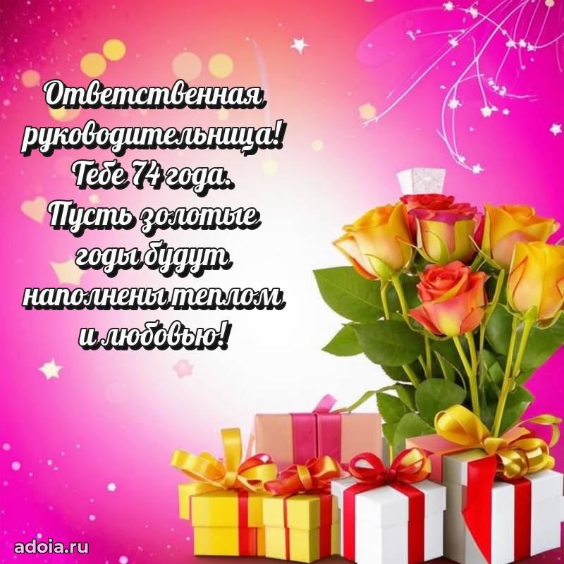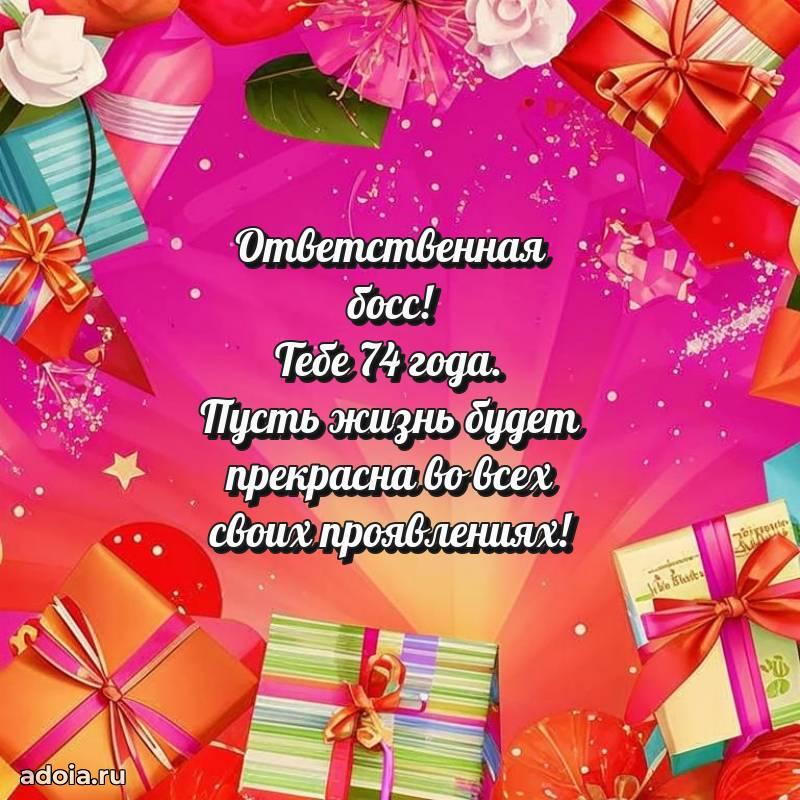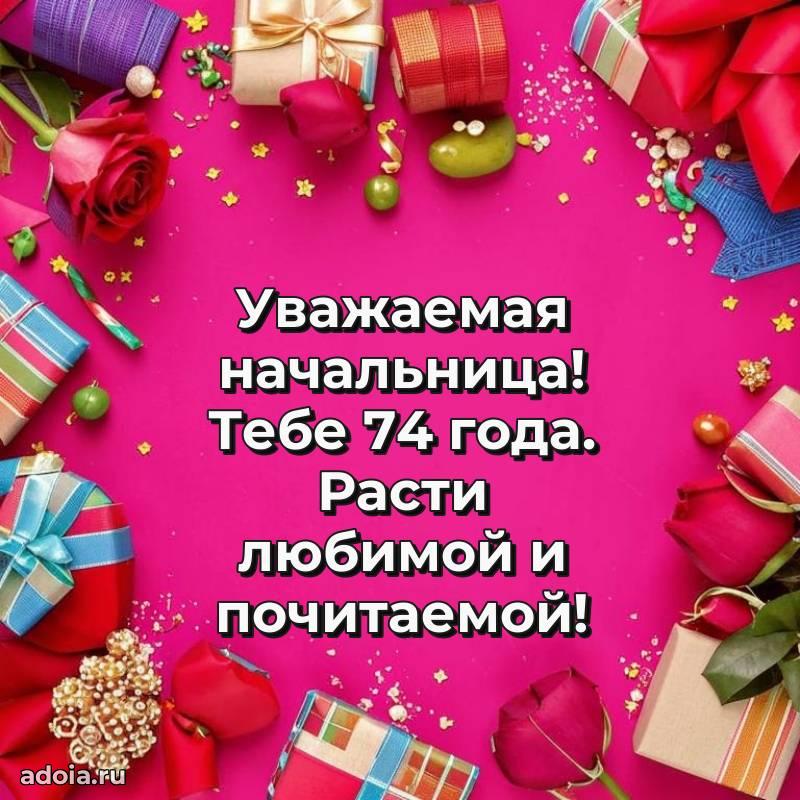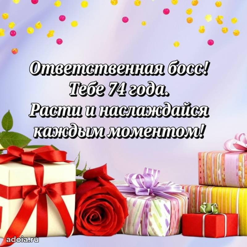 В поисках красивых и современных открыток? Вы попали по адресу! Здесь вы найдете картинки с днем рождения Начальнице на 74 года! Все картинки в высоком качестве, которые можно скачать или отправить через WhatsApp бесплатно. Также вы найдете много прикольных и мерцающих гифок и анимаций, которые поднимут настроение! Все открытки содержат поздравления в стихах и прозе.