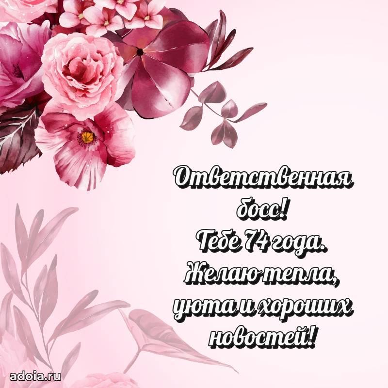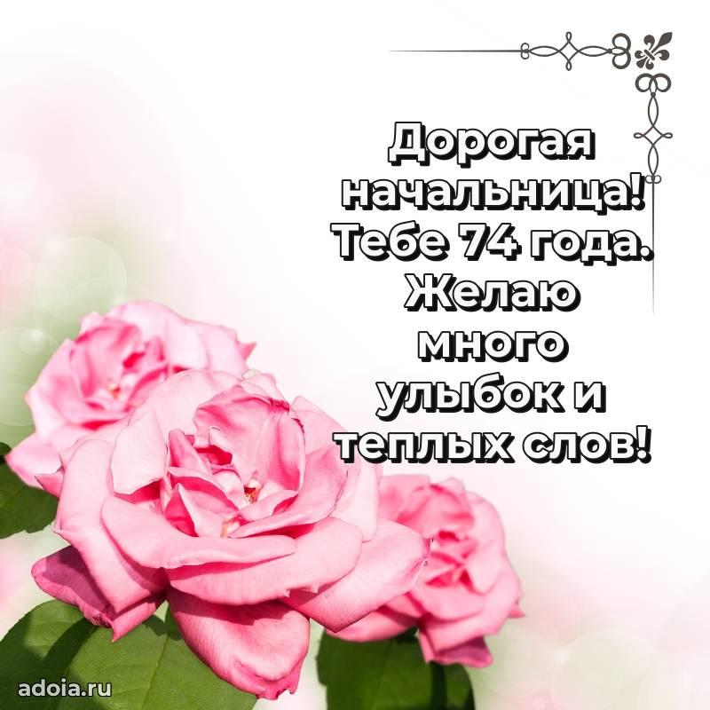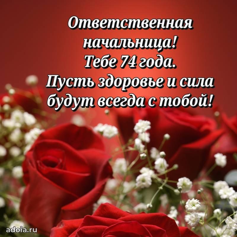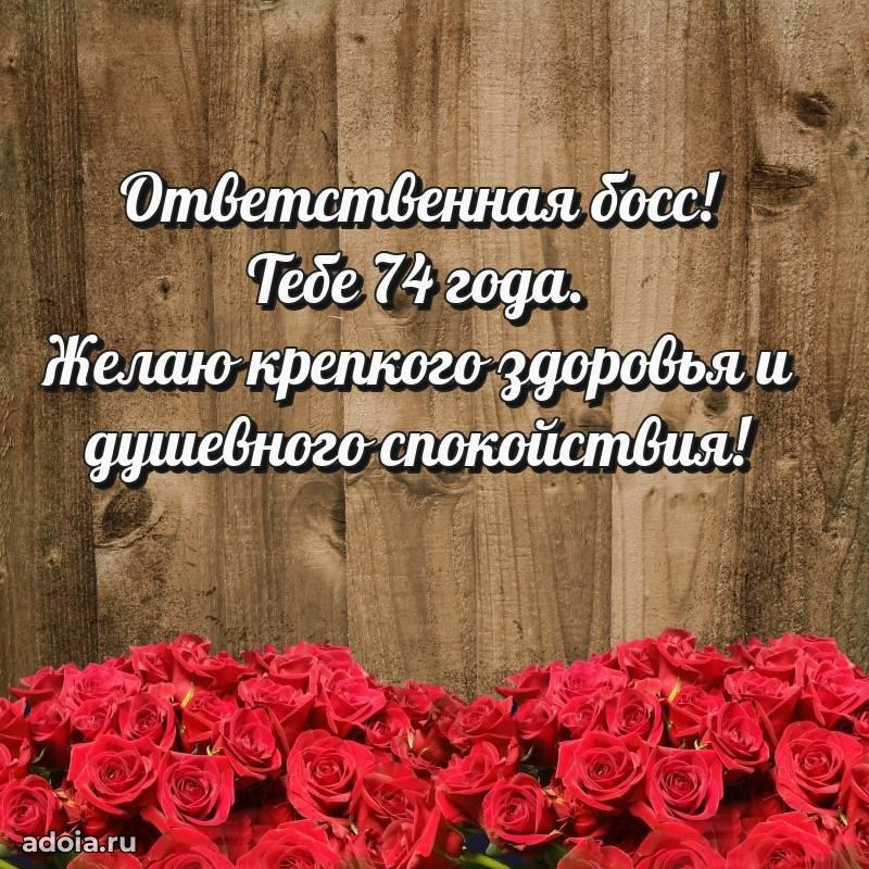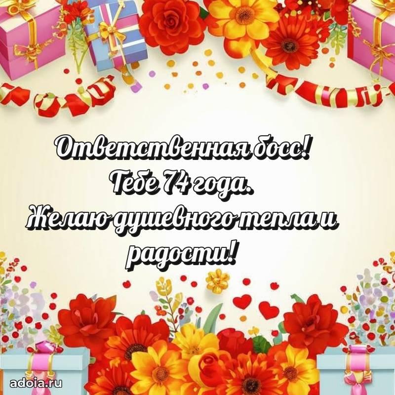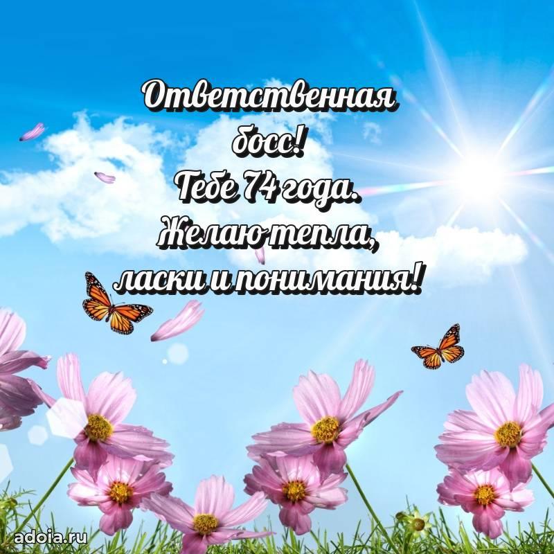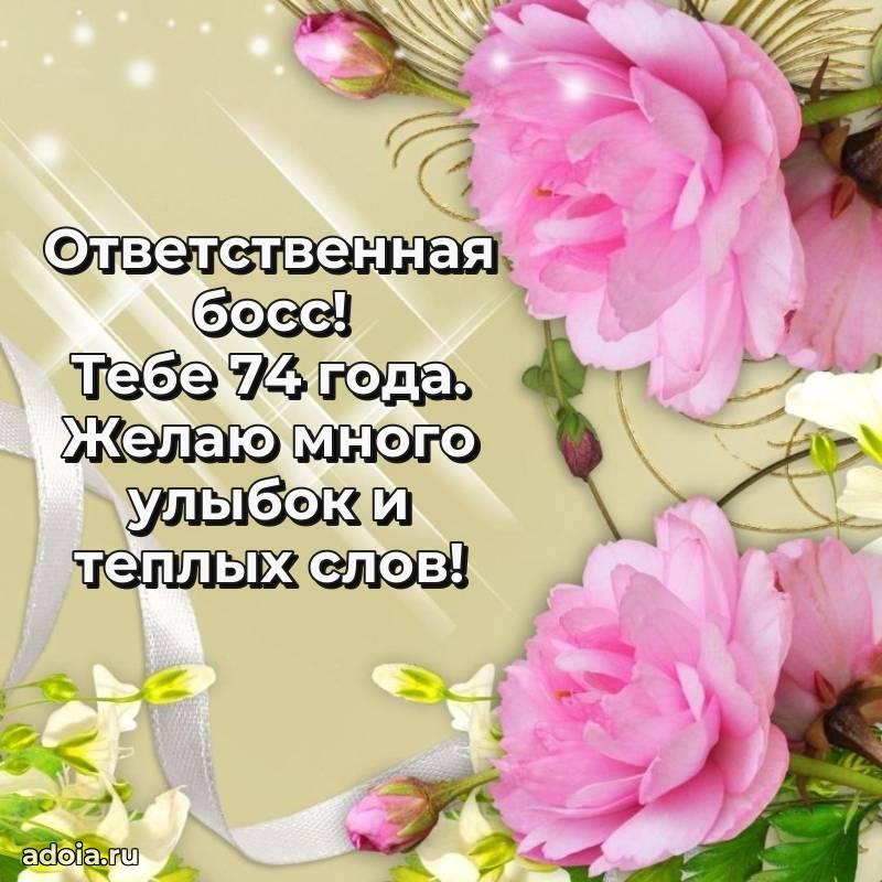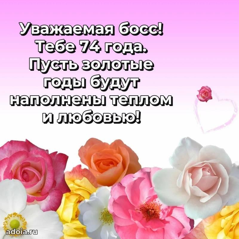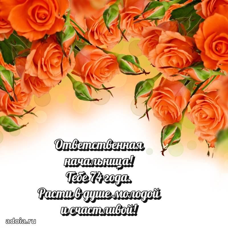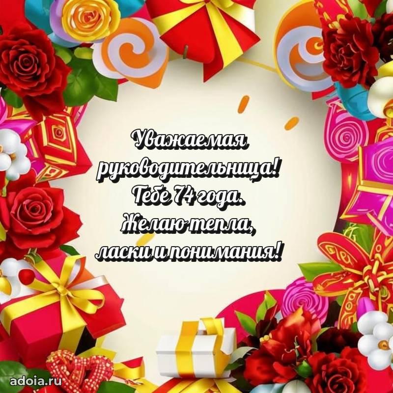 В поисках красивых и современных открыток? Вы попали по адресу! Здесь вы найдете картинки с днем рождения Начальнице на 74 года! Все картинки в высоком качестве, которые можно скачать или отправить через WhatsApp бесплатно. Также вы найдете много прикольных и мерцающих гифок и анимаций, которые поднимут настроение! Все открытки содержат поздравления в стихах и прозе.