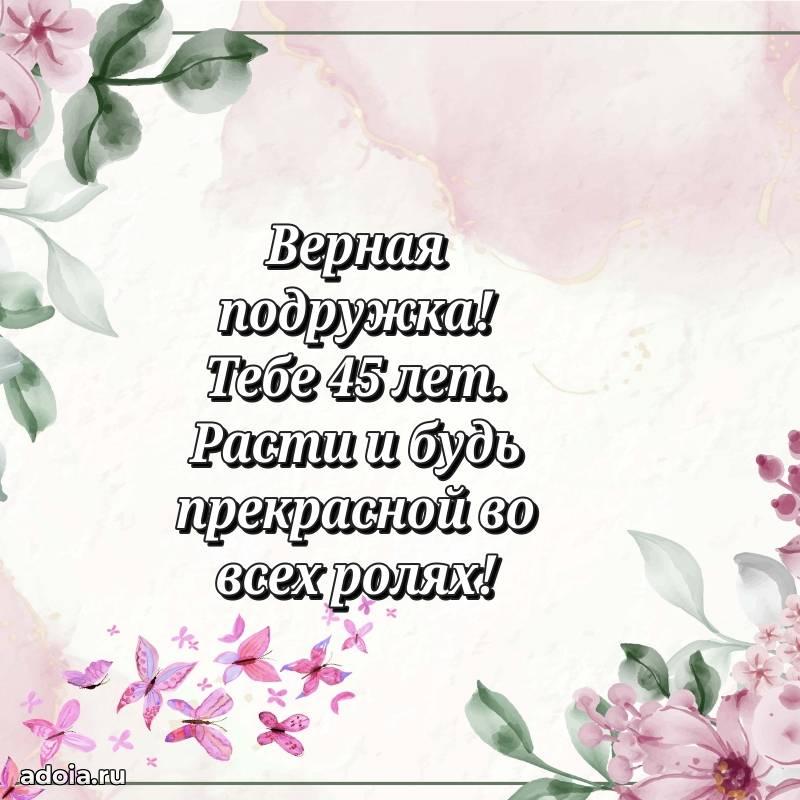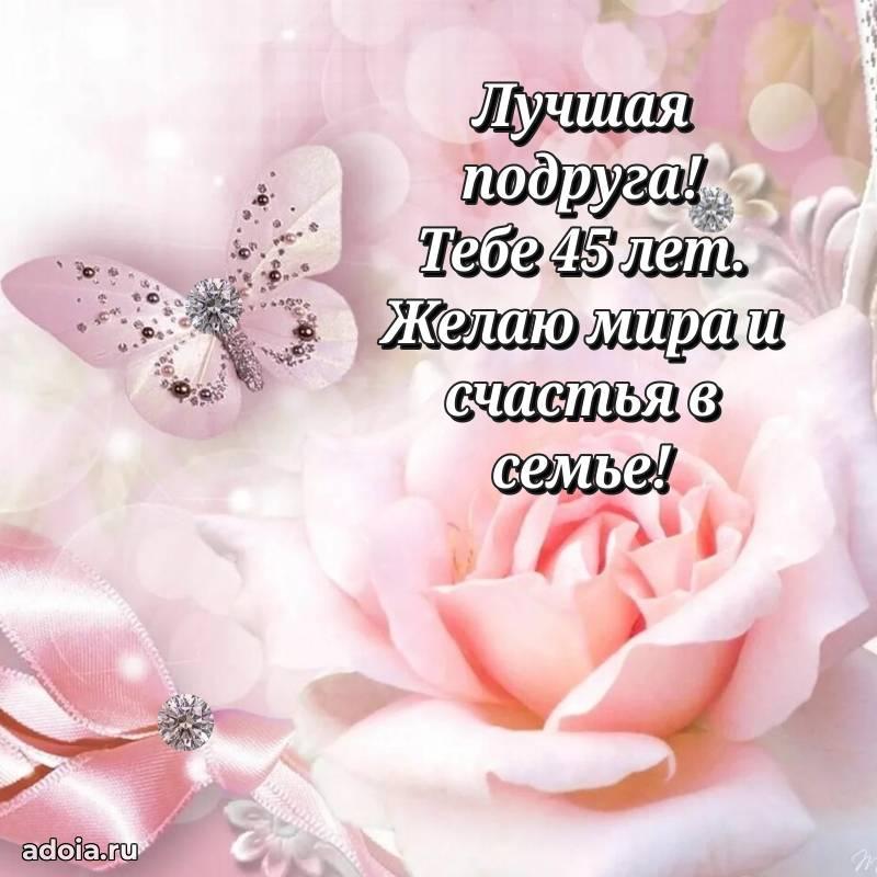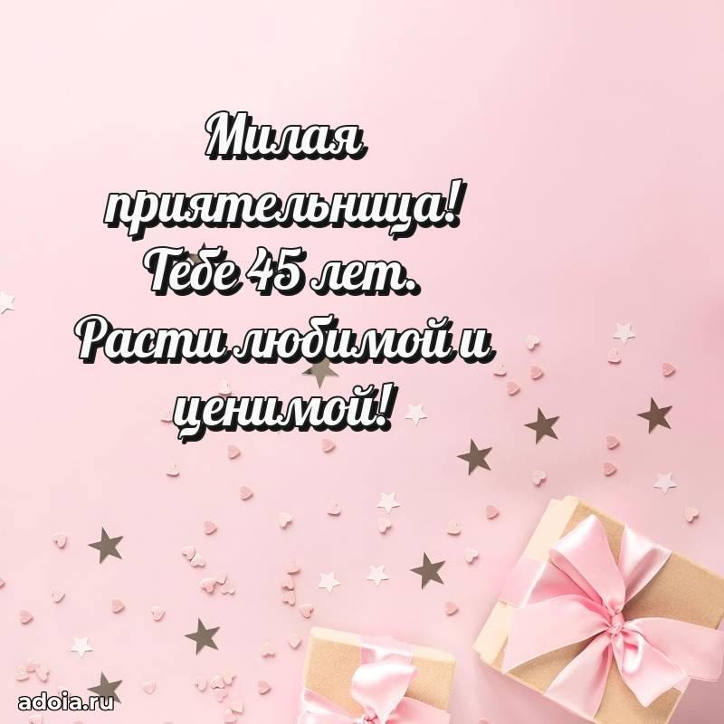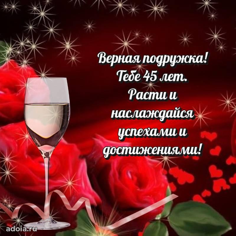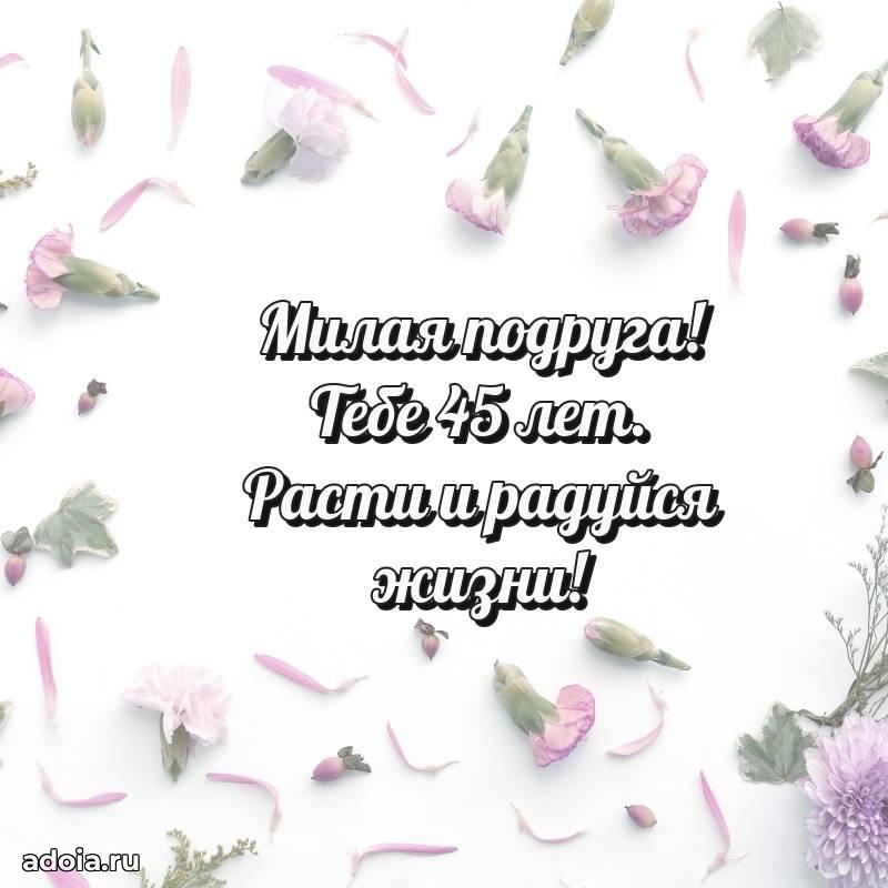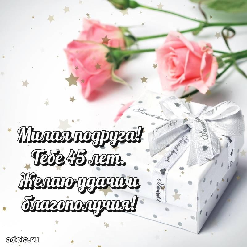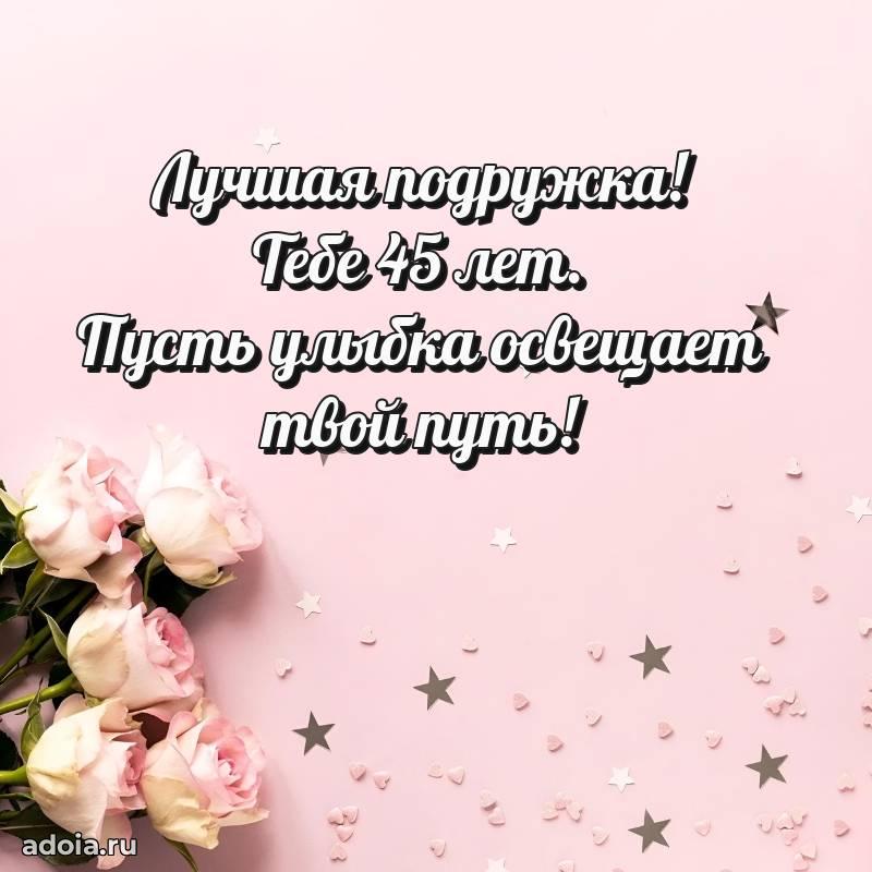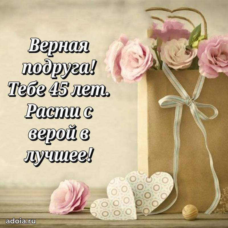 В поисках красивых и современных открыток? Вы попали по адресу! Здесь вы найдете картинки с днем рождения Подруге на 45 лет! Все картинки в высоком качестве, которые можно скачать или отправить через WhatsApp бесплатно. Также вы найдете много прикольных и мерцающих гифок и анимаций, которые поднимут настроение! Все открытки содержат поздравления в стихах и прозе.