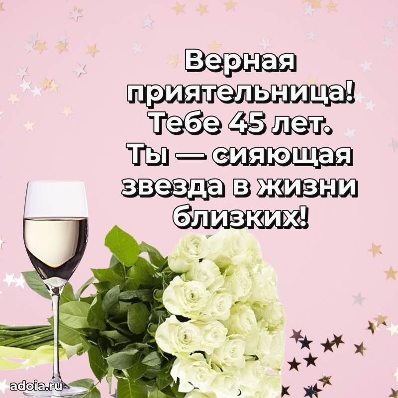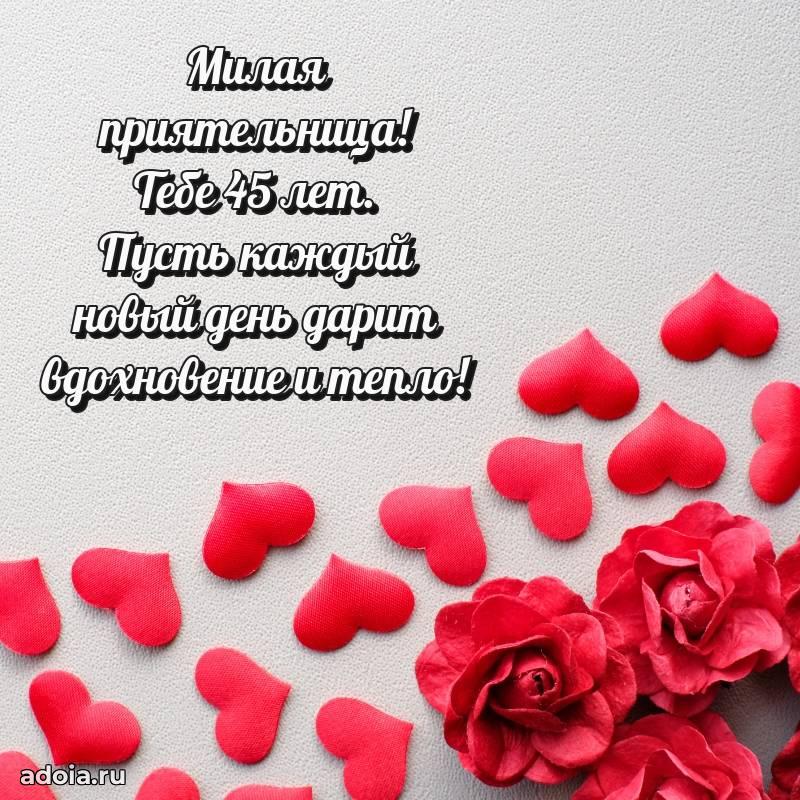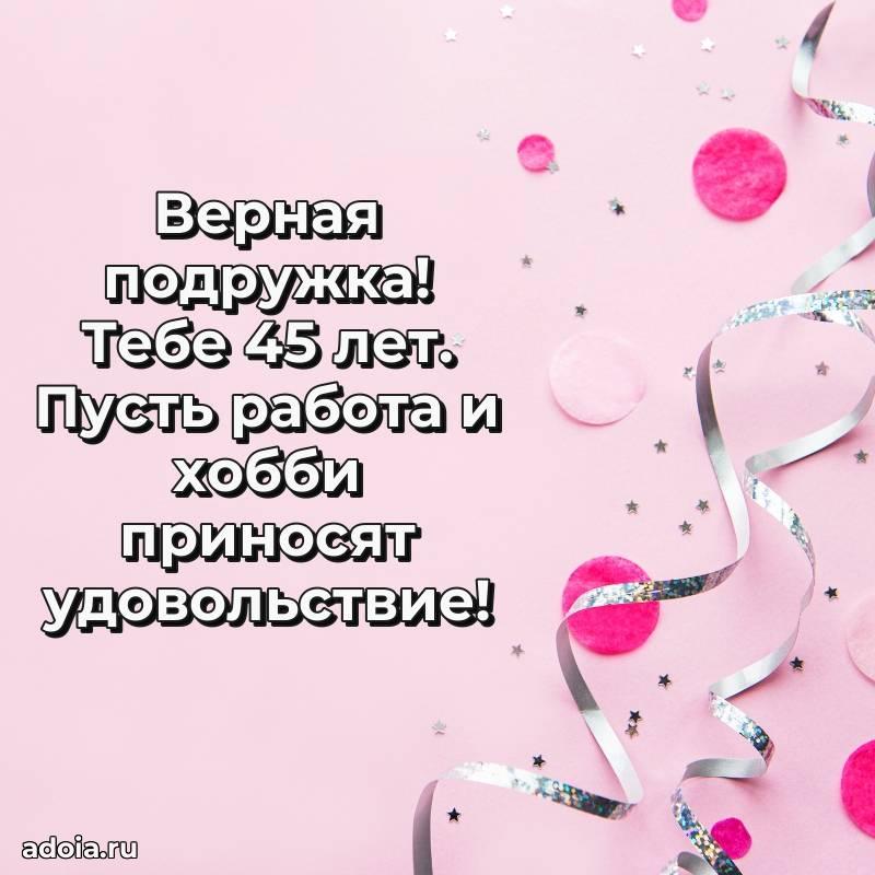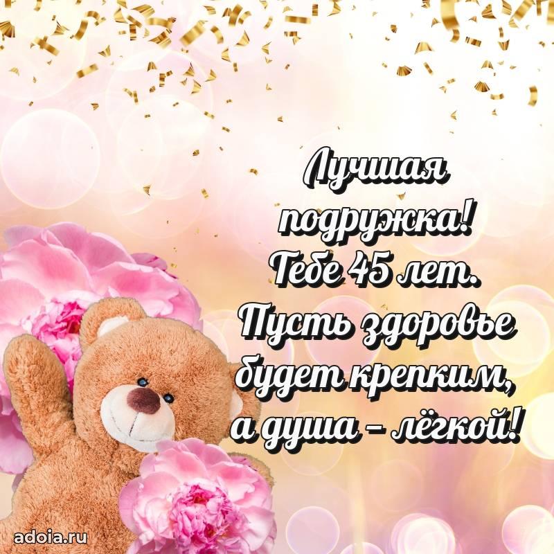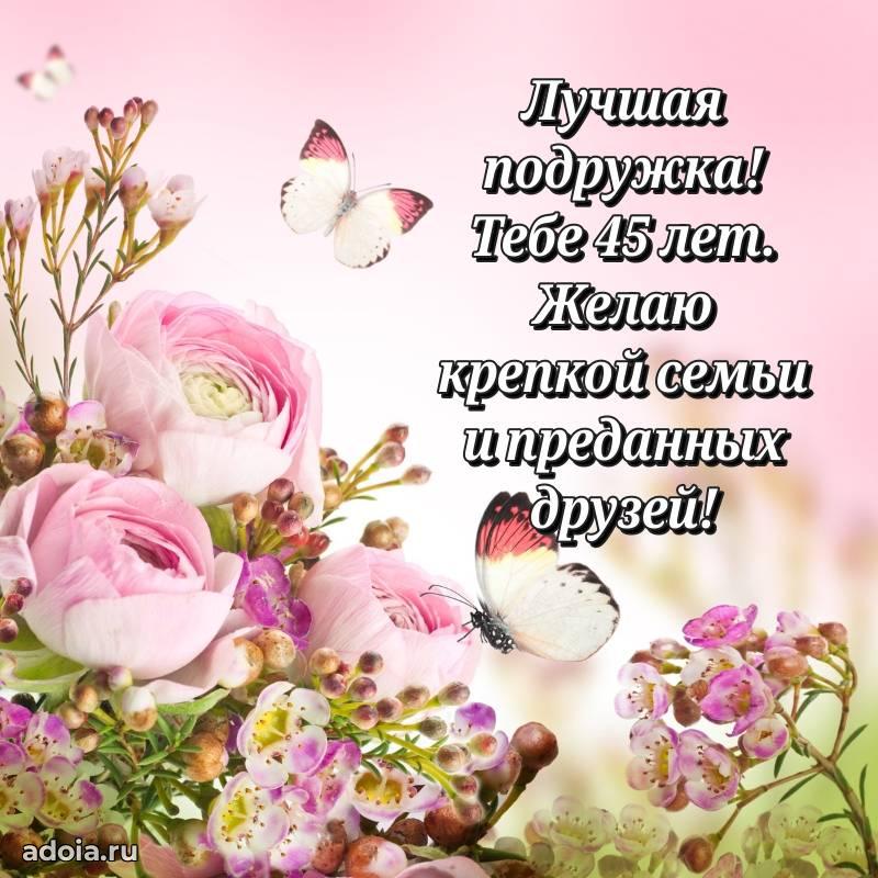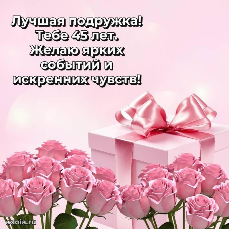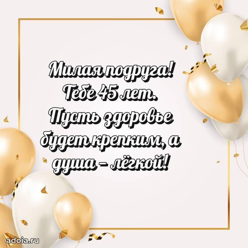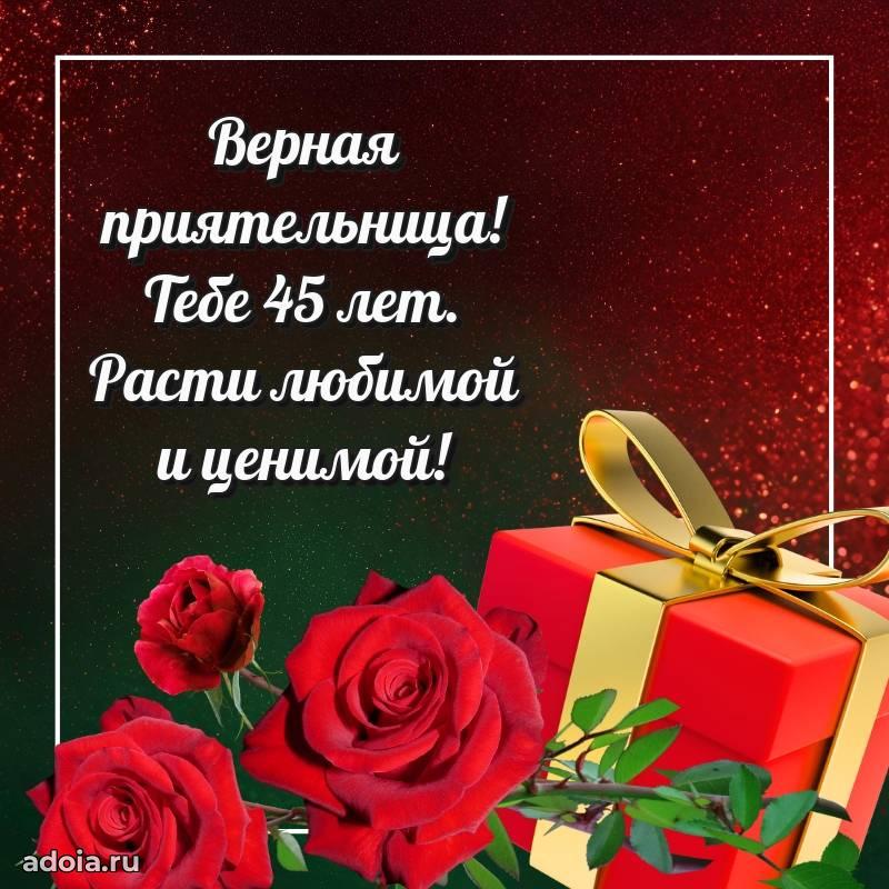 В поисках красивых и современных открыток? Вы попали по адресу! Здесь вы найдете картинки с днем рождения Подруге на 45 лет! Все картинки в высоком качестве, которые можно скачать или отправить через WhatsApp бесплатно. Также вы найдете много прикольных и мерцающих гифок и анимаций, которые поднимут настроение! Все открытки содержат поздравления в стихах и прозе.