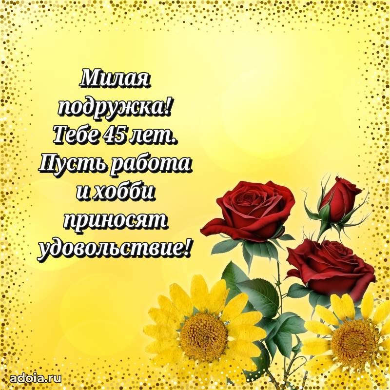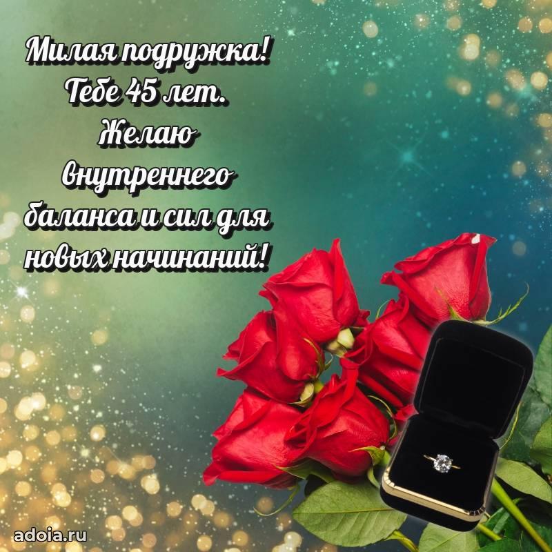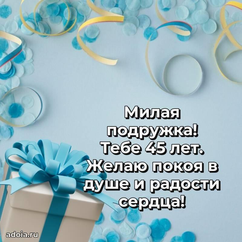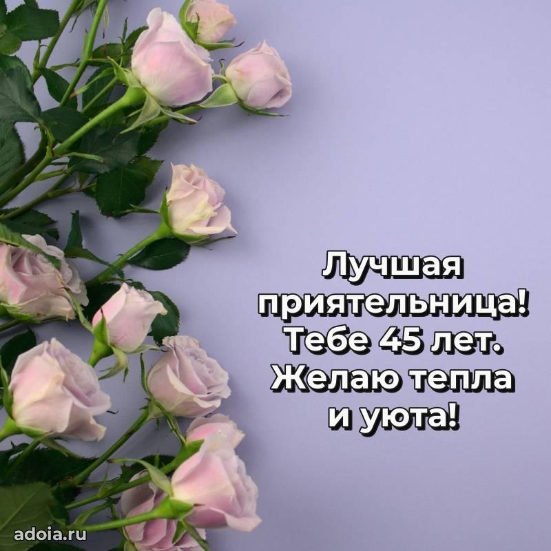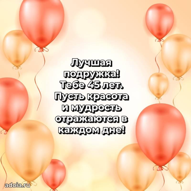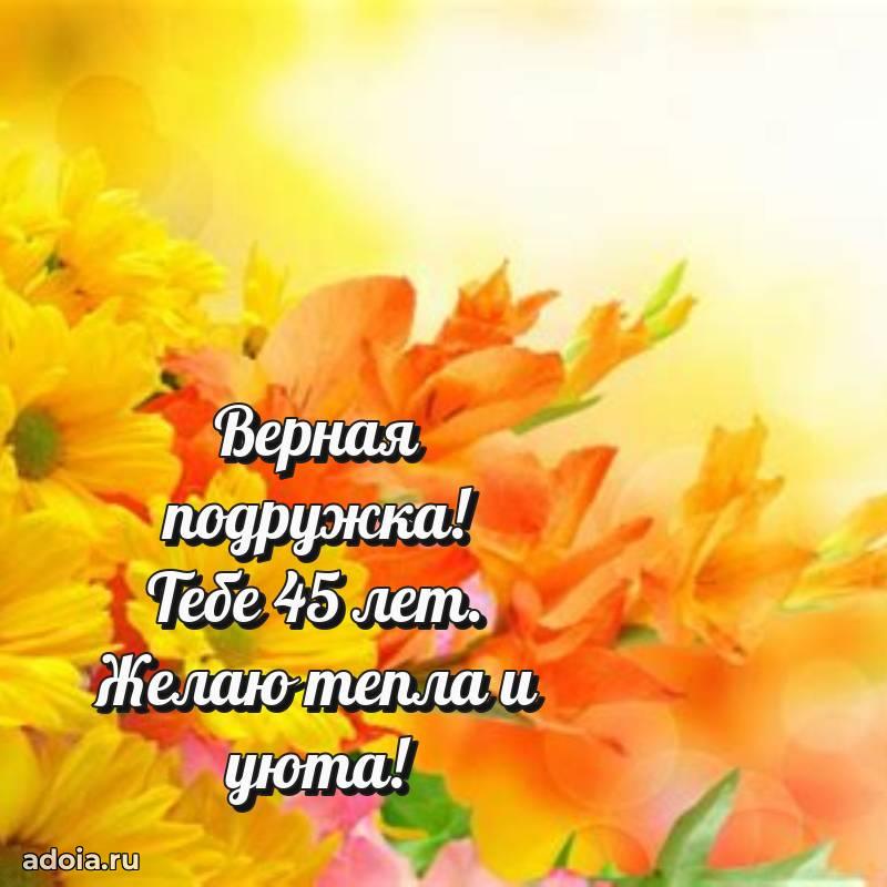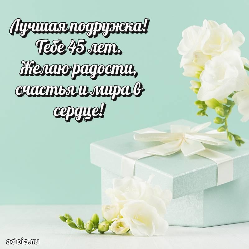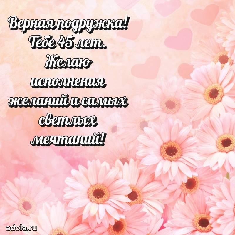 В поисках красивых и современных открыток? Вы попали по адресу! Здесь вы найдете картинки с днем рождения Подруге на 45 лет! Все картинки в высоком качестве, которые можно скачать или отправить через WhatsApp бесплатно. Также вы найдете много прикольных и мерцающих гифок и анимаций, которые поднимут настроение! Все открытки содержат поздравления в стихах и прозе.