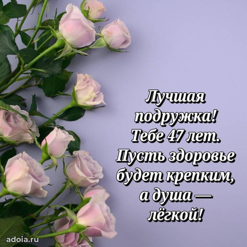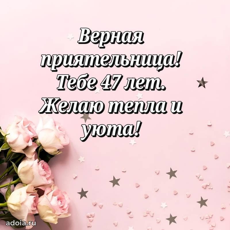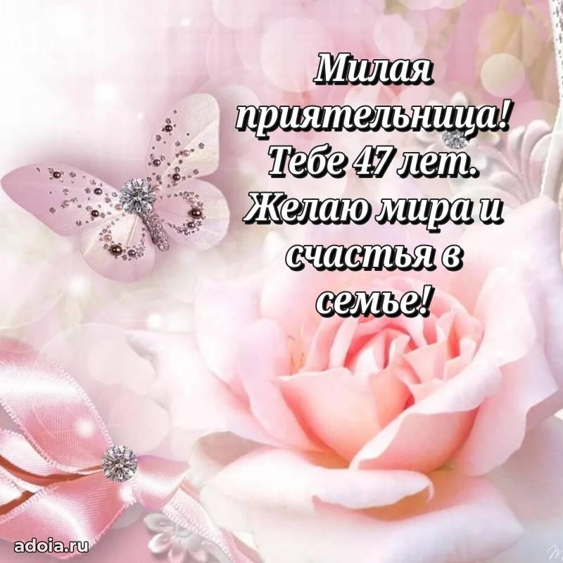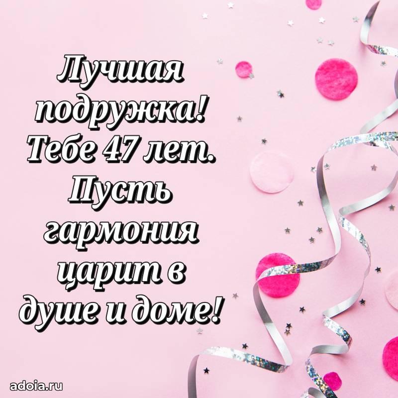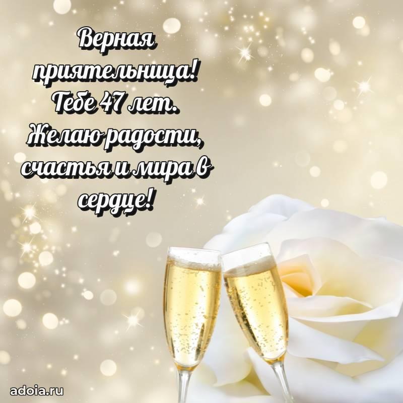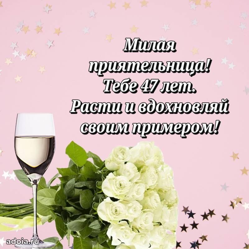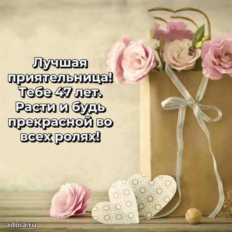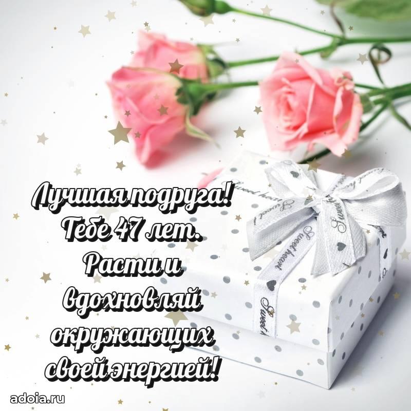 В поисках красивых и современных открыток? Вы попали по адресу! Здесь вы найдете картинки с днем рождения Подруге на 47 лет! Все картинки в высоком качестве, которые можно скачать или отправить через WhatsApp бесплатно. Также вы найдете много прикольных и мерцающих гифок и анимаций, которые поднимут настроение! Все открытки содержат поздравления в стихах и прозе.