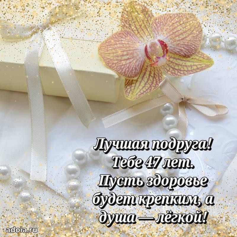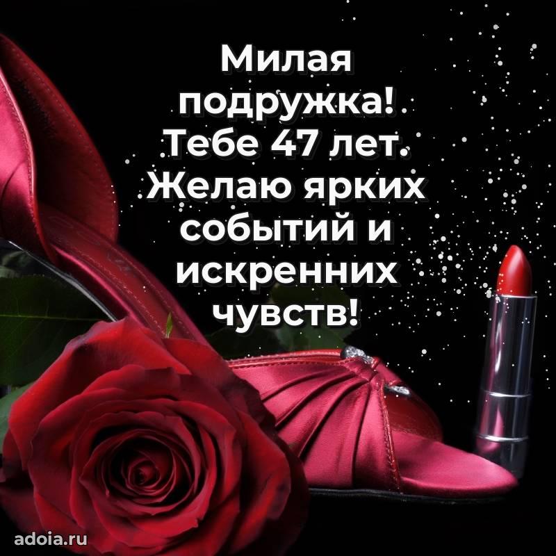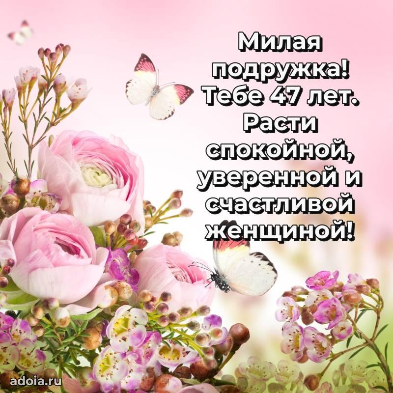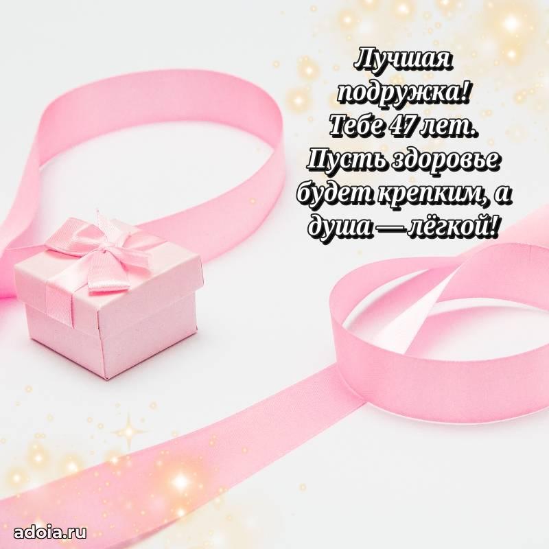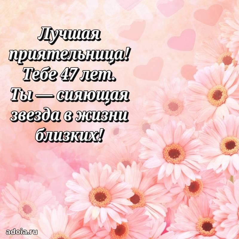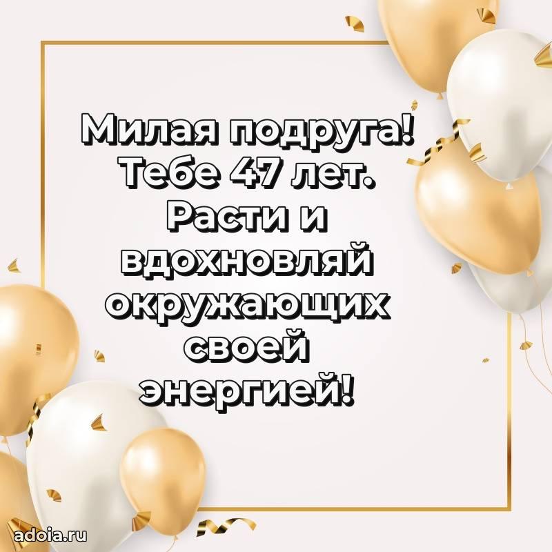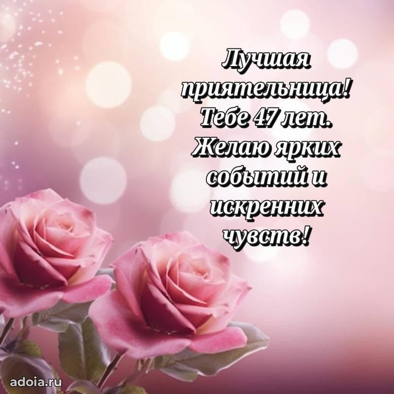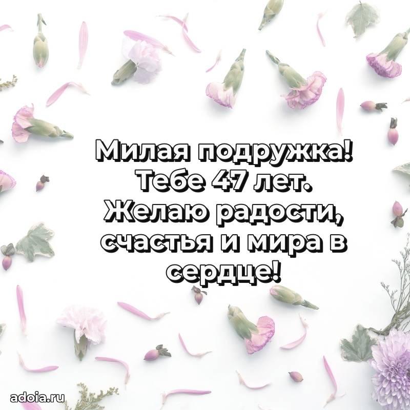 В поисках красивых и современных открыток? Вы попали по адресу! Здесь вы найдете картинки с днем рождения Подруге на 47 лет! Все картинки в высоком качестве, которые можно скачать или отправить через WhatsApp бесплатно. Также вы найдете много прикольных и мерцающих гифок и анимаций, которые поднимут настроение! Все открытки содержат поздравления в стихах и прозе.