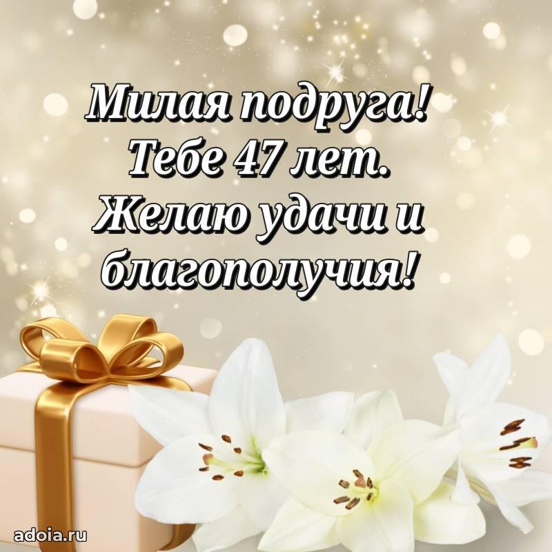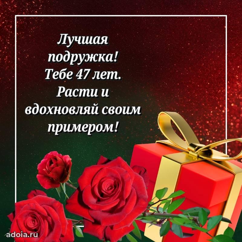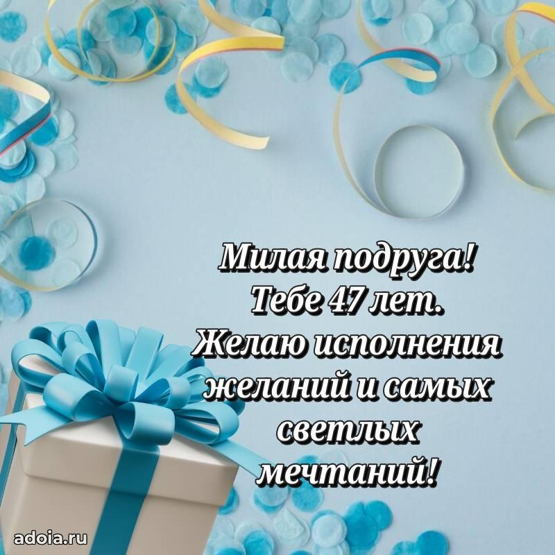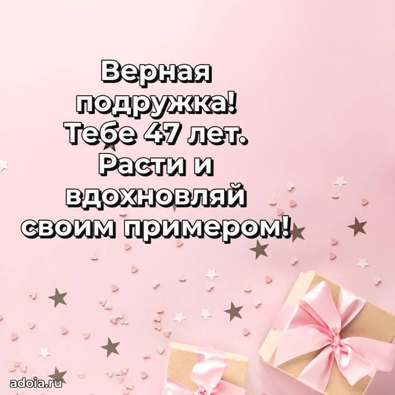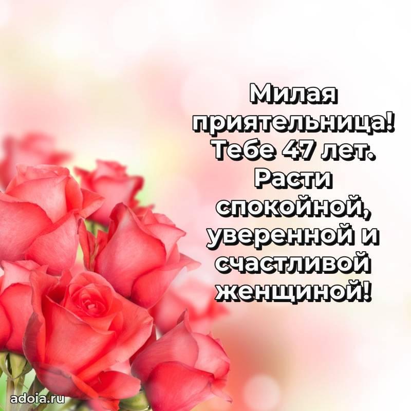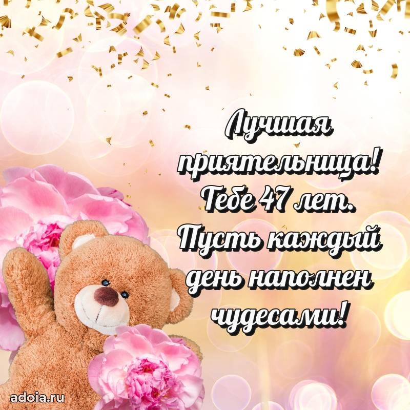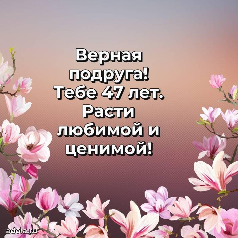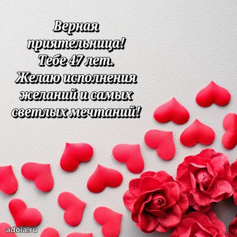 В поисках красивых и современных открыток? Вы попали по адресу! Здесь вы найдете картинки с днем рождения Подруге на 47 лет! Все картинки в высоком качестве, которые можно скачать или отправить через WhatsApp бесплатно. Также вы найдете много прикольных и мерцающих гифок и анимаций, которые поднимут настроение! Все открытки содержат поздравления в стихах и прозе.