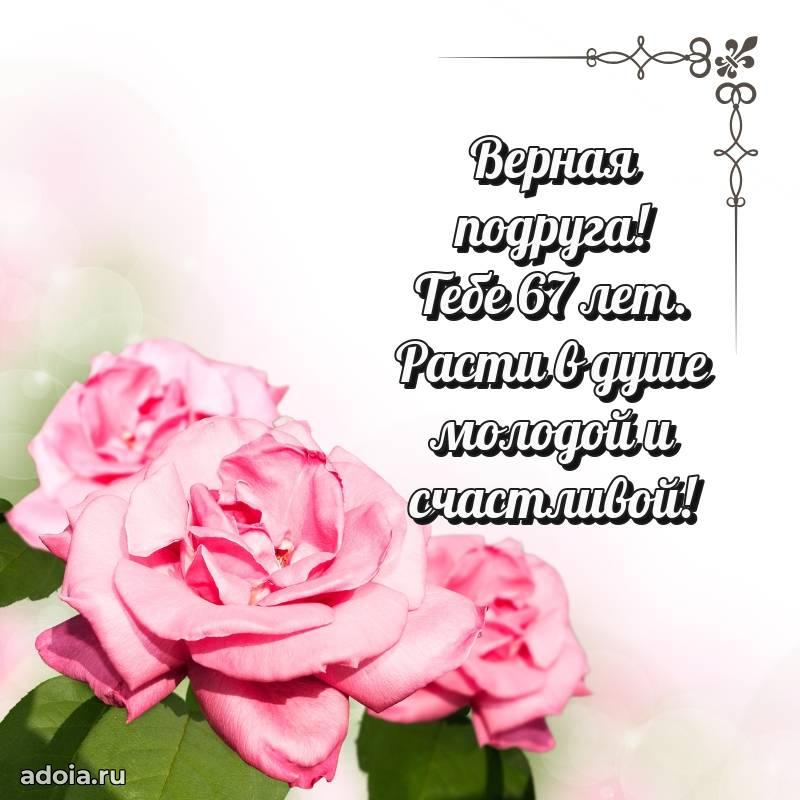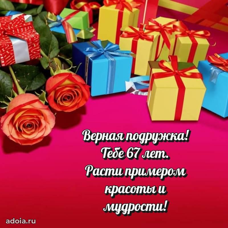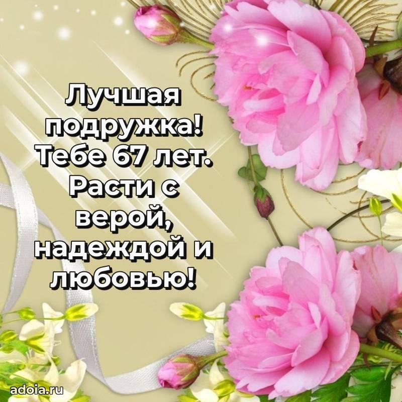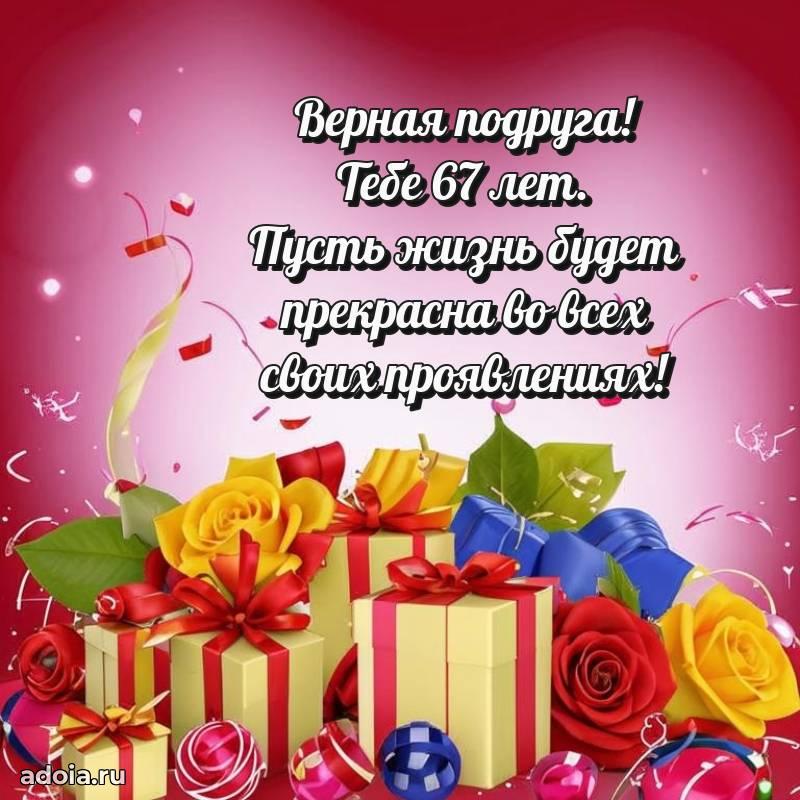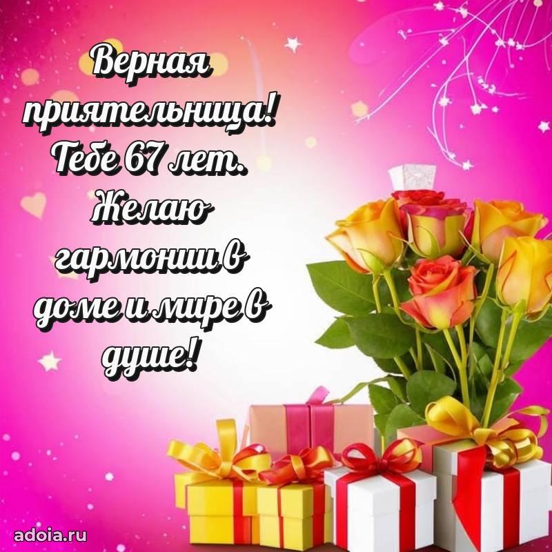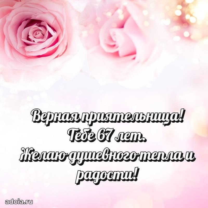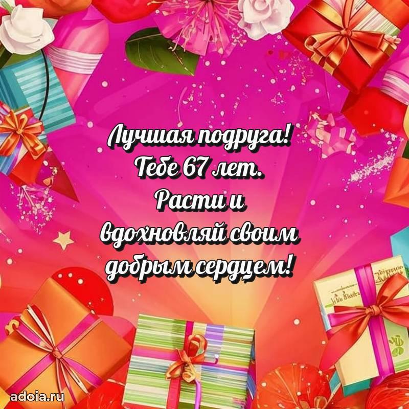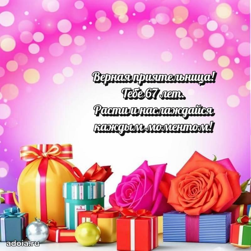 В поисках красивых и современных открыток? Вы попали по адресу! Здесь вы найдете картинки с днем рождения Подруге на 67 лет! Все картинки в высоком качестве, которые можно скачать или отправить через WhatsApp бесплатно. Также вы найдете много прикольных и мерцающих гифок и анимаций, которые поднимут настроение! Все открытки содержат поздравления в стихах и прозе.