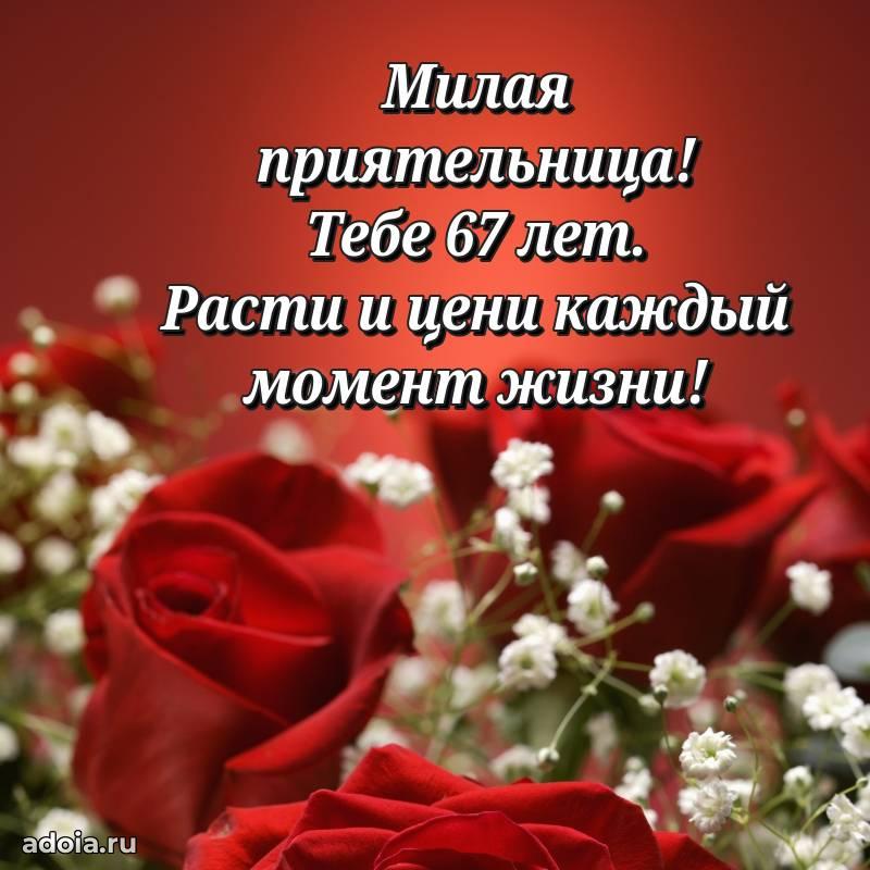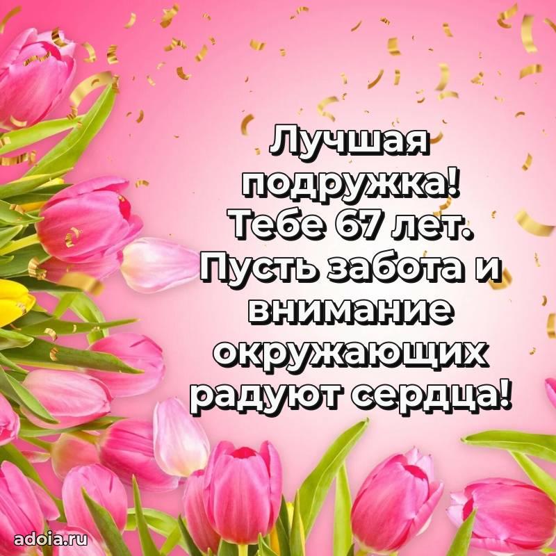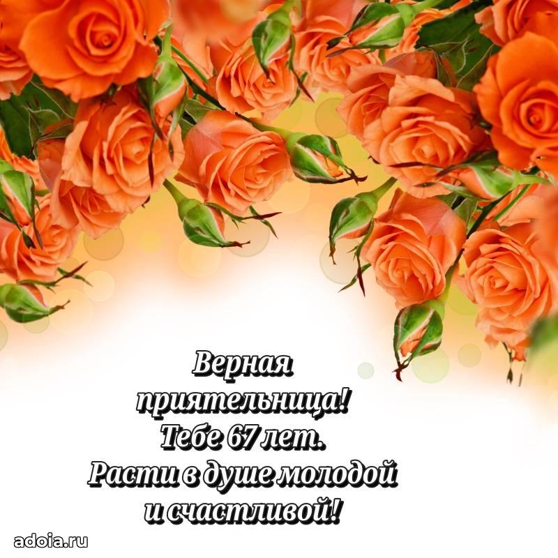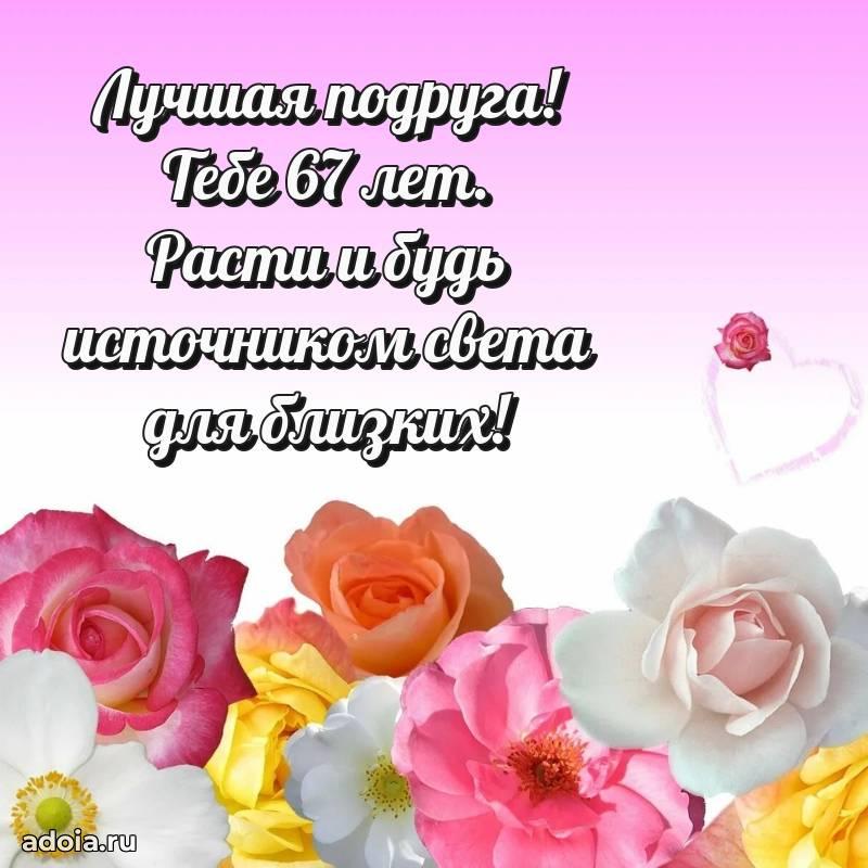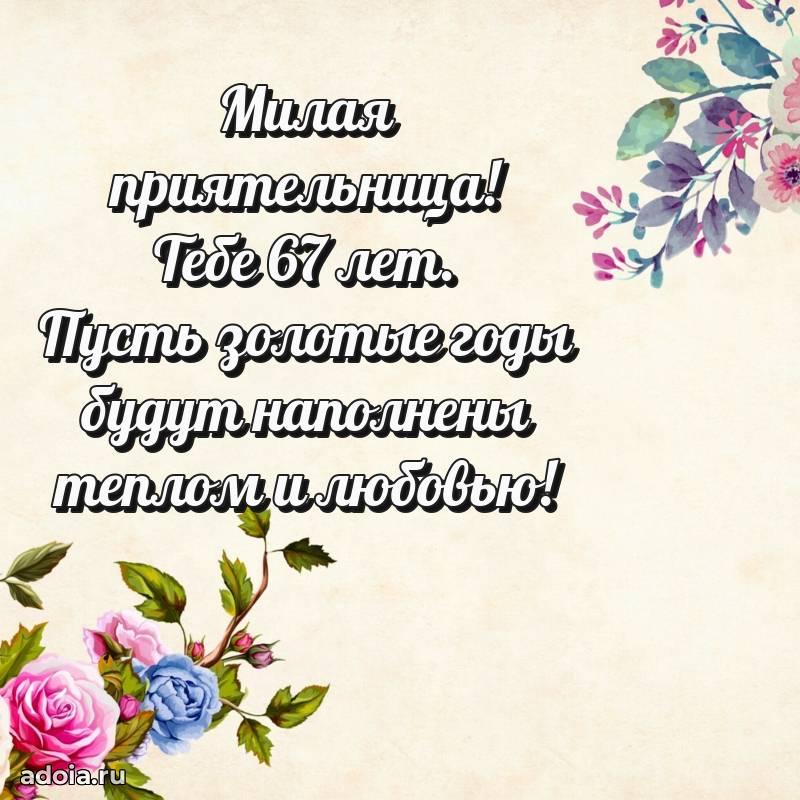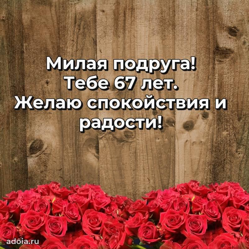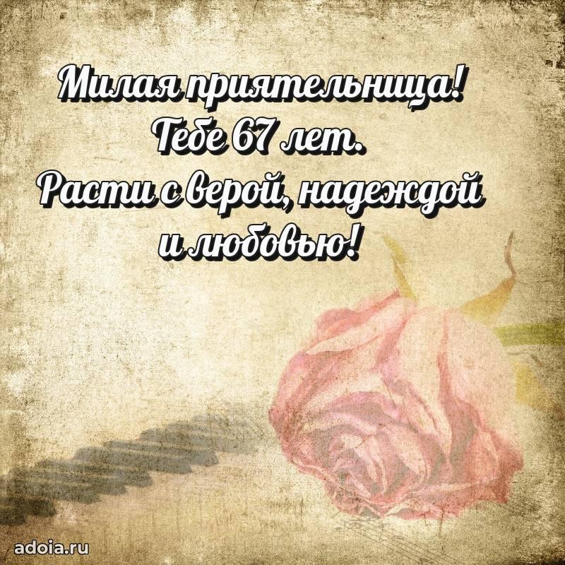 В поисках красивых и современных открыток? Вы попали по адресу! Здесь вы найдете картинки с днем рождения Подруге на 67 лет! Все картинки в высоком качестве, которые можно скачать или отправить через WhatsApp бесплатно. Также вы найдете много прикольных и мерцающих гифок и анимаций, которые поднимут настроение! Все открытки содержат поздравления в стихах и прозе.