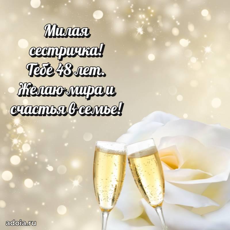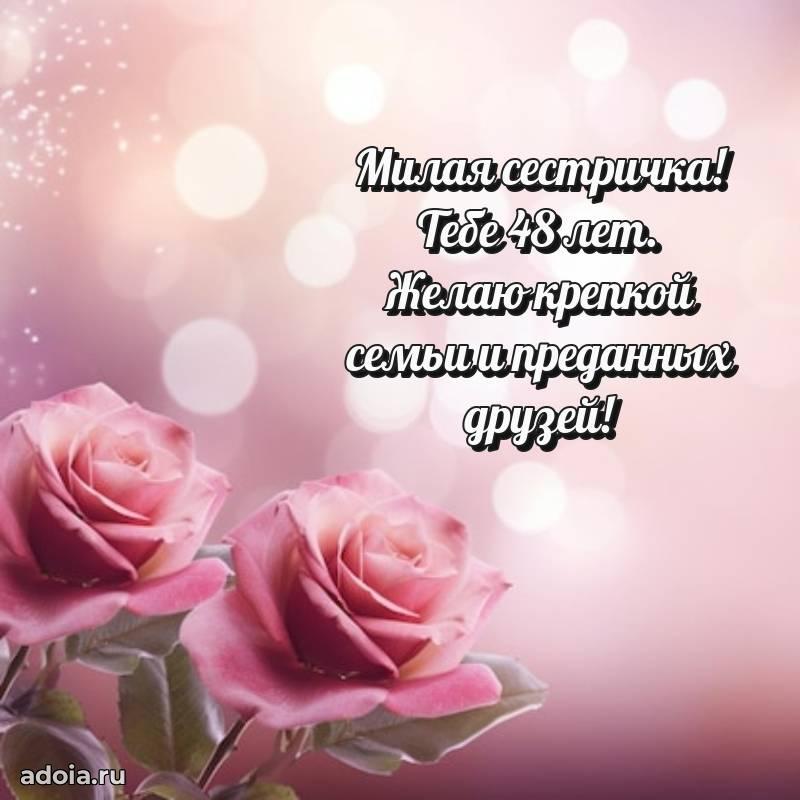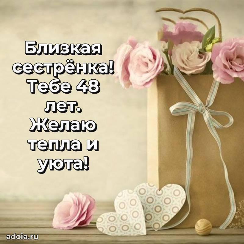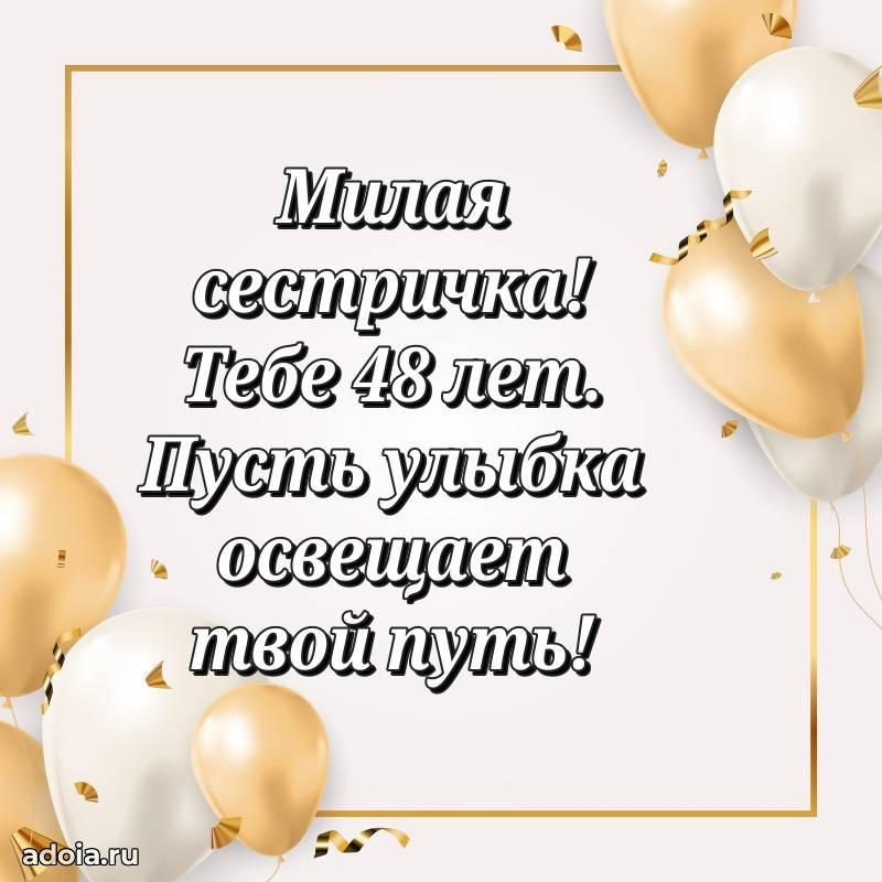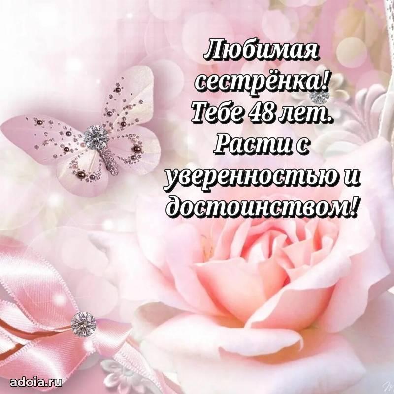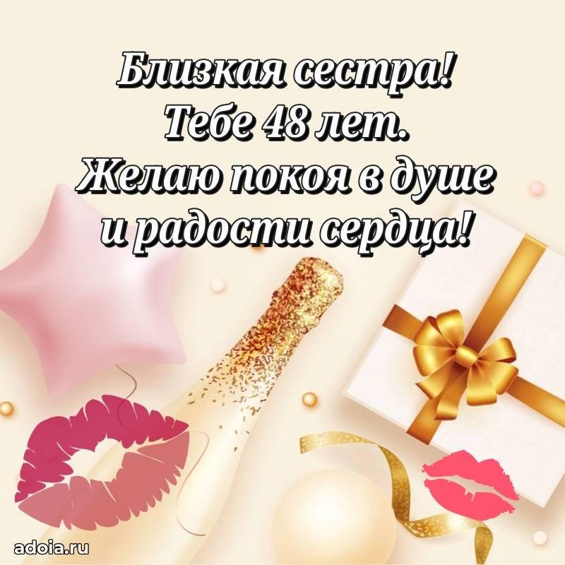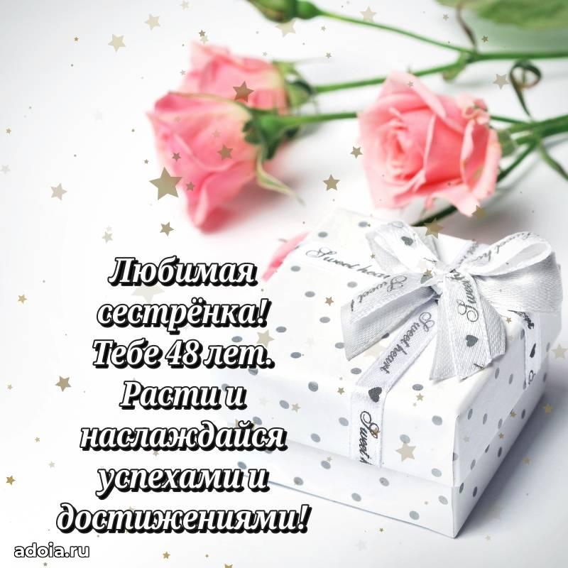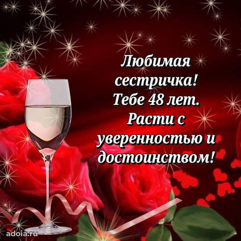В поисках красивых и современных открыток? Вы попали по адресу! Здесь вы найдете картинки с днем рождения Сестре на 48 лет! Все картинки в высоком качестве, которые можно скачать или отправить через WhatsApp бесплатно. Также вы найдете много прикольных и мерцающих гифок и анимаций, которые поднимут настроение! Все открытки содержат поздравления в стихах и прозе.