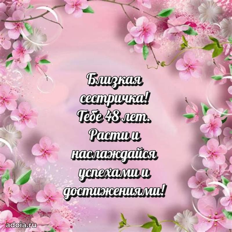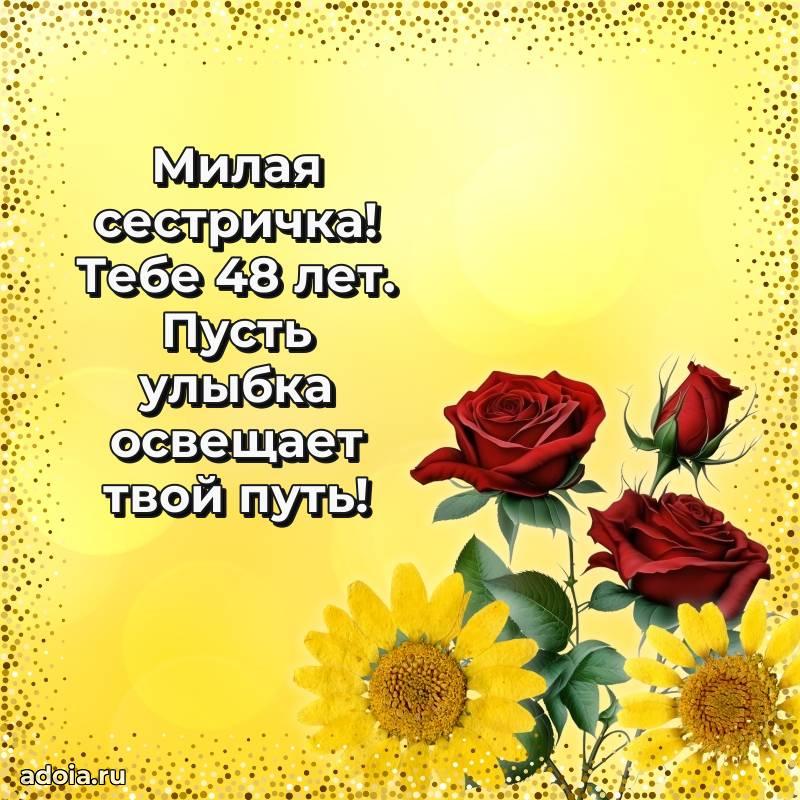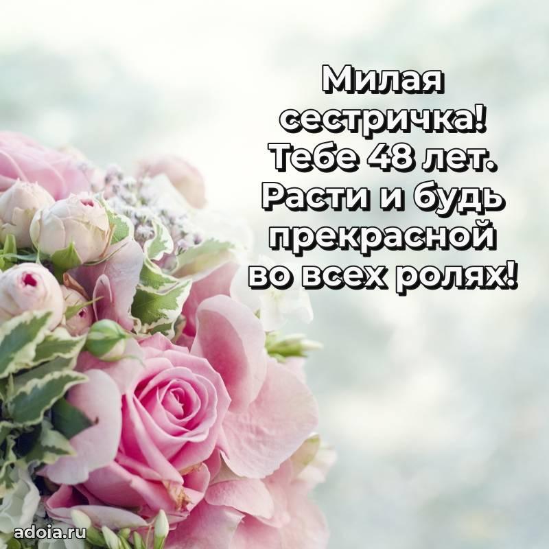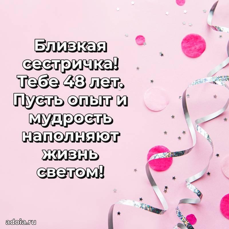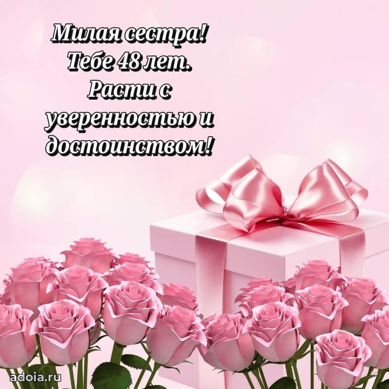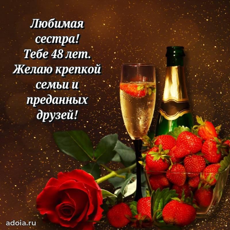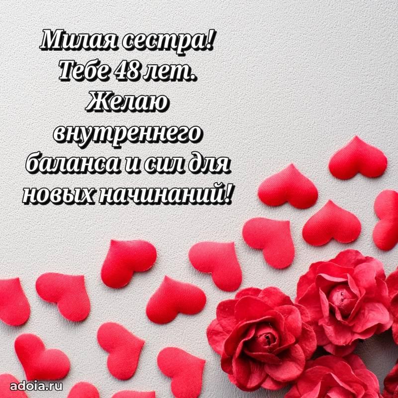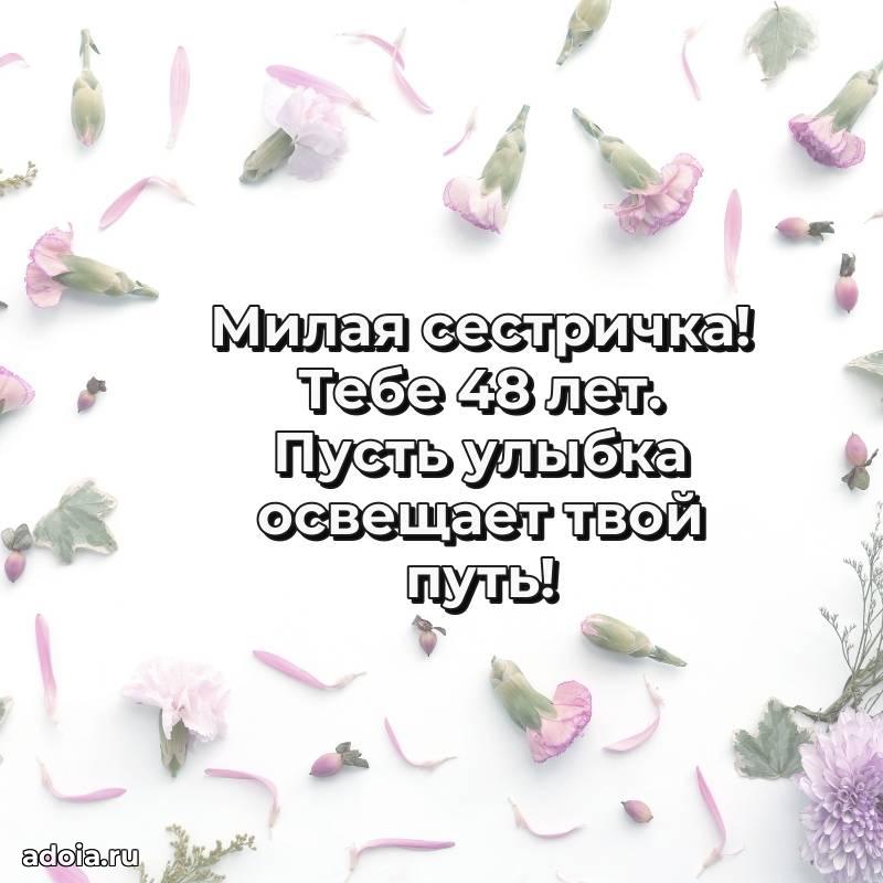 В поисках красивых и современных открыток? Вы попали по адресу! Здесь вы найдете картинки с днем рождения Сестре на 48 лет! Все картинки в высоком качестве, которые можно скачать или отправить через WhatsApp бесплатно. Также вы найдете много прикольных и мерцающих гифок и анимаций, которые поднимут настроение! Все открытки содержат поздравления в стихах и прозе.