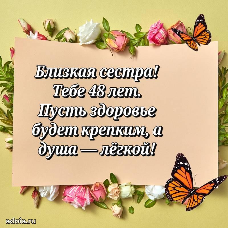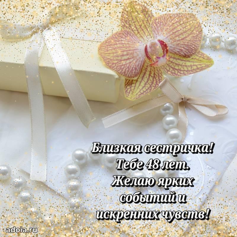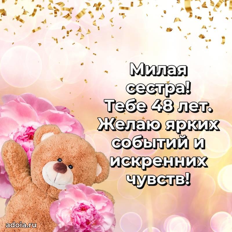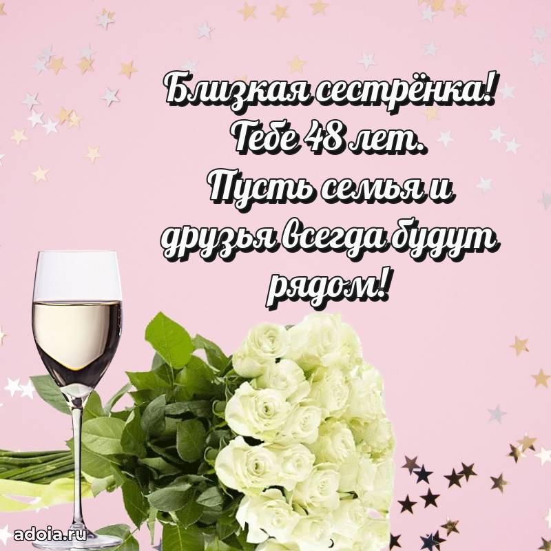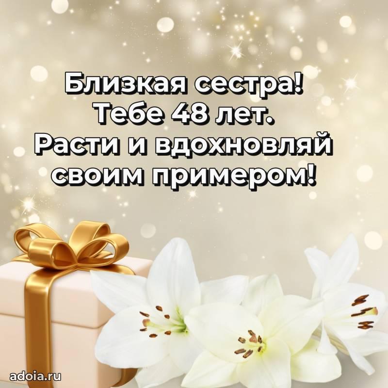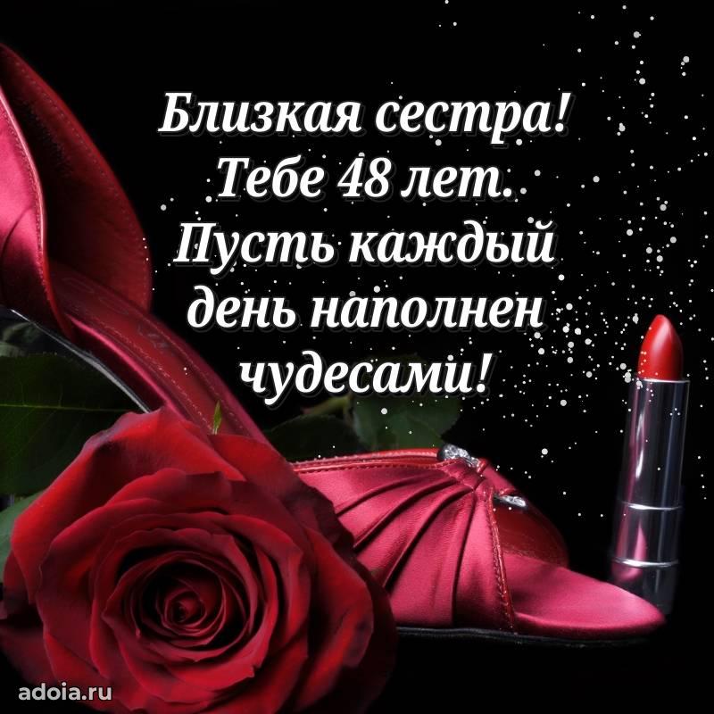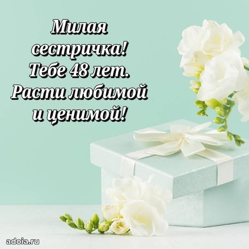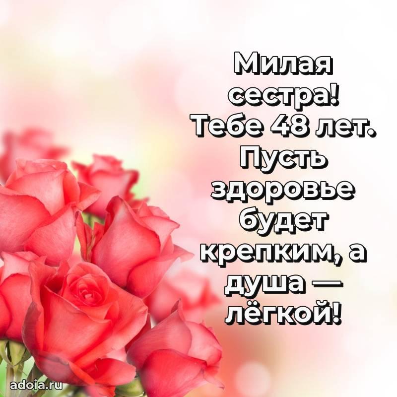 В поисках красивых и современных открыток? Вы попали по адресу! Здесь вы найдете картинки с днем рождения Сестре на 48 лет! Все картинки в высоком качестве, которые можно скачать или отправить через WhatsApp бесплатно. Также вы найдете много прикольных и мерцающих гифок и анимаций, которые поднимут настроение! Все открытки содержат поздравления в стихах и прозе.