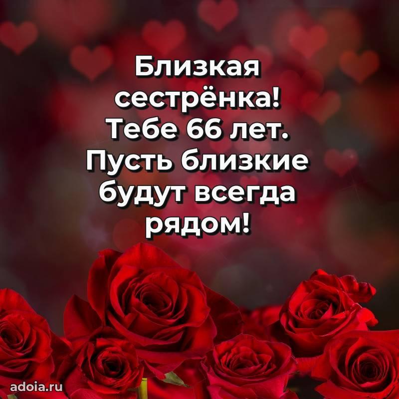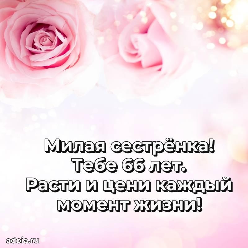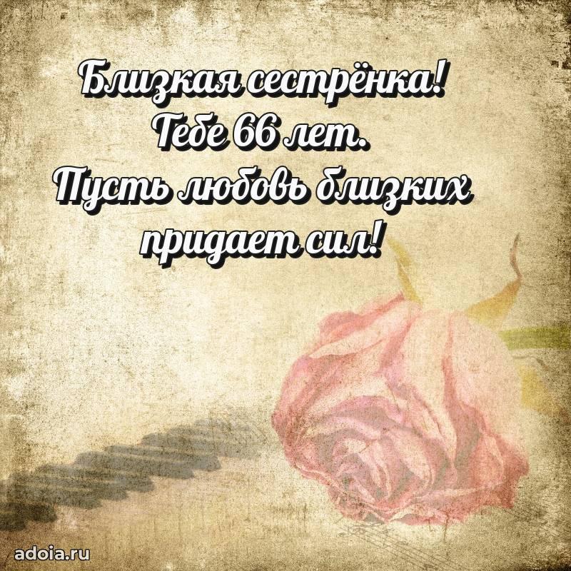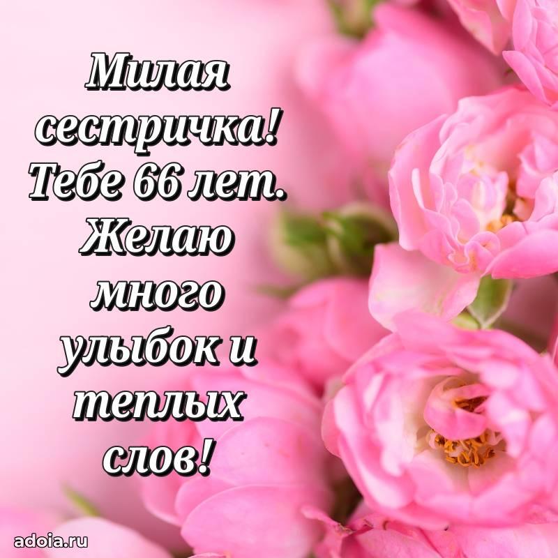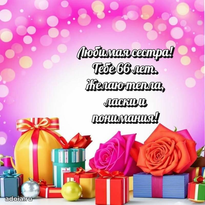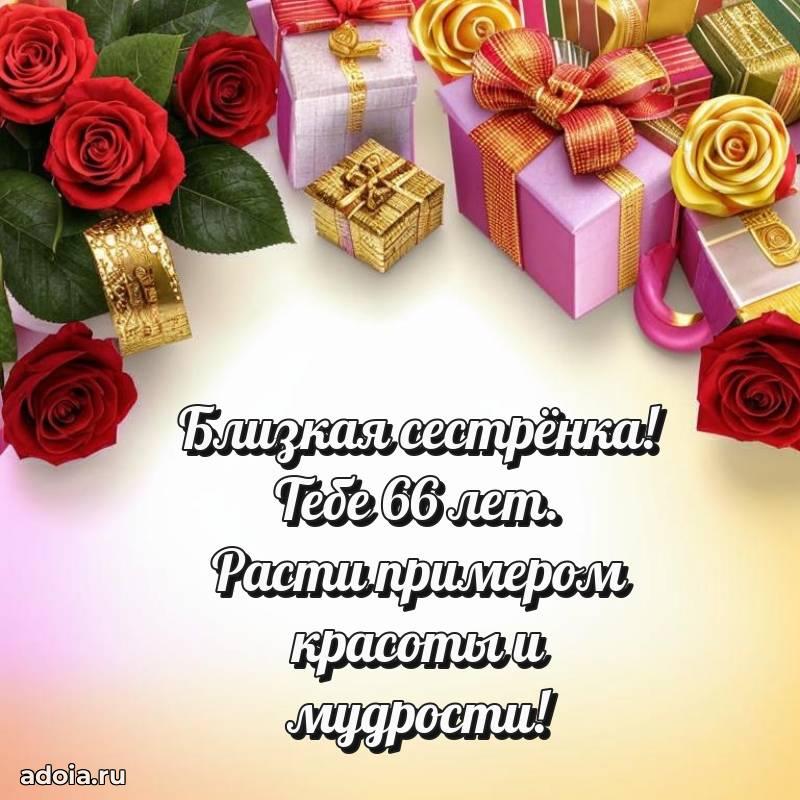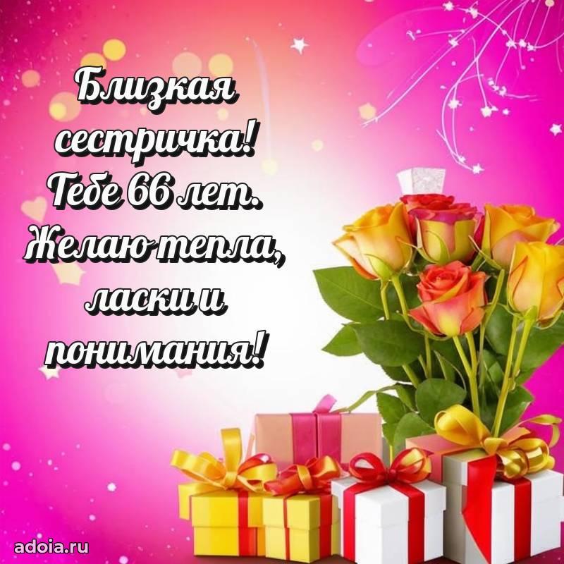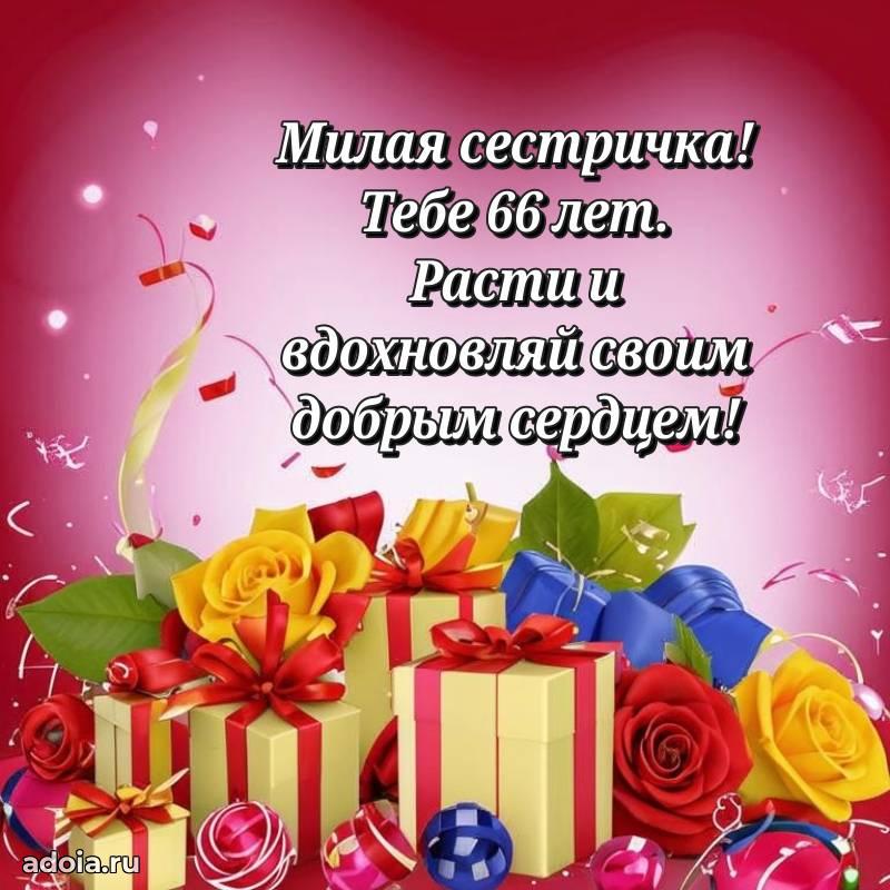 В поисках красивых и современных открыток? Вы попали по адресу! Здесь вы найдете картинки с днем рождения Сестре на 66 лет! Все картинки в высоком качестве, которые можно скачать или отправить через WhatsApp бесплатно. Также вы найдете много прикольных и мерцающих гифок и анимаций, которые поднимут настроение! Все открытки содержат поздравления в стихах и прозе.
