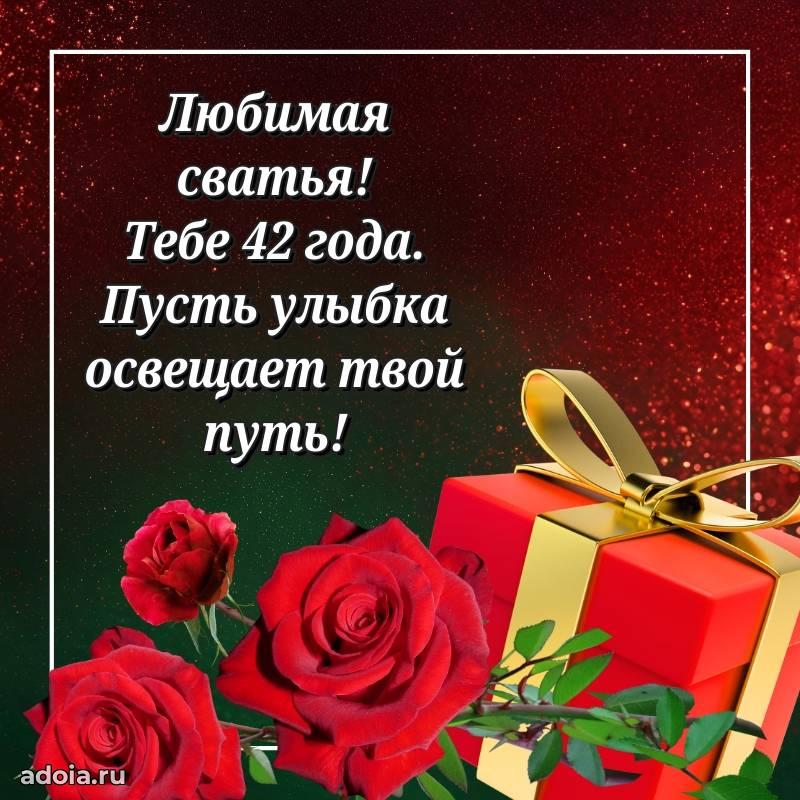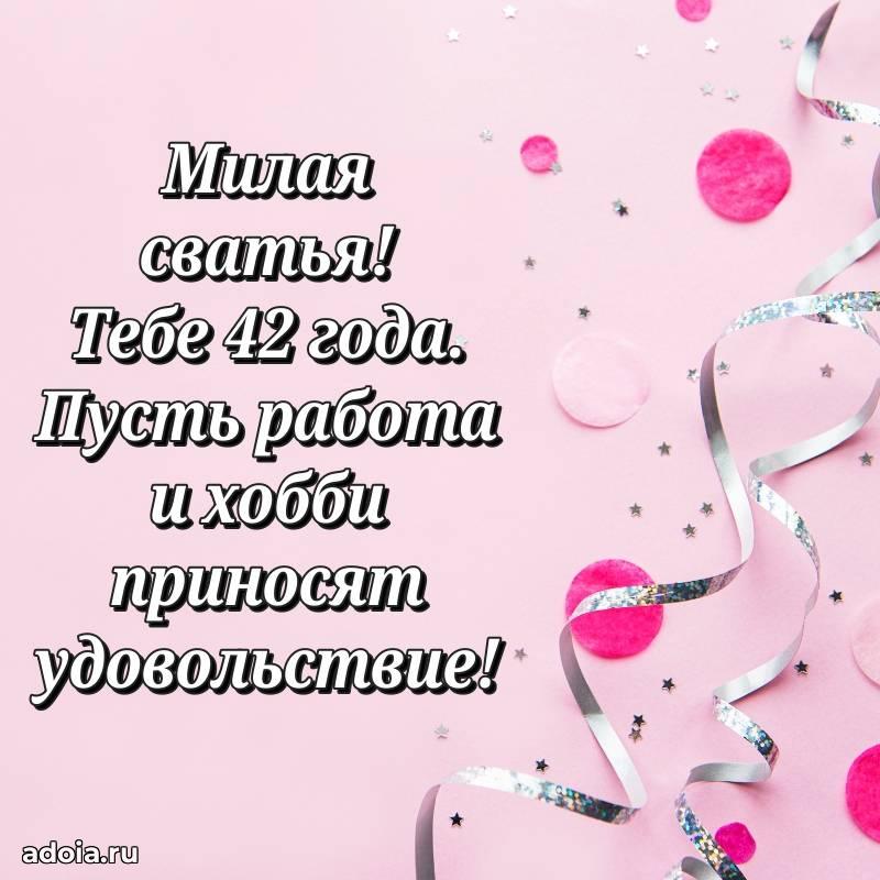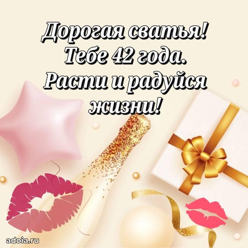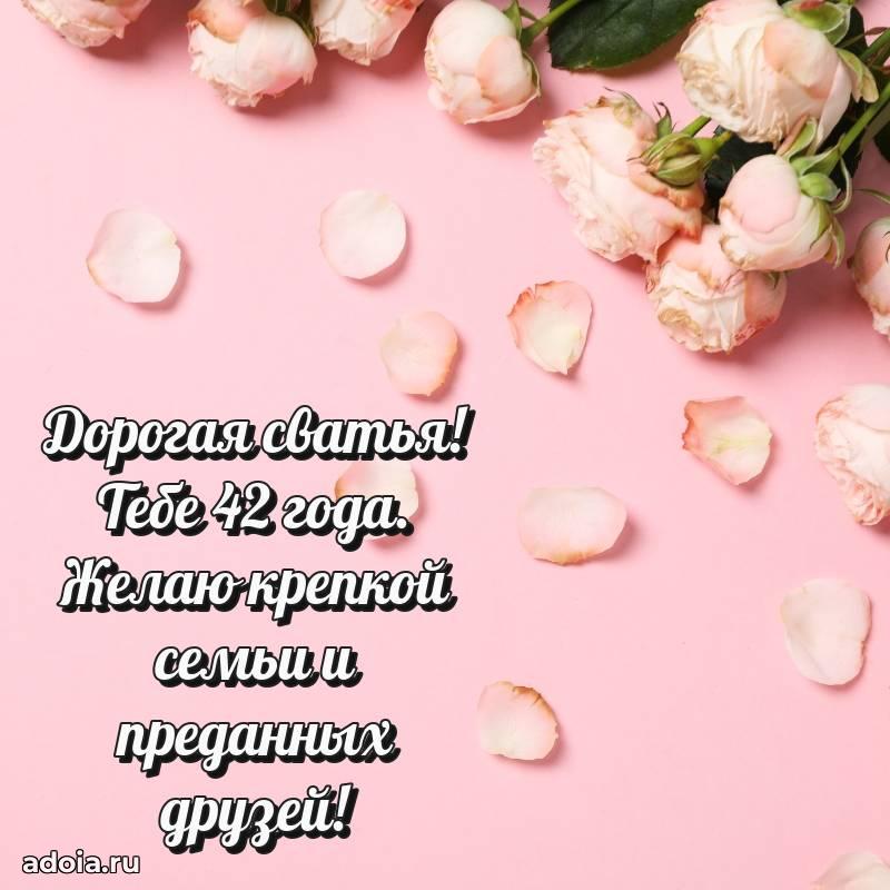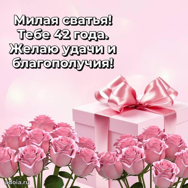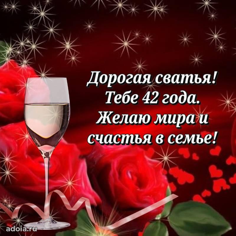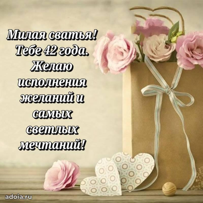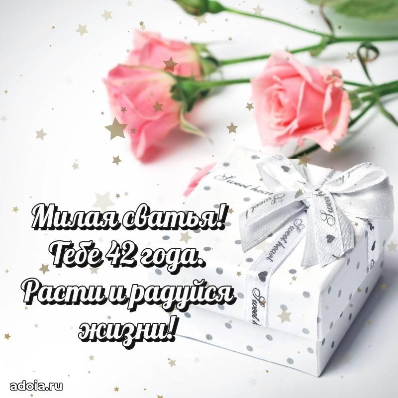 В поисках красивых и современных открыток? Вы попали по адресу! Здесь вы найдете картинки с днем рождения Сватье на 42 года! Все картинки в высоком качестве, которые можно скачать или отправить через WhatsApp бесплатно. Также вы найдете много прикольных и мерцающих гифок и анимаций, которые поднимут настроение! Все открытки содержат поздравления в стихах и прозе.