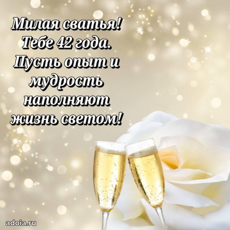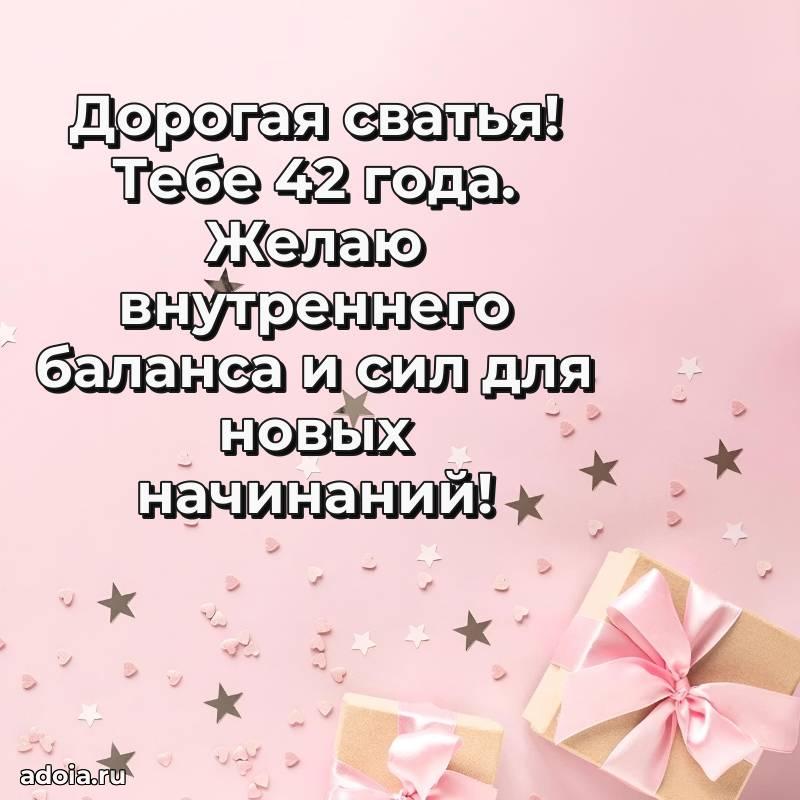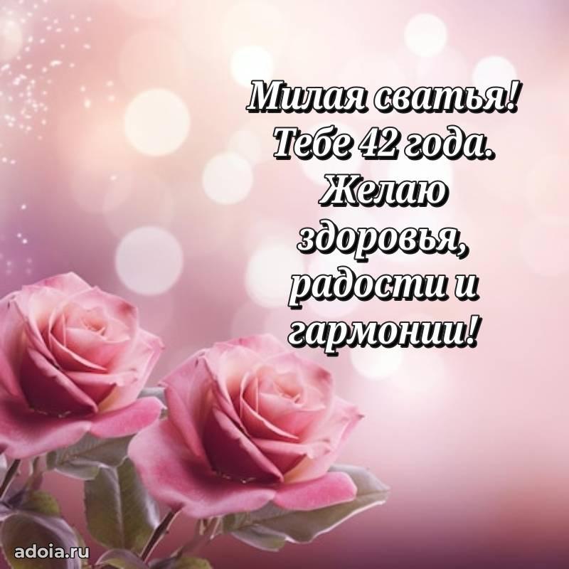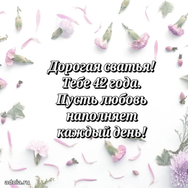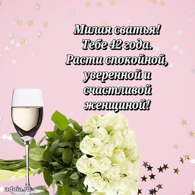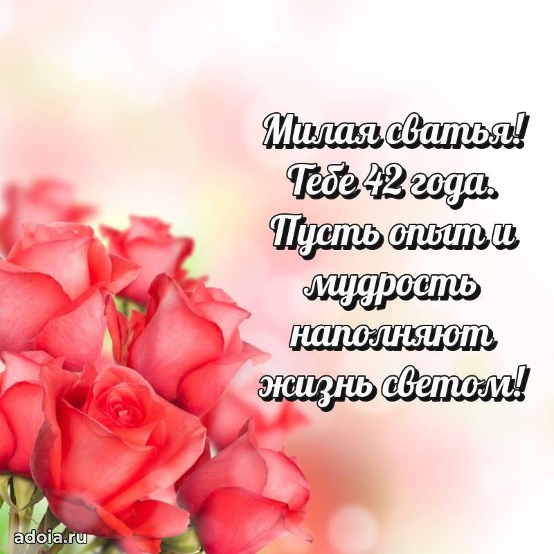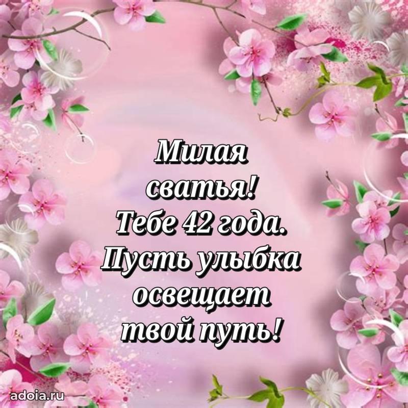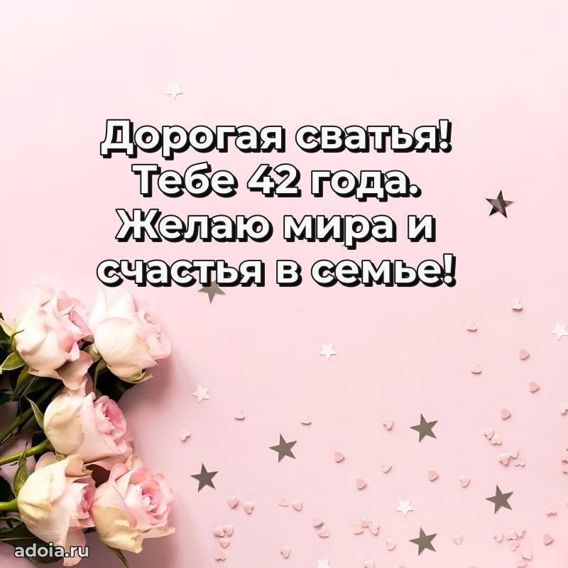 В поисках красивых и современных открыток? Вы попали по адресу! Здесь вы найдете картинки с днем рождения Сватье на 42 года! Все картинки в высоком качестве, которые можно скачать или отправить через WhatsApp бесплатно. Также вы найдете много прикольных и мерцающих гифок и анимаций, которые поднимут настроение! Все открытки содержат поздравления в стихах и прозе.