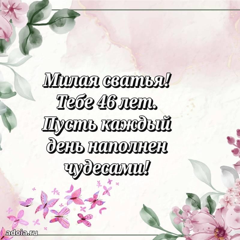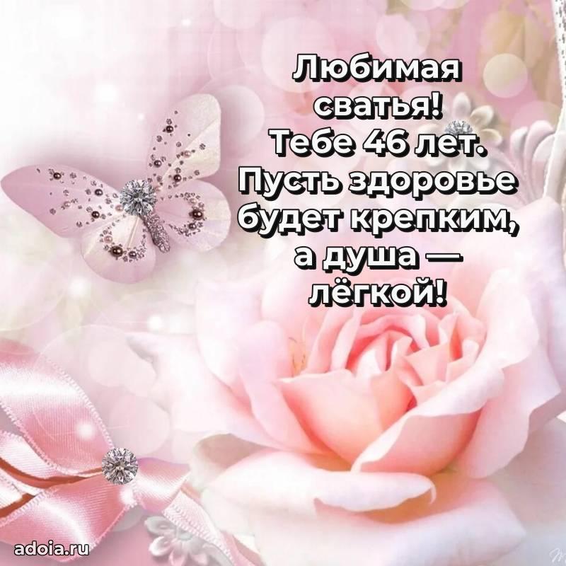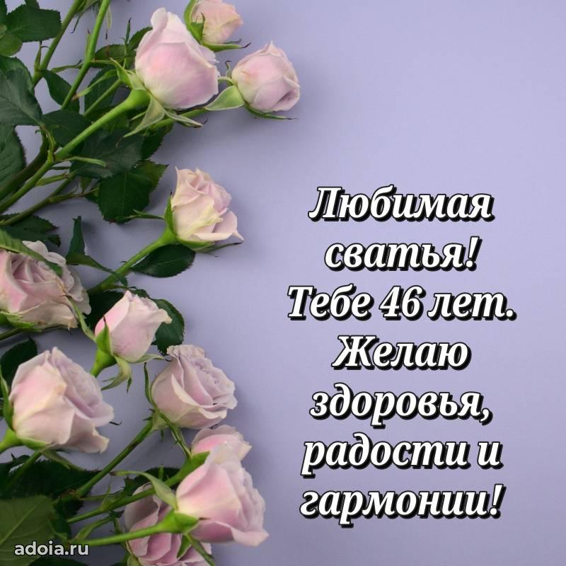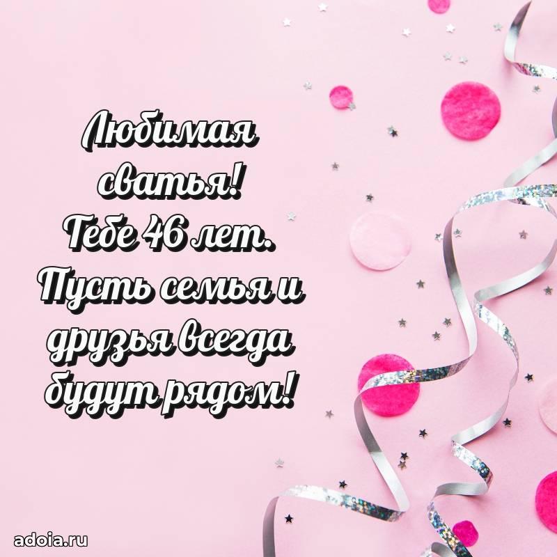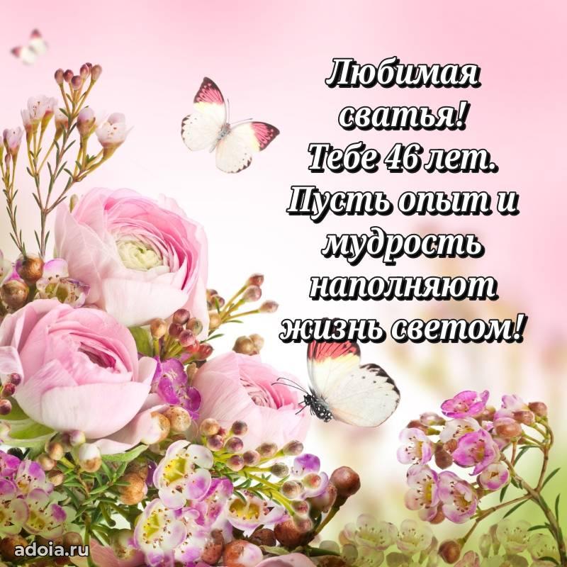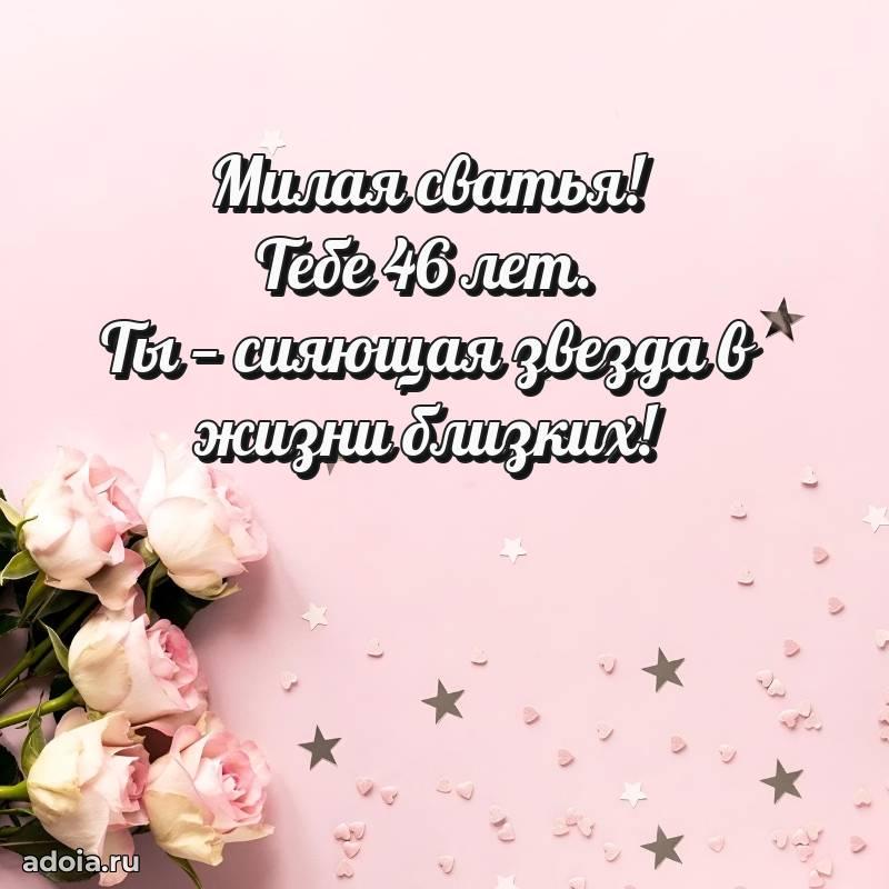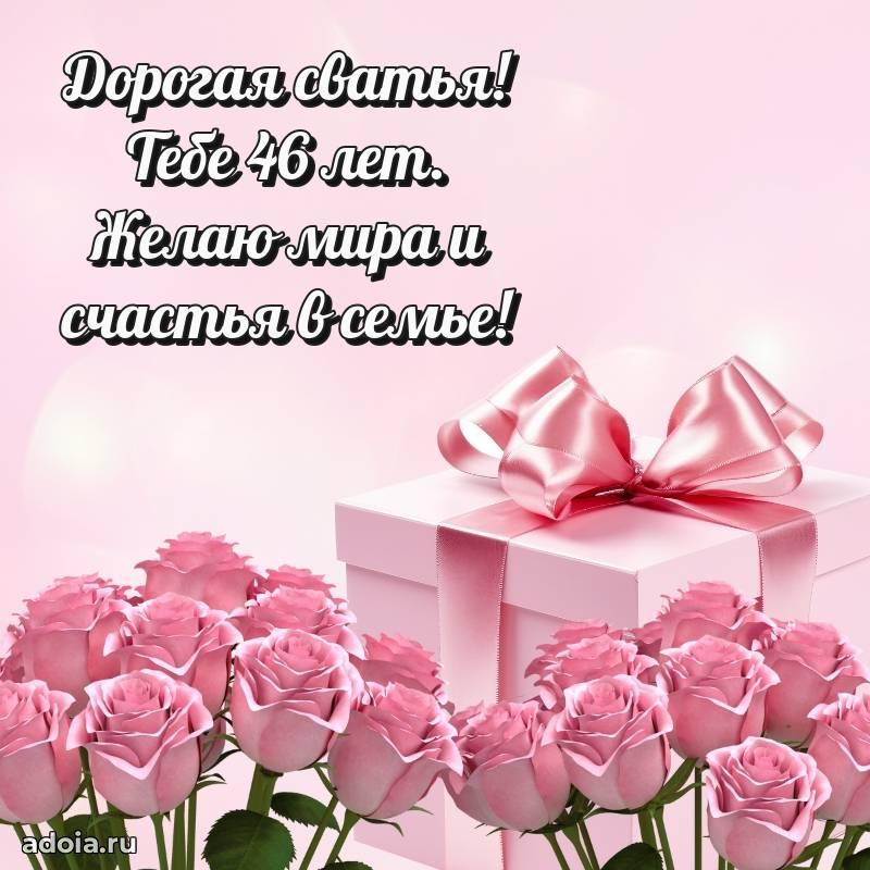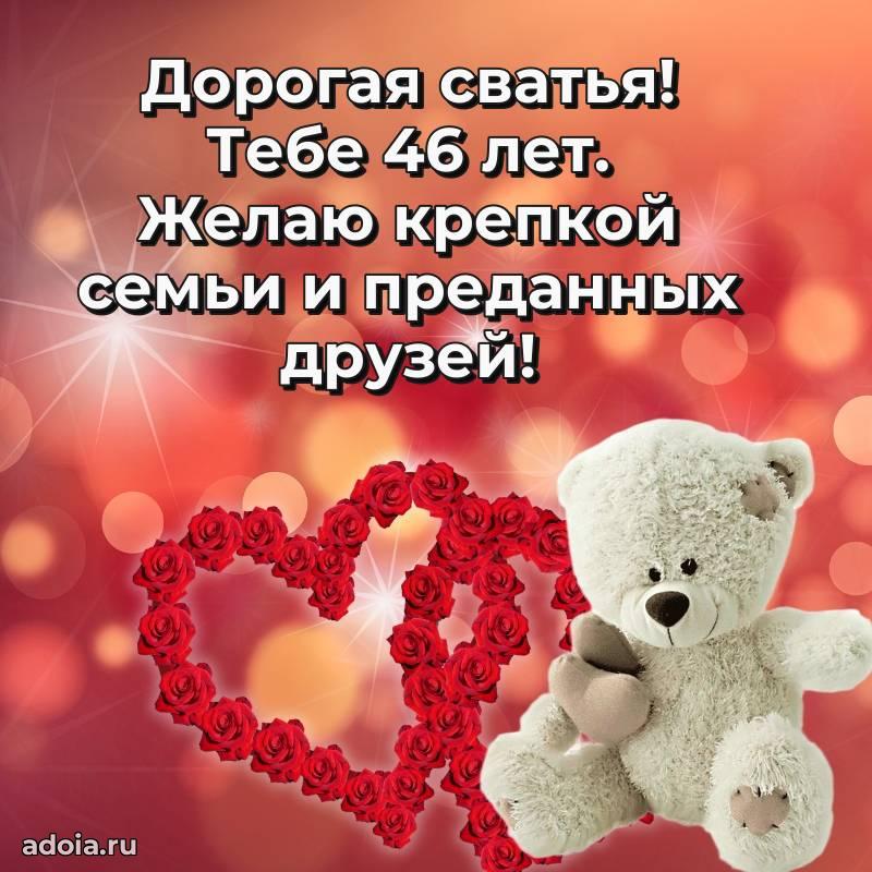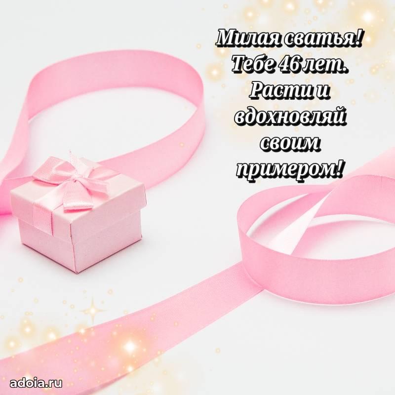 В поисках красивых и современных открыток? Вы попали по адресу! Здесь вы найдете картинки с днем рождения Сватье на 46 лет! Все картинки в высоком качестве, которые можно скачать или отправить через WhatsApp бесплатно. Также вы найдете много прикольных и мерцающих гифок и анимаций, которые поднимут настроение! Все открытки содержат поздравления в стихах и прозе.