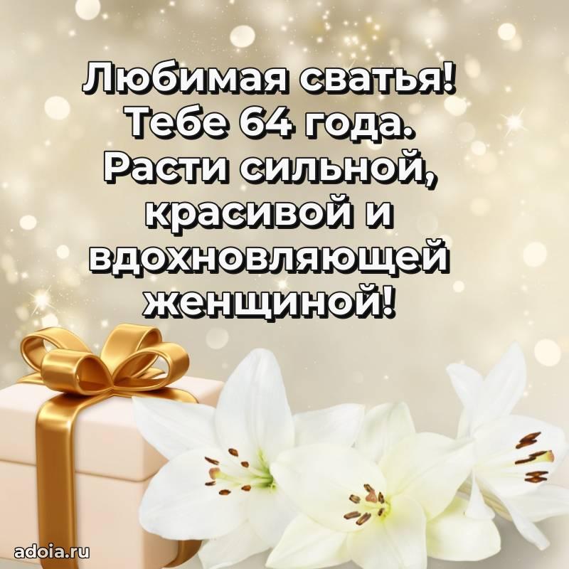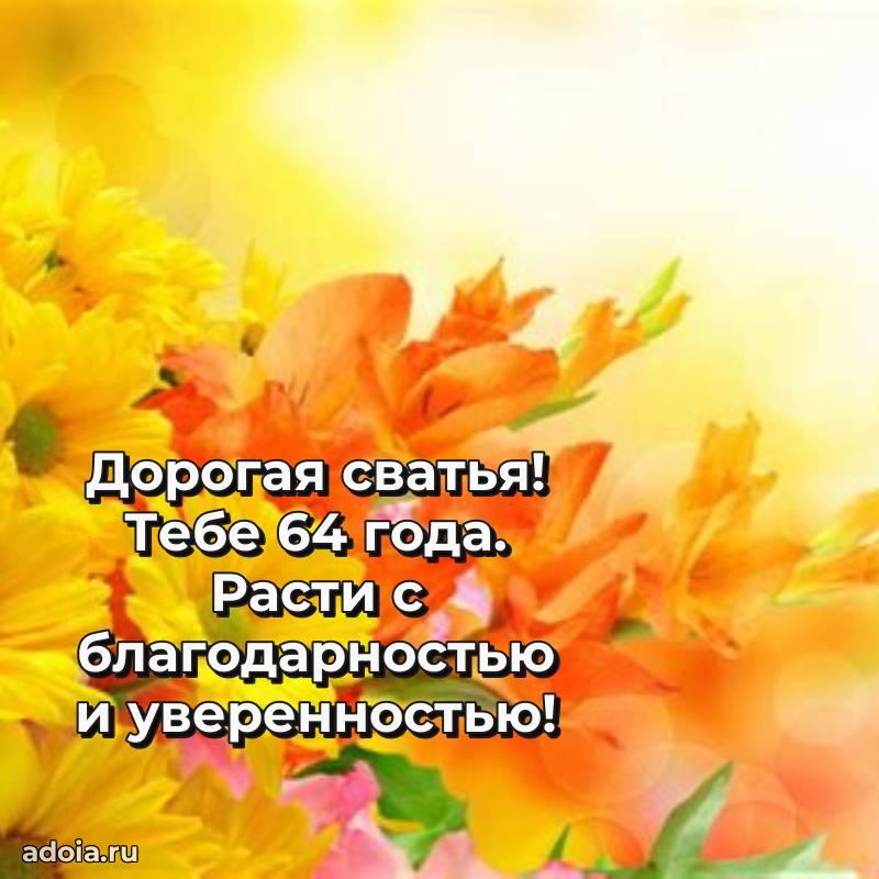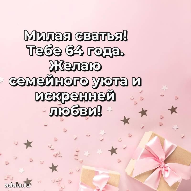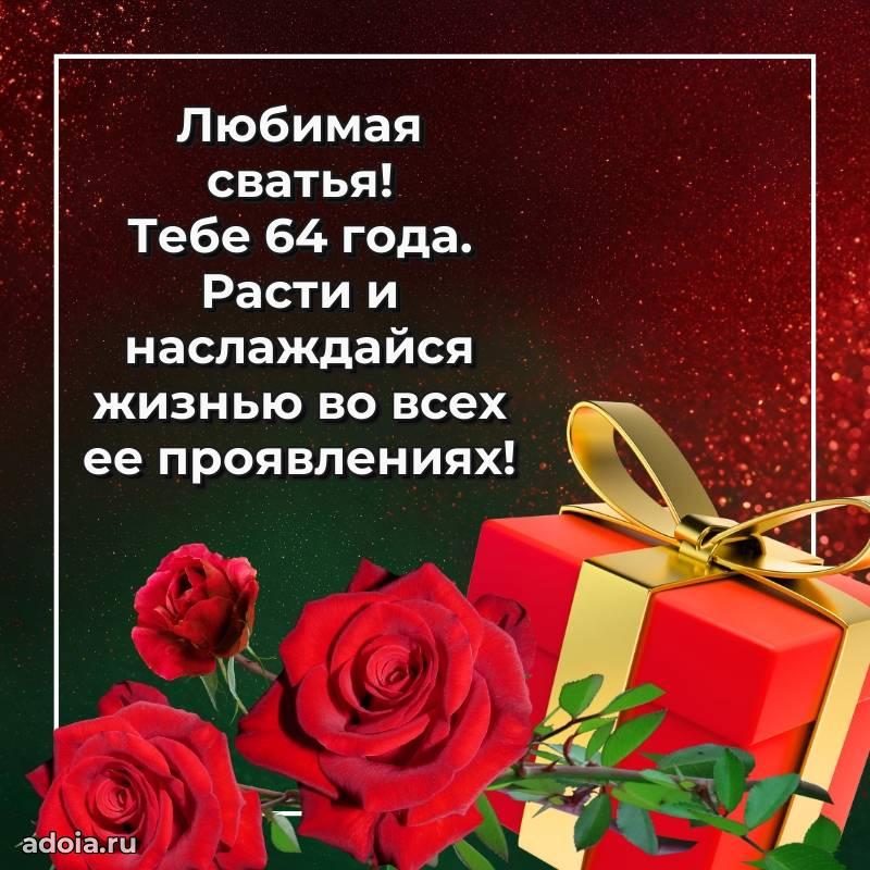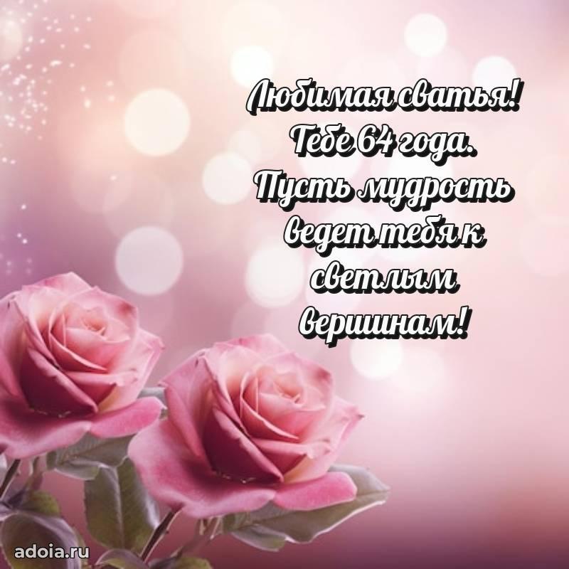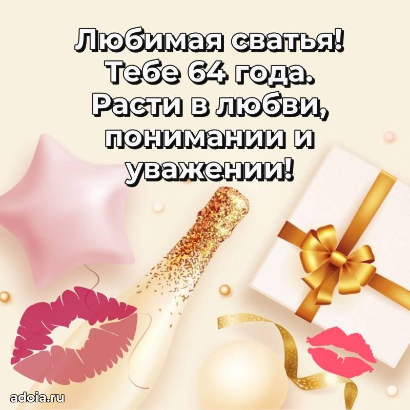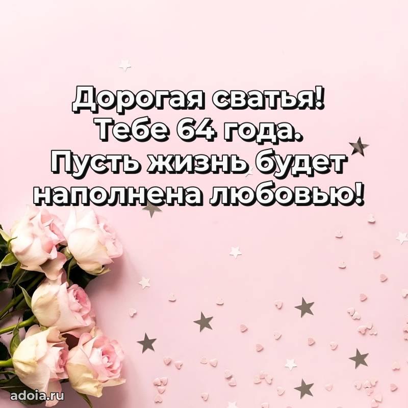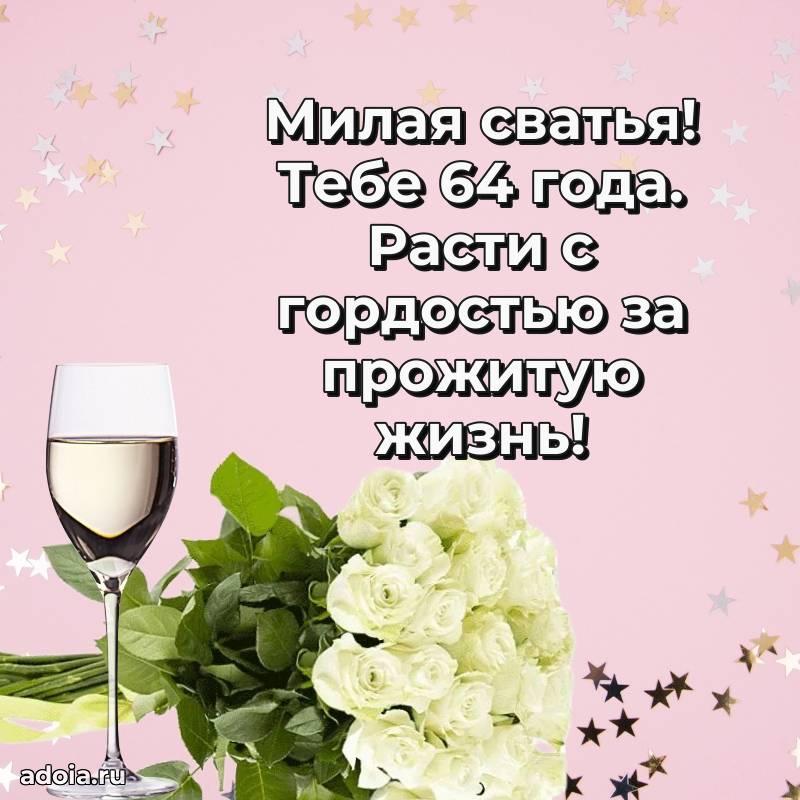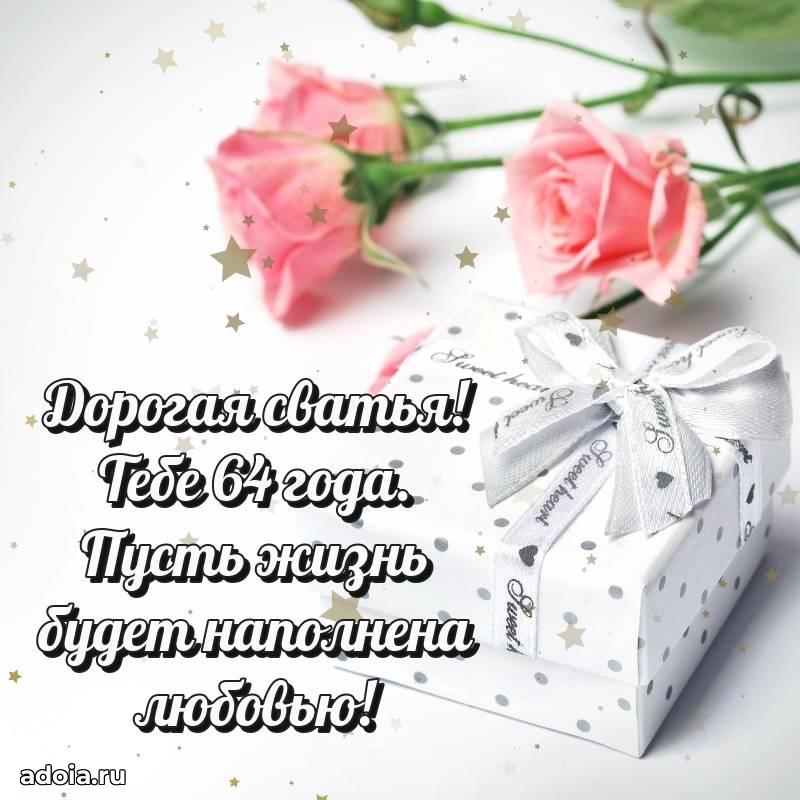 В поисках красивых и современных открыток? Вы попали по адресу! Здесь вы найдете картинки с днем рождения Сватье на 64 года! Все картинки в высоком качестве, которые можно скачать или отправить через WhatsApp бесплатно. Также вы найдете много прикольных и мерцающих гифок и анимаций, которые поднимут настроение! Все открытки содержат поздравления в стихах и прозе.