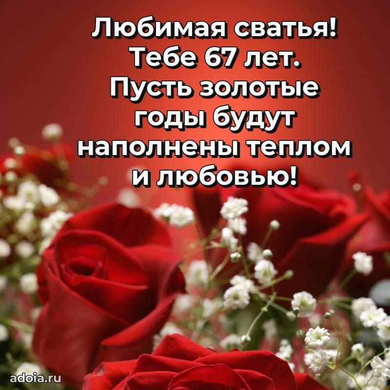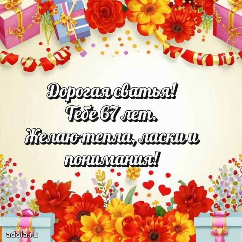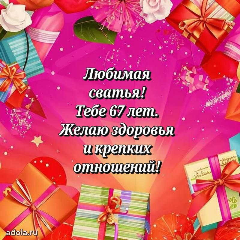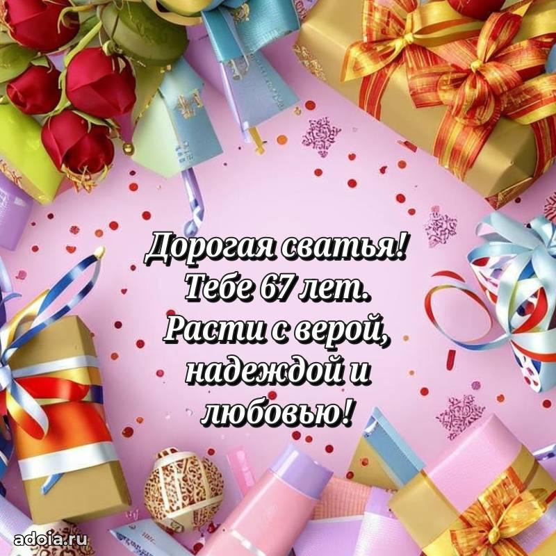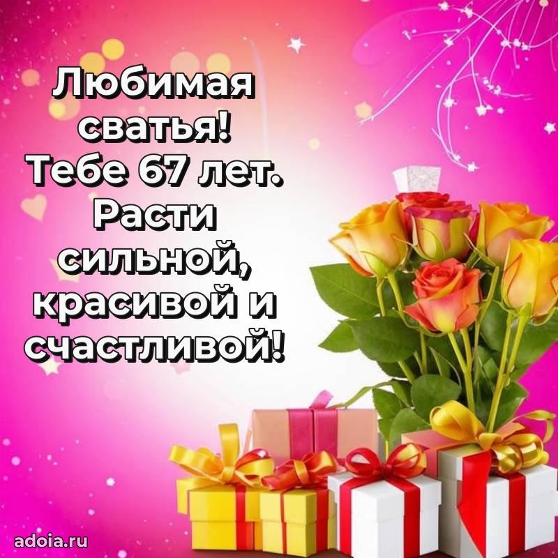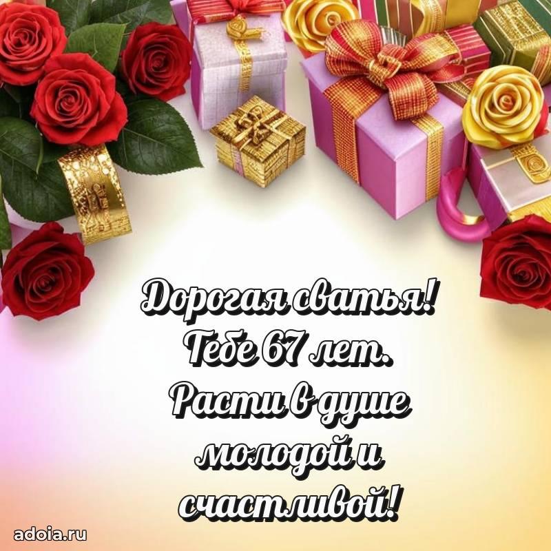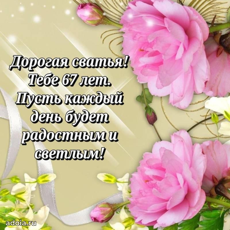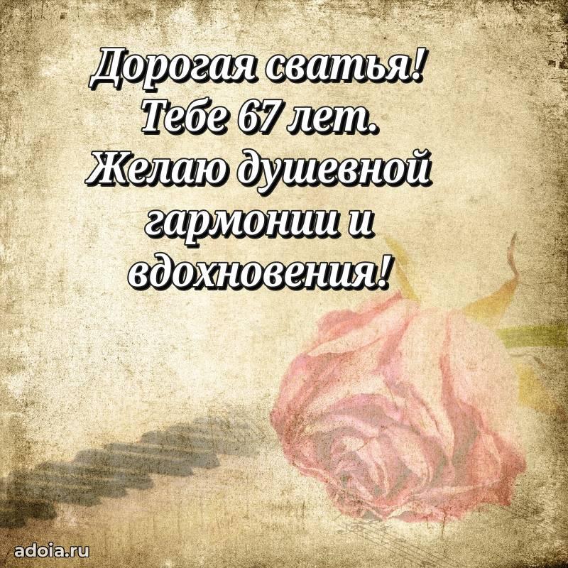 В поисках красивых и современных открыток? Вы попали по адресу! Здесь вы найдете картинки с днем рождения Сватье на 67 лет! Все картинки в высоком качестве, которые можно скачать или отправить через WhatsApp бесплатно. Также вы найдете много прикольных и мерцающих гифок и анимаций, которые поднимут настроение! Все открытки содержат поздравления в стихах и прозе.